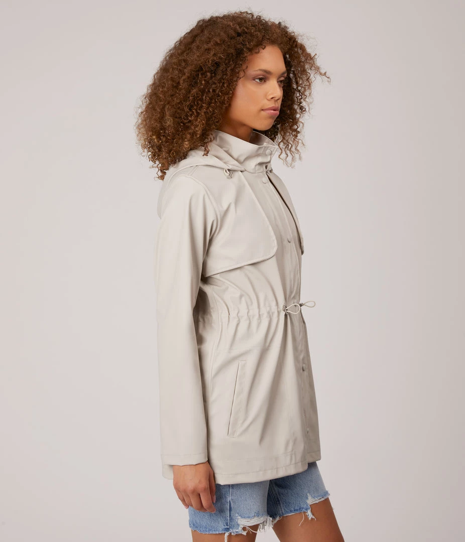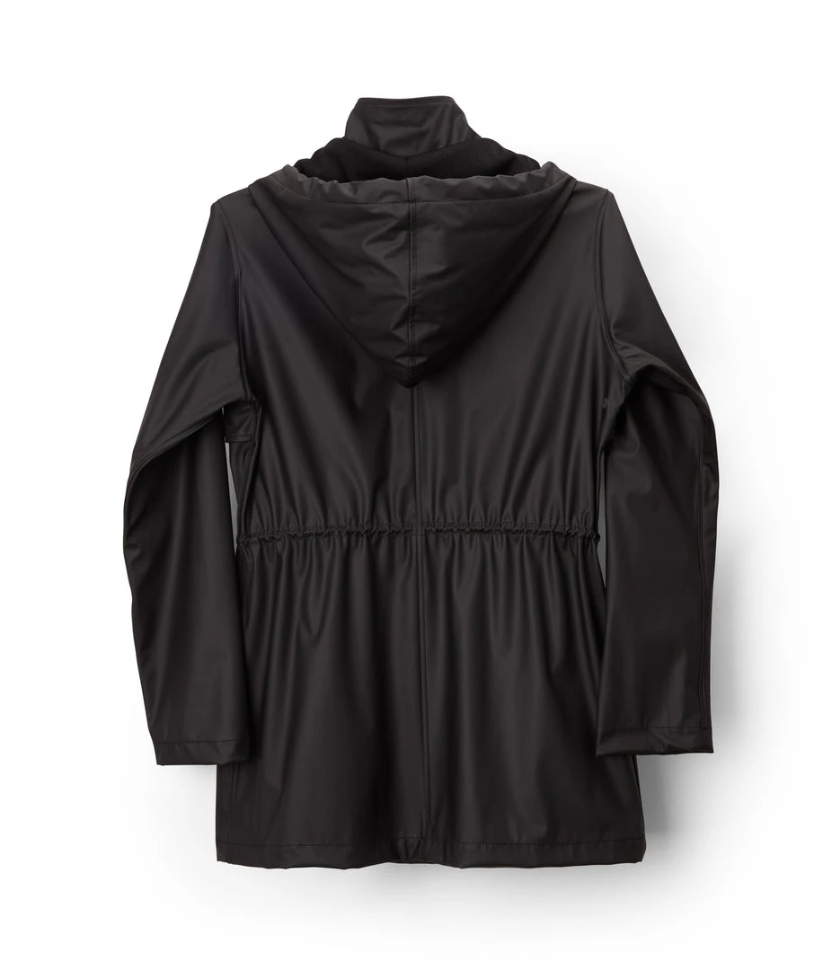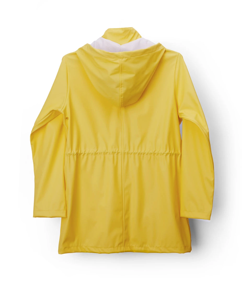 Waterproof jacket with snap front closure, drawstring waist detail, non-removable hood with drawstring detail, storm flap front, welt pockets, and ventilation holes at front and back armhole.