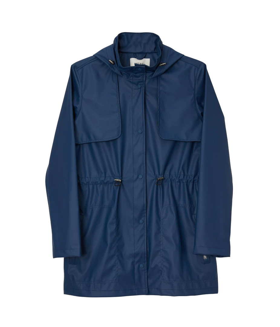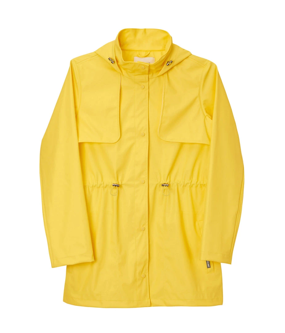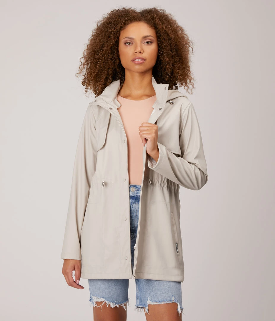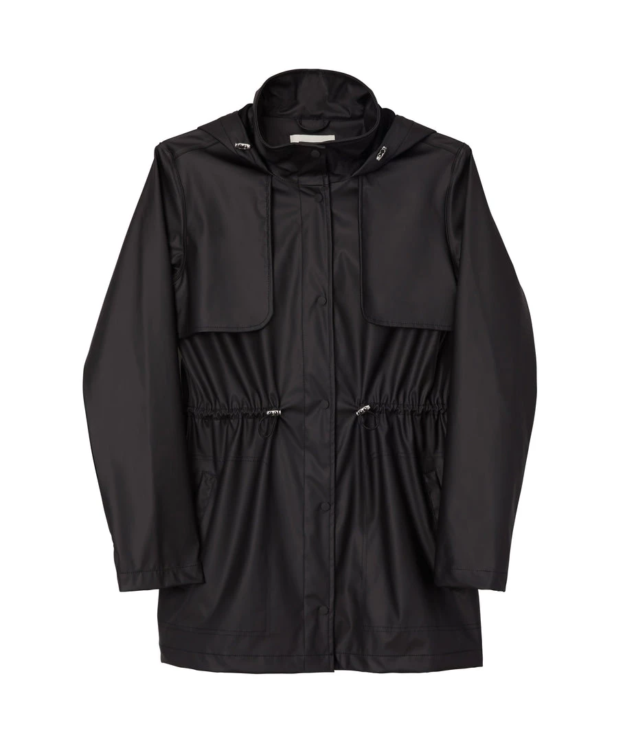 Waterproof jacket with snap front closure, drawstring waist detail, non-removable hood with drawstring detail, storm flap front, welt pockets, and ventilation holes at front and back armhole.
