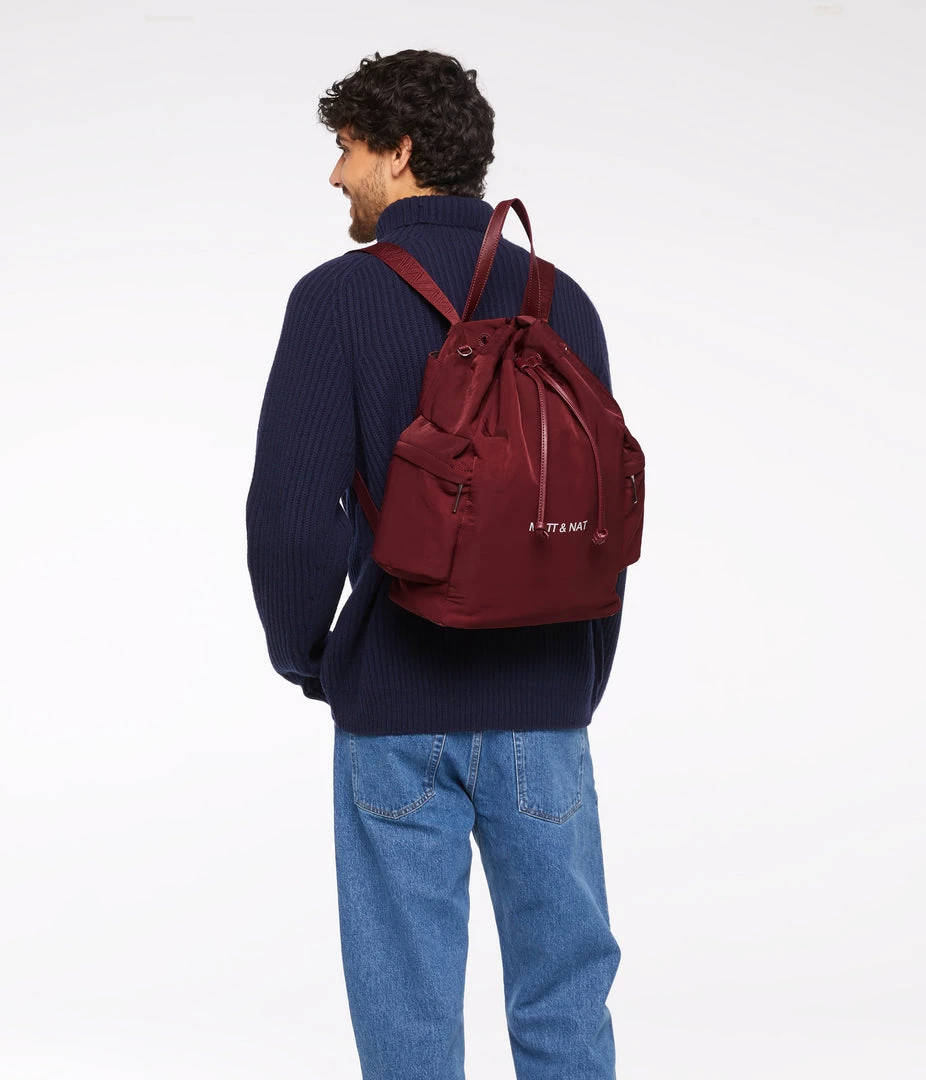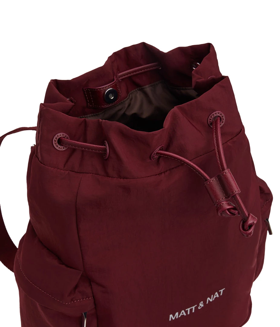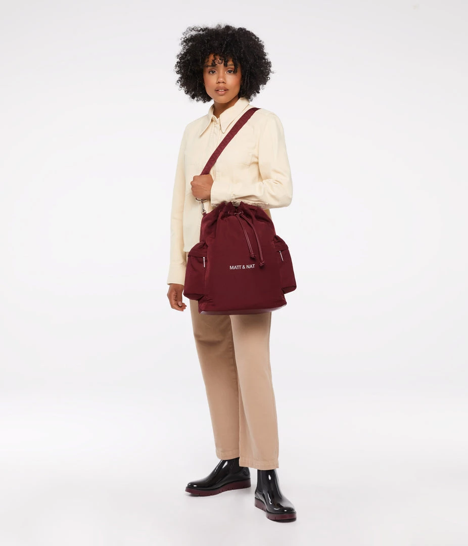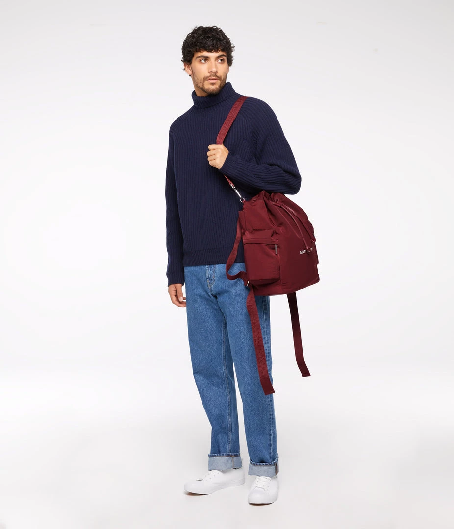 Diaper drawstring bag that can be worn as a backpack, on the shoulder using a shoulder strap, or handheld using the top handle. Back exterior slip pocket. functional zipper compartments on both sides for storing baby bottles, water bottles and other necessities.
