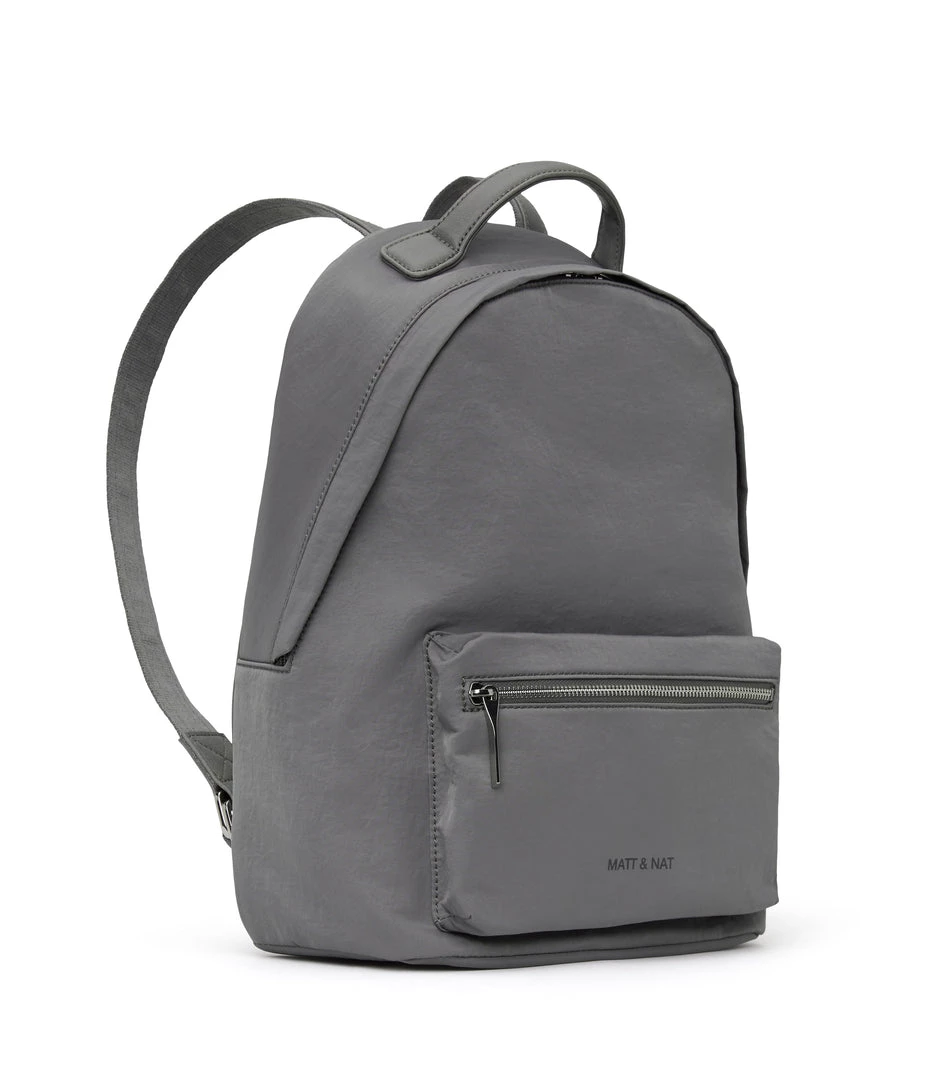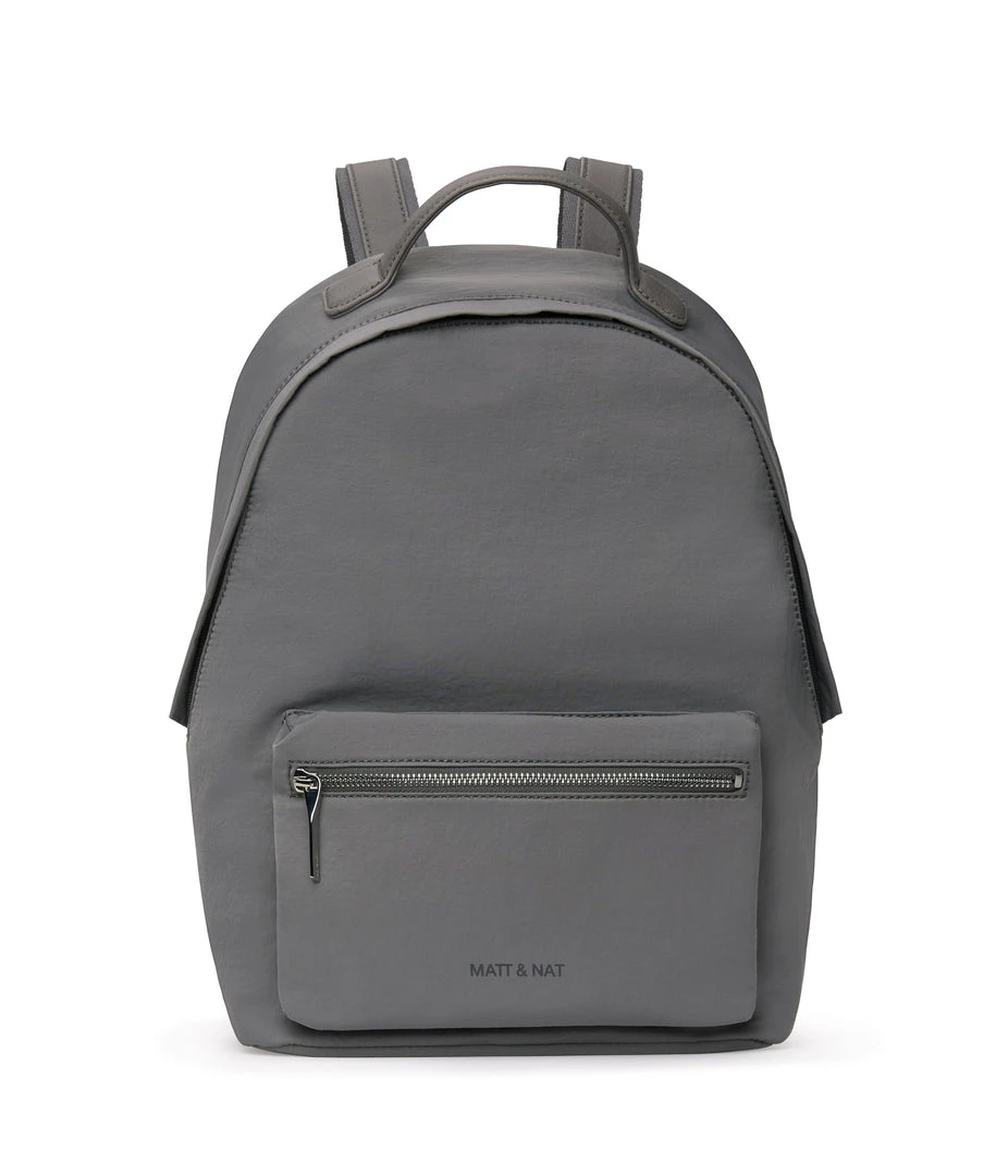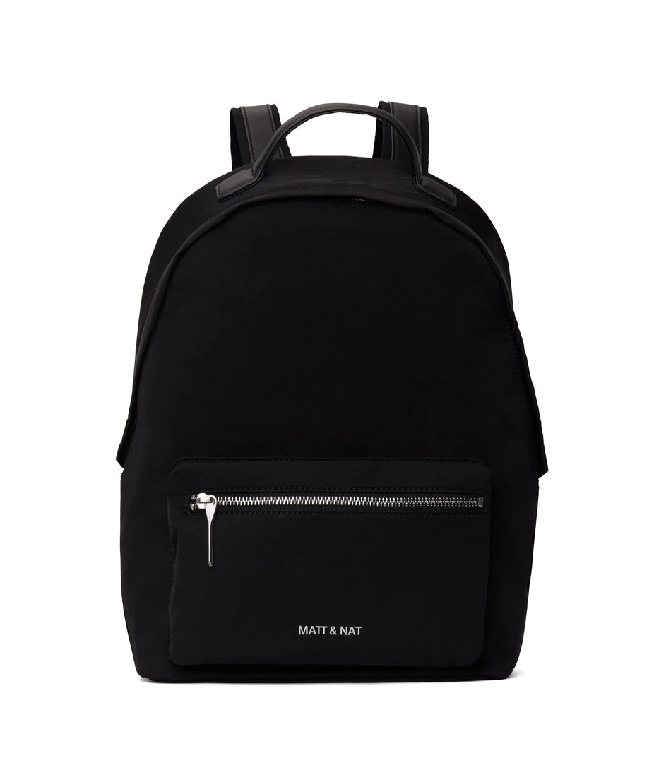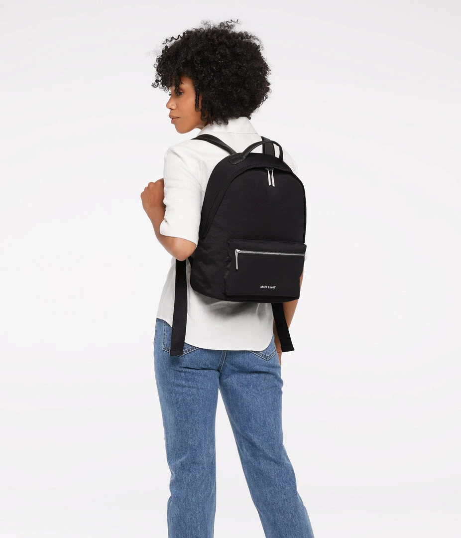 Backpack with adjustable straps and main zipper closure. Front zipper pocket. Small zipper pocket on the back for security. Fits a 13” laptop.