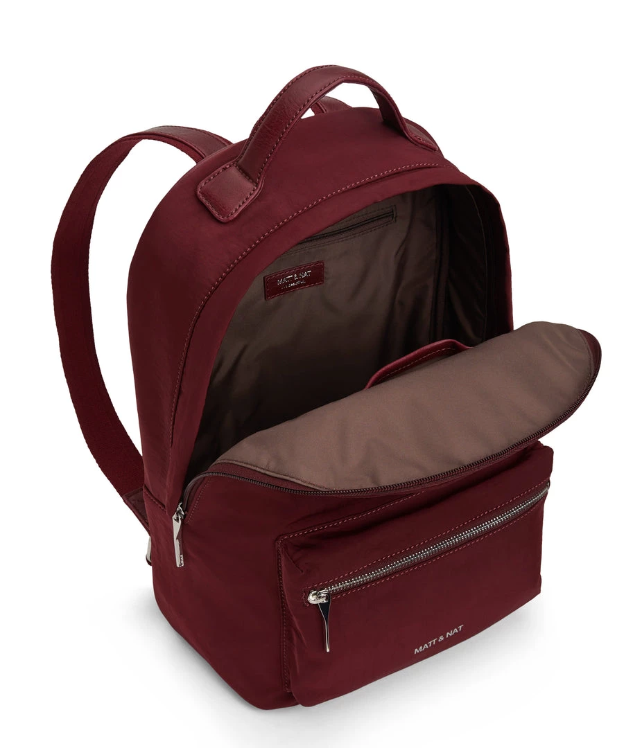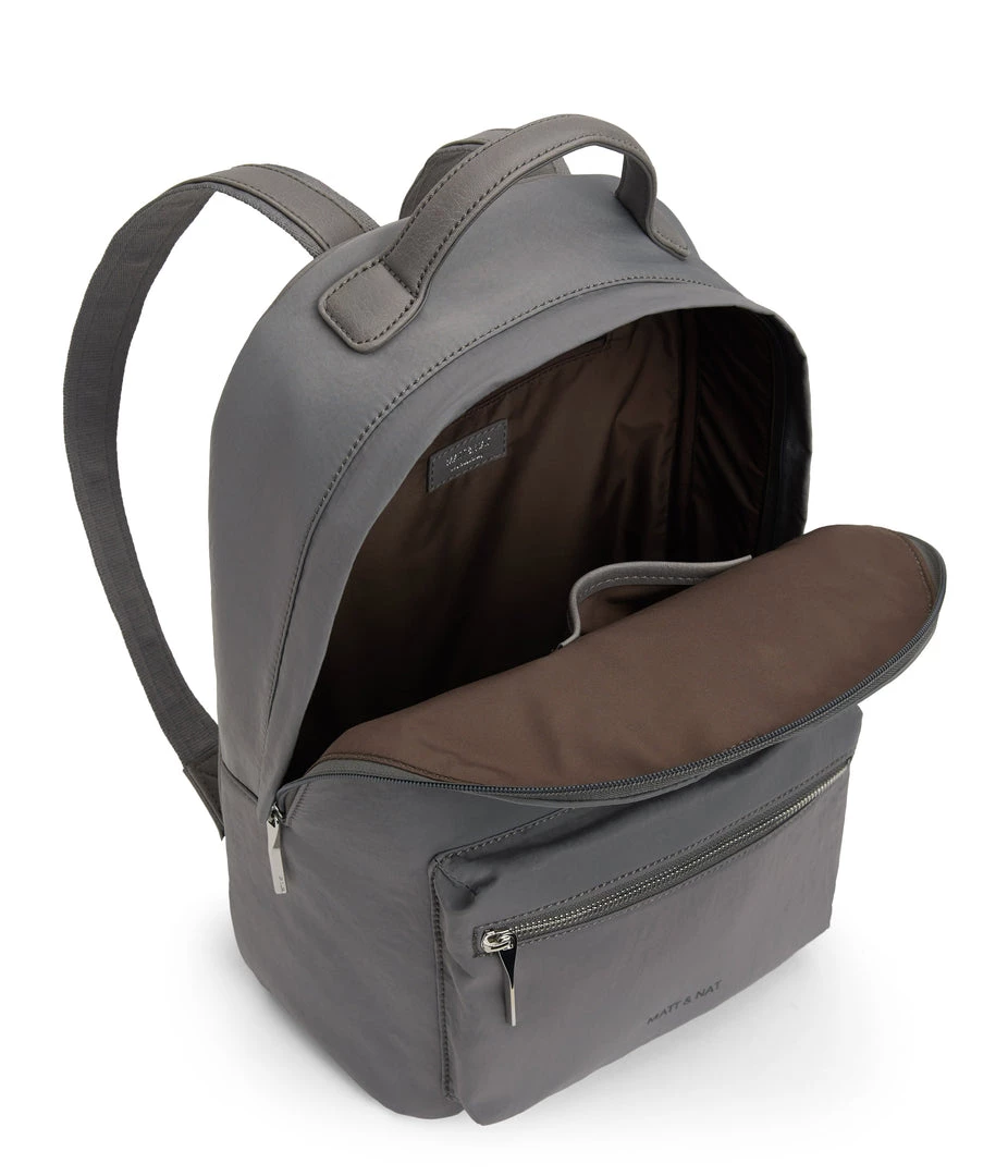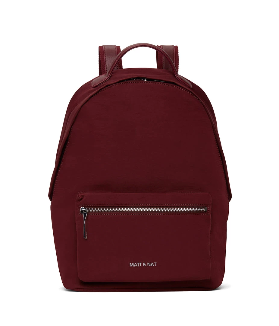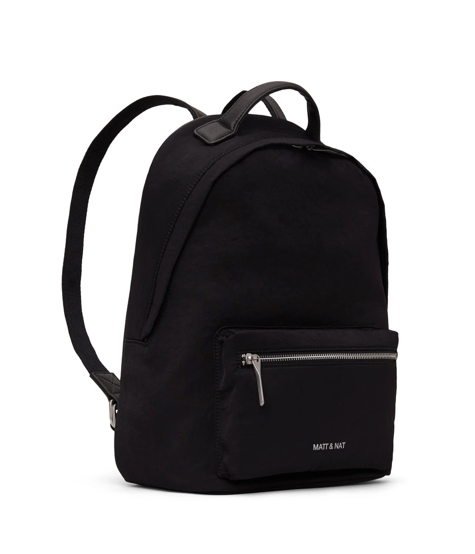 Backpack with adjustable straps and main zipper closure. Front zipper pocket. Small zipper pocket on the back for security. Fits a 13” laptop.