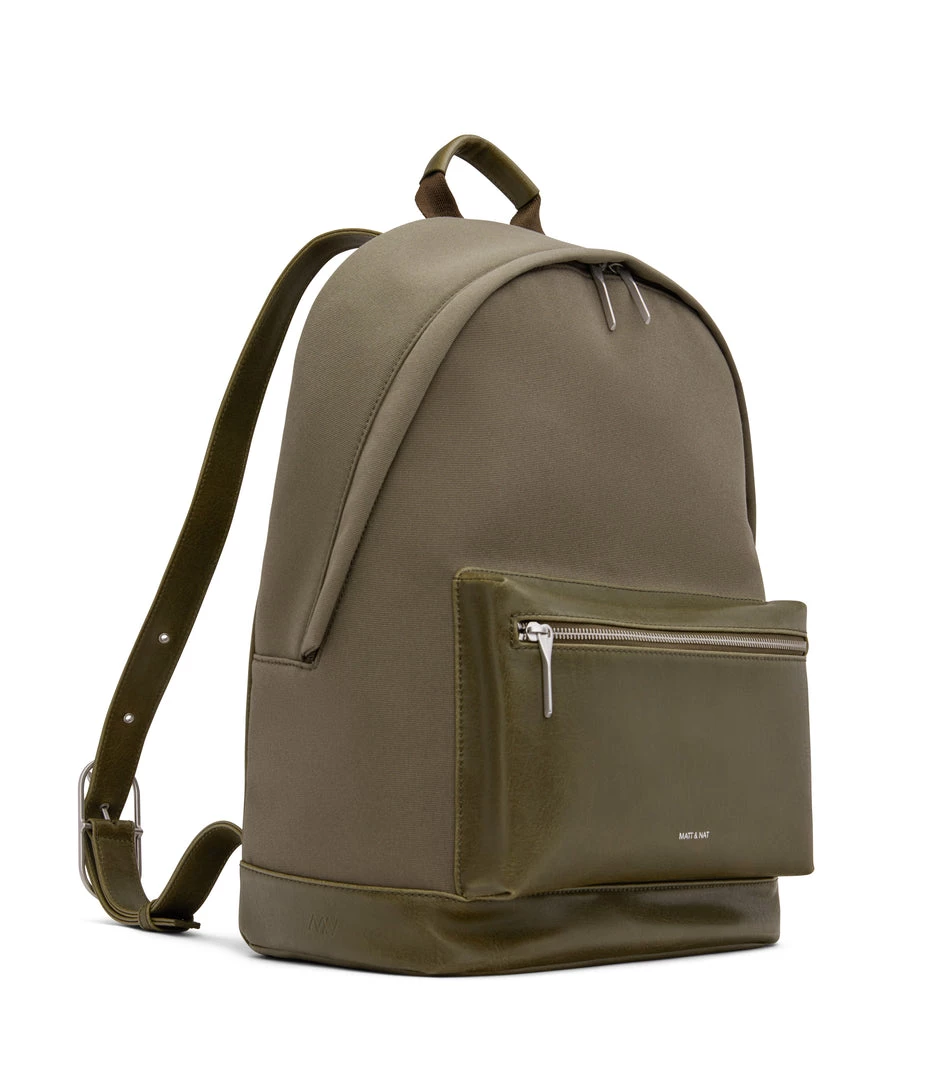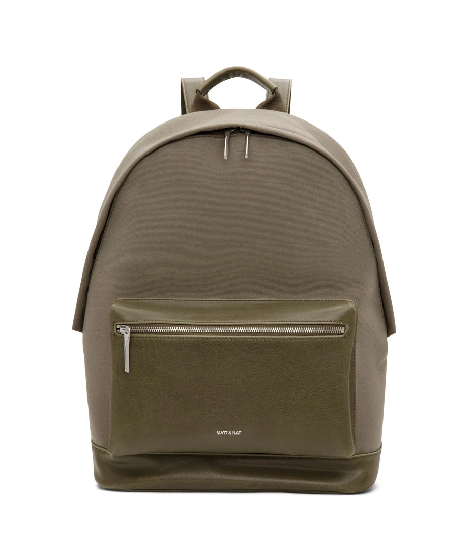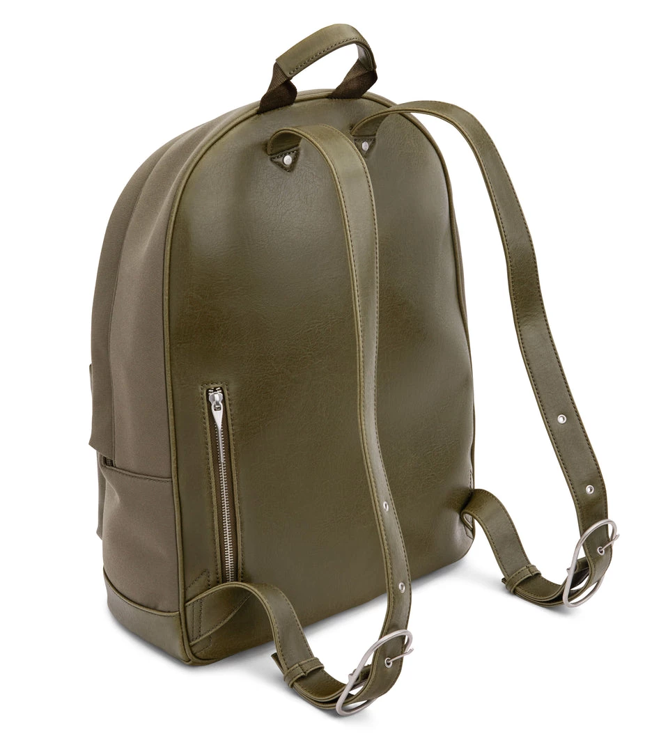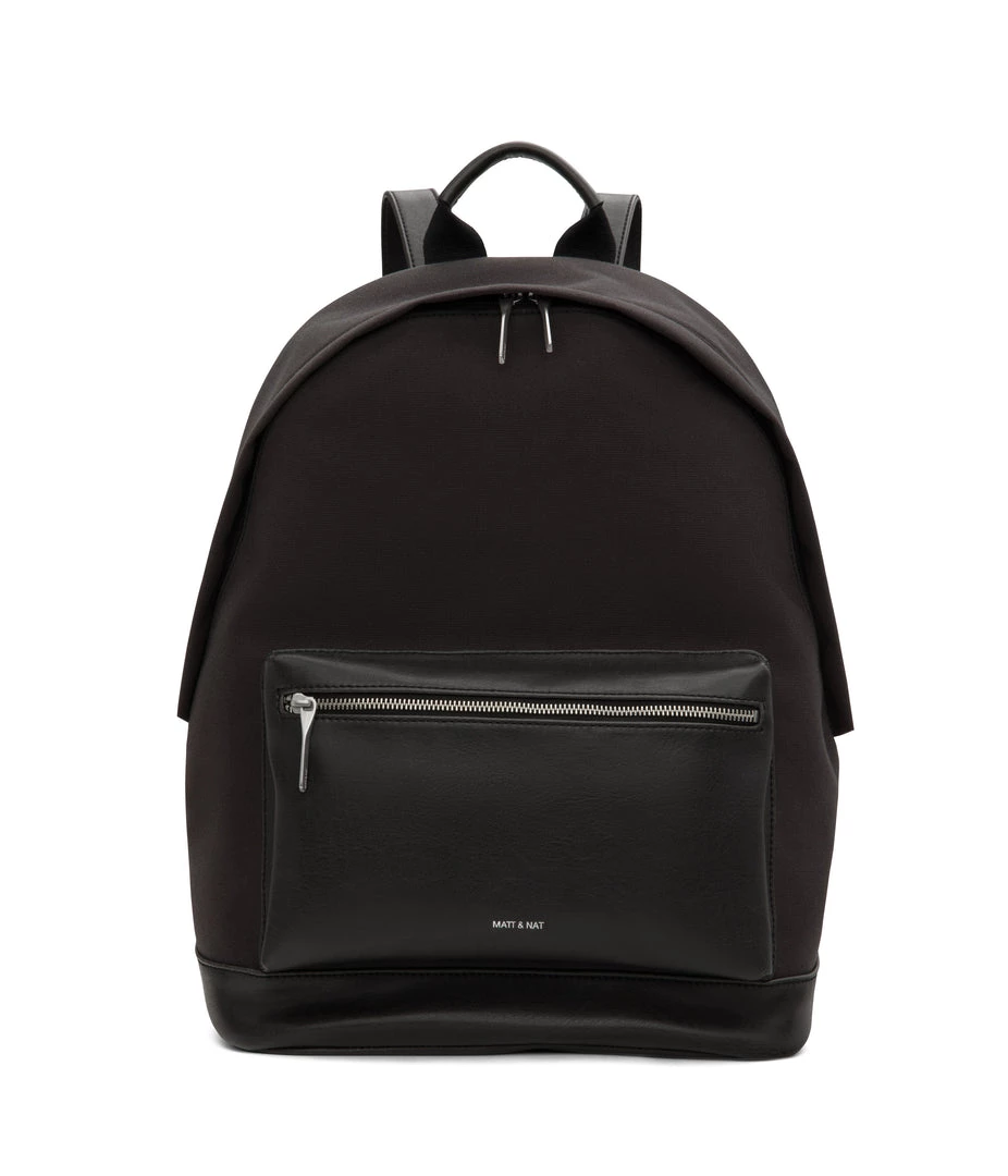 Backpack with adjustable shoulder straps and top main zipper closure. Front zipper pocket. Zipper pocket on back body. Fits a 15” laptop.