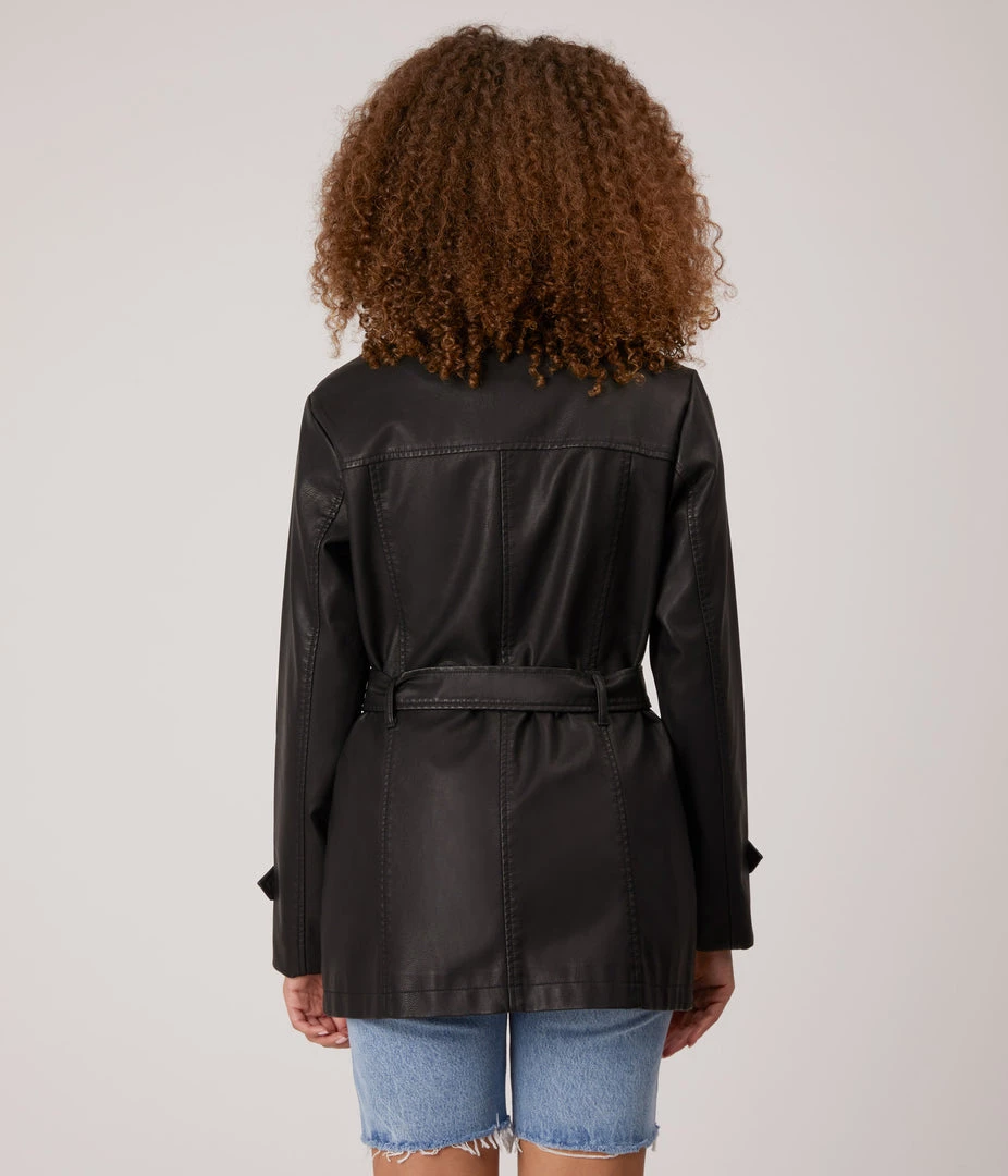 Long sleeve button front PU jacket with self-tie belt, large welt pockets, princess seams and tab detail at sleeve cuffs.