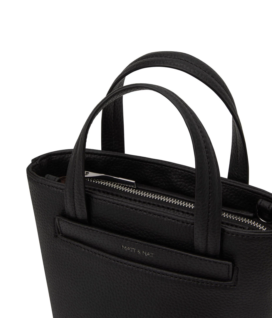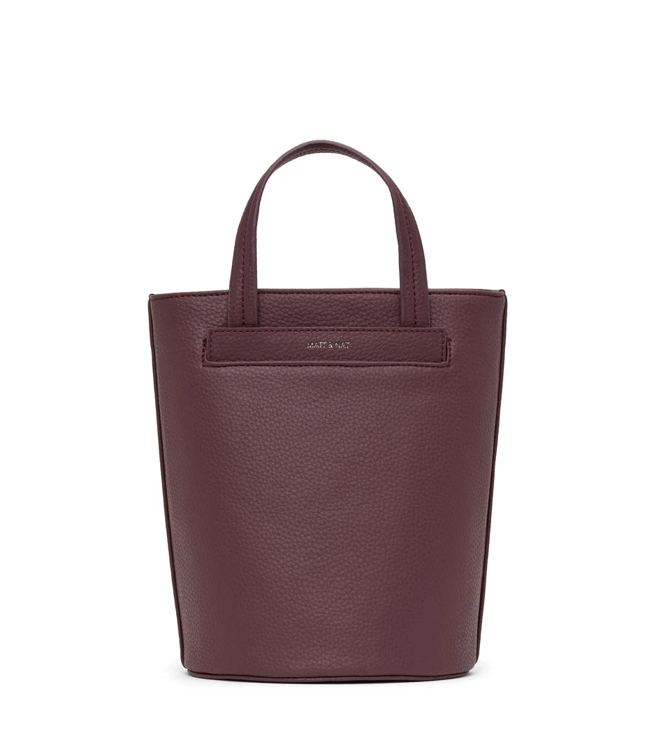 Bucket crossbody bag with zipper closure and exterior front slip pocket. Comes with a detachable and adjustable crossbody strap.