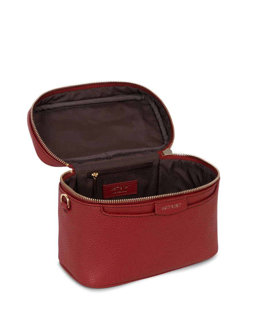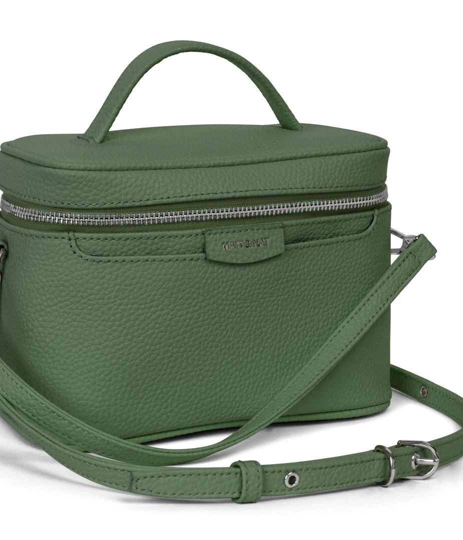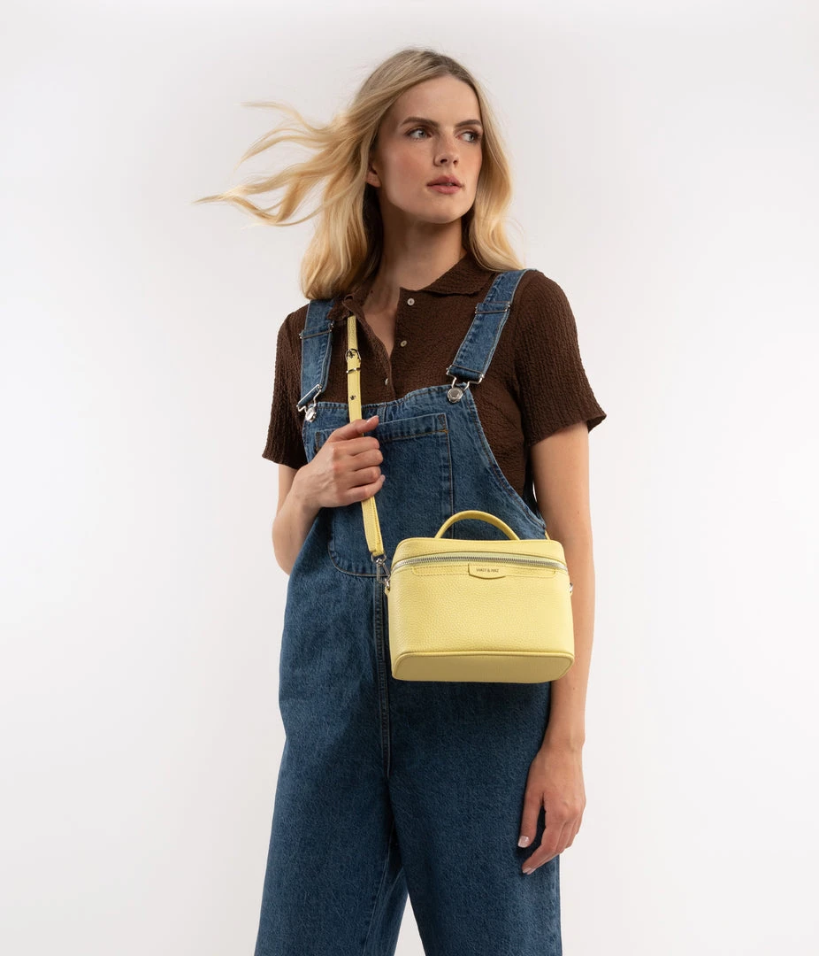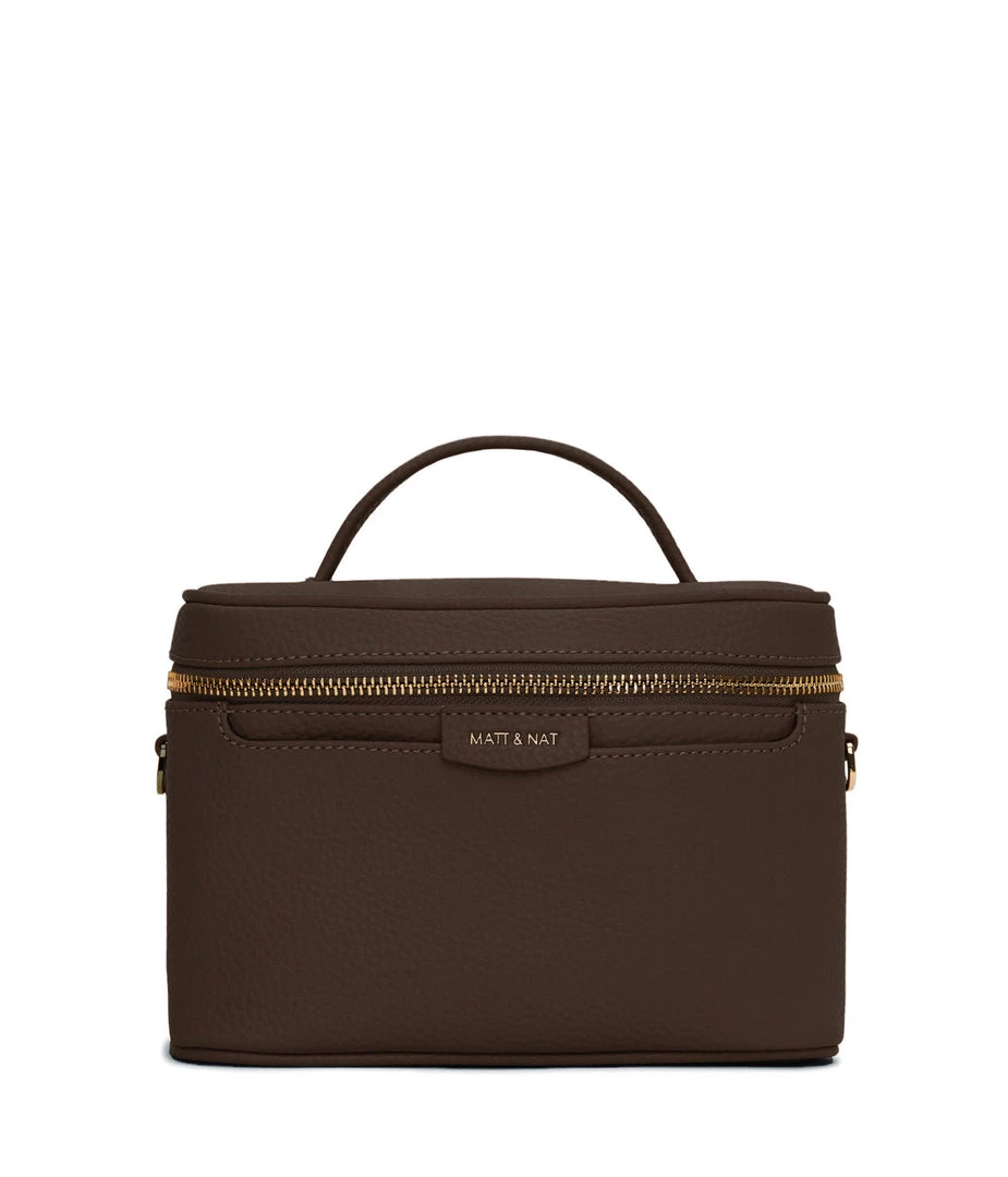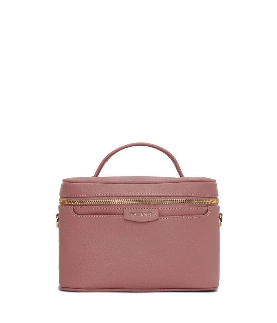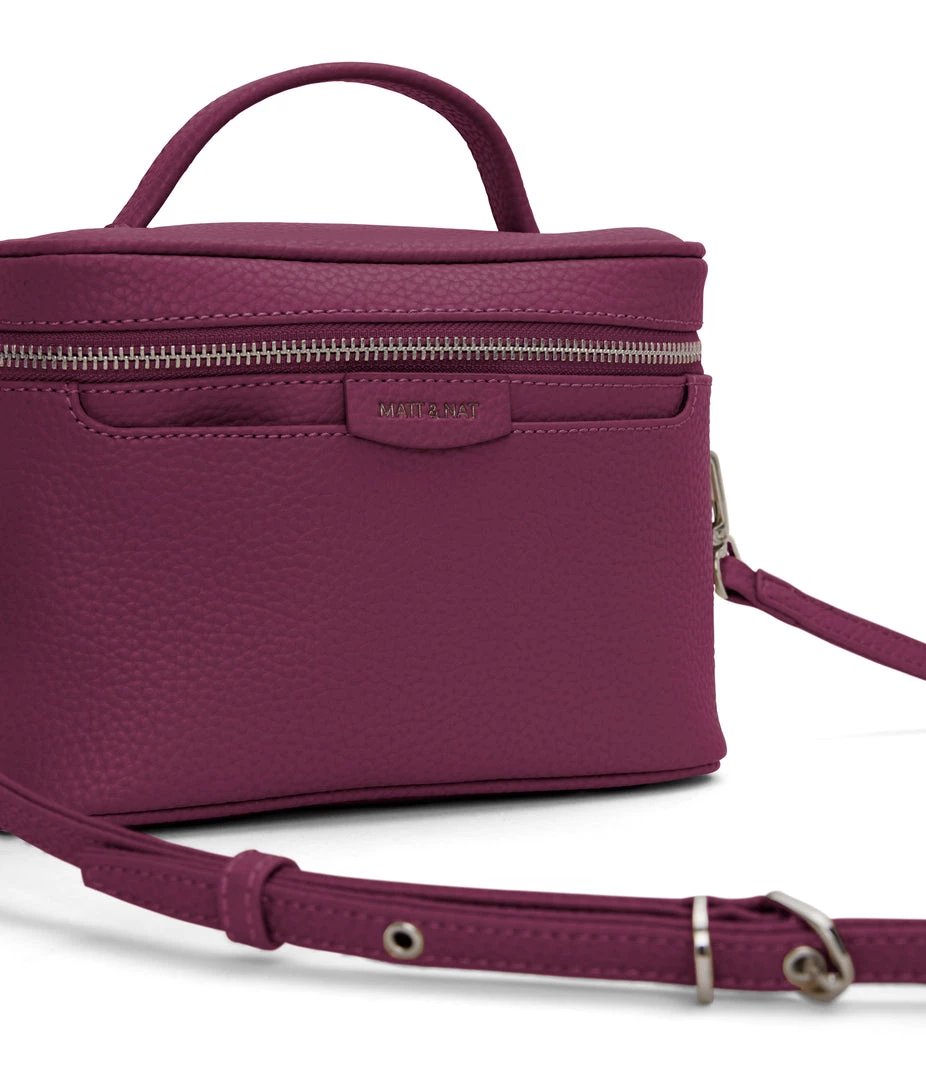 Vanity case crossbody bag with a top handle, slip pocket at front, and a detachable and adjustable strap.