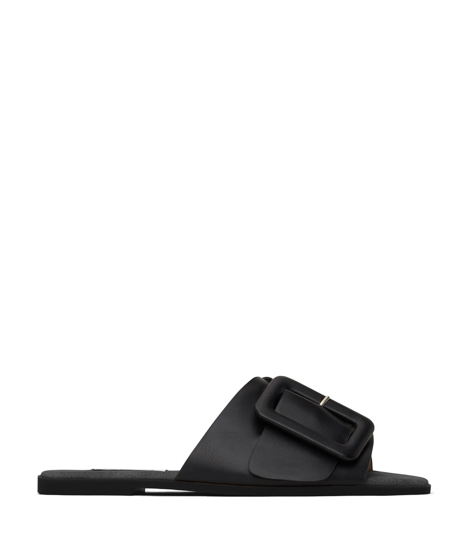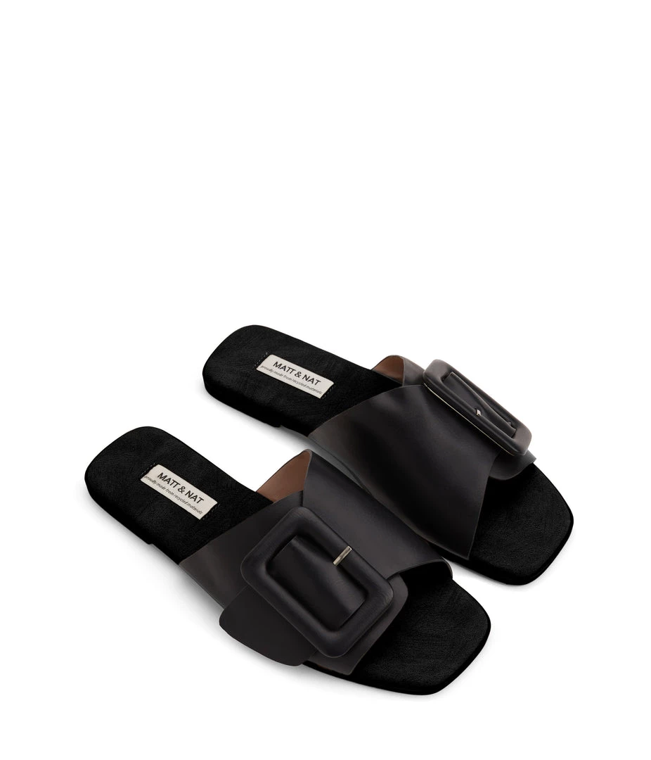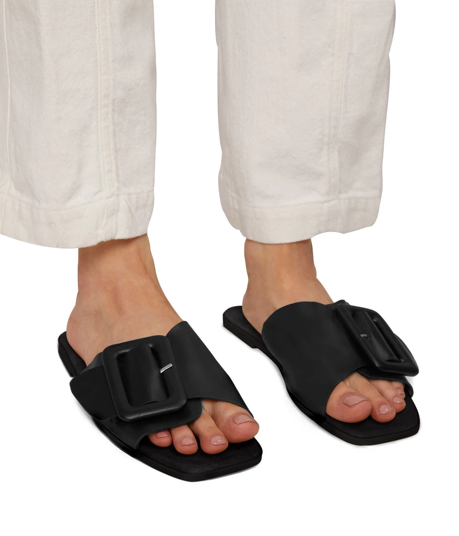 Women’s flat modern sandal with matching buckle detail. Made with recycled materials.