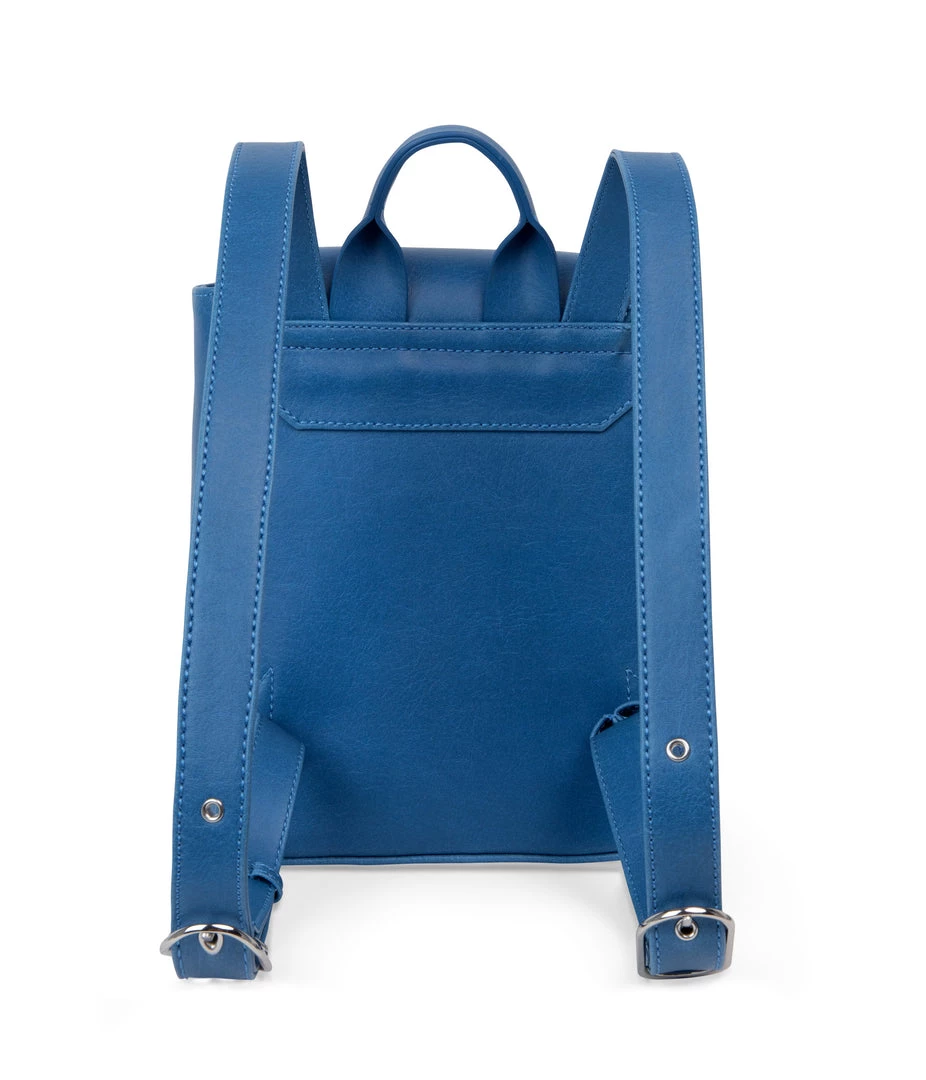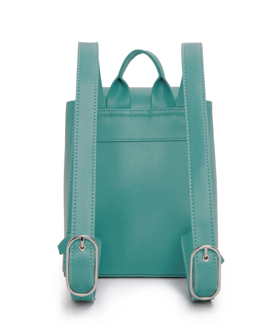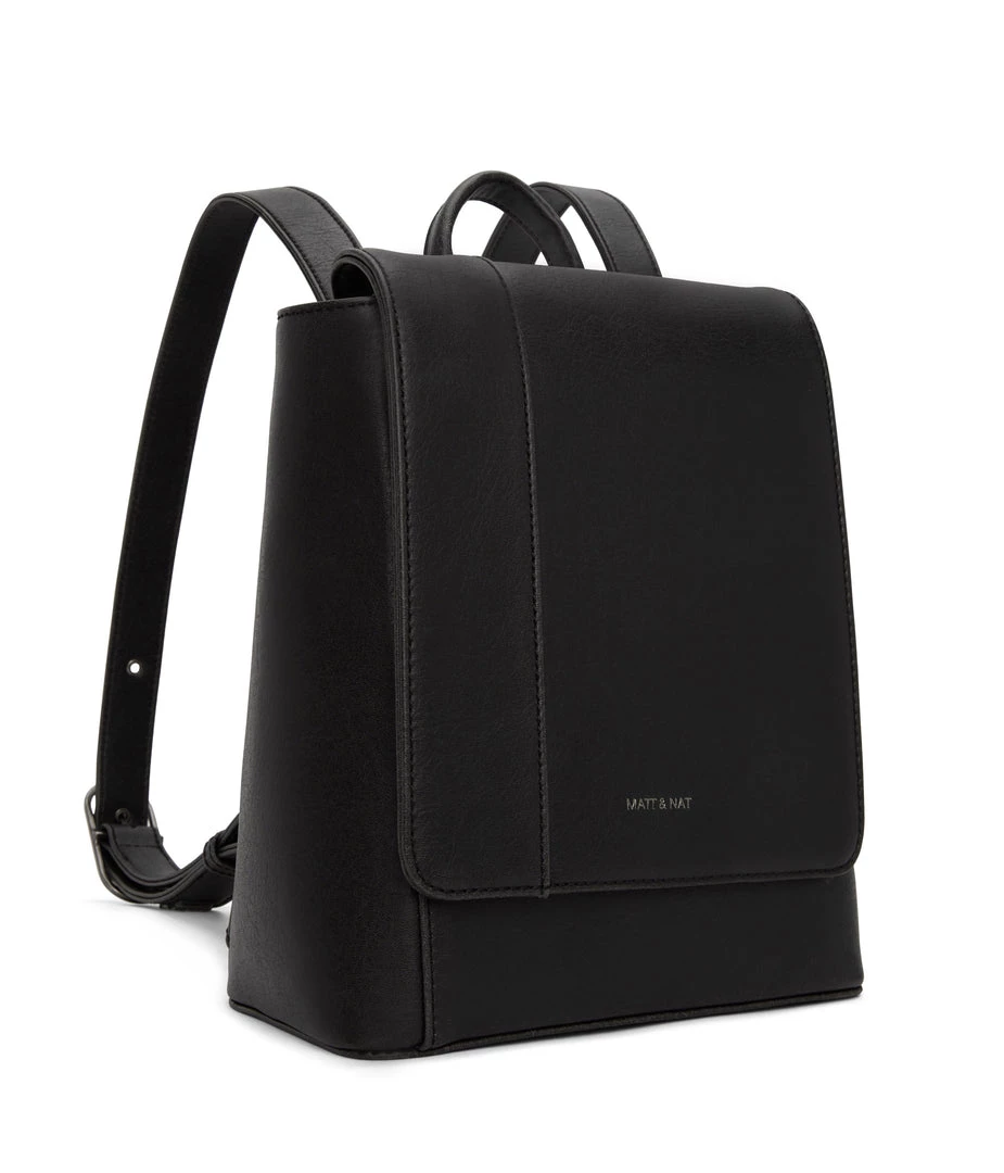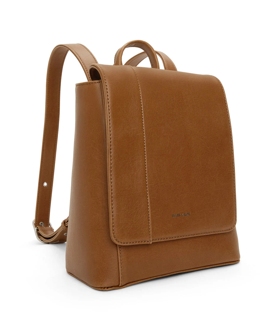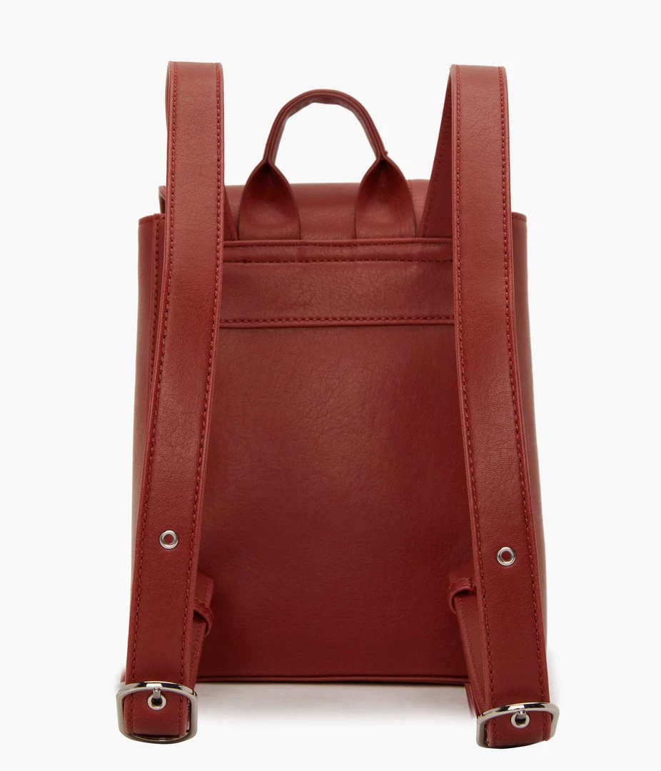 Small backpack with a top handle, flap with hidden magnetic snaps and zipper closure at interior top. Adjustable back straps.