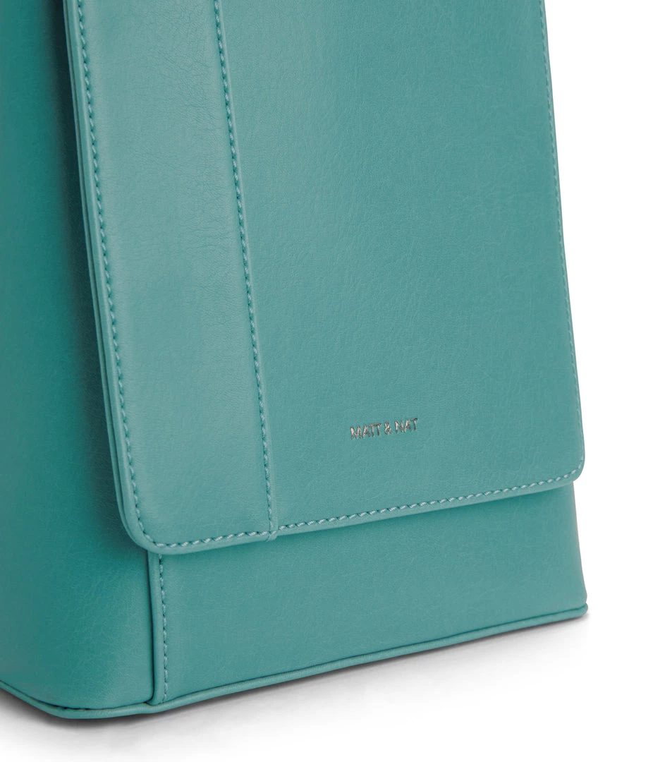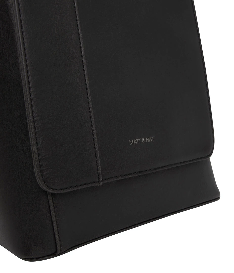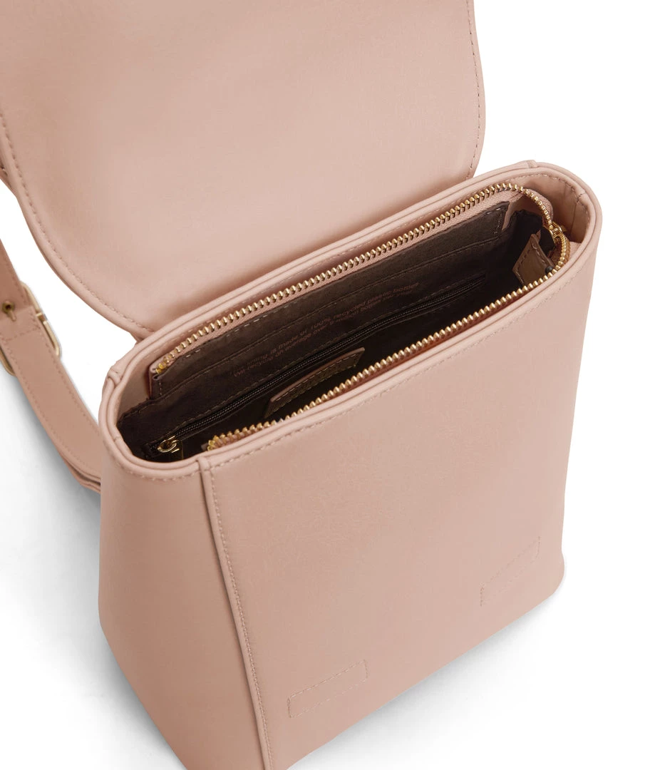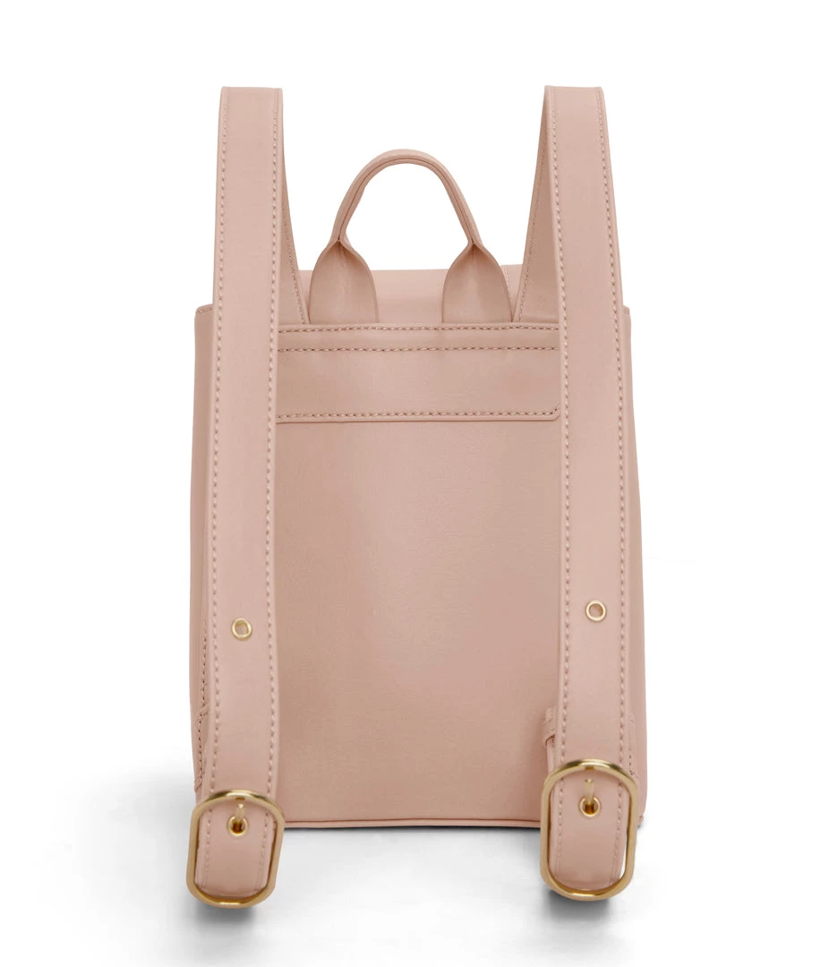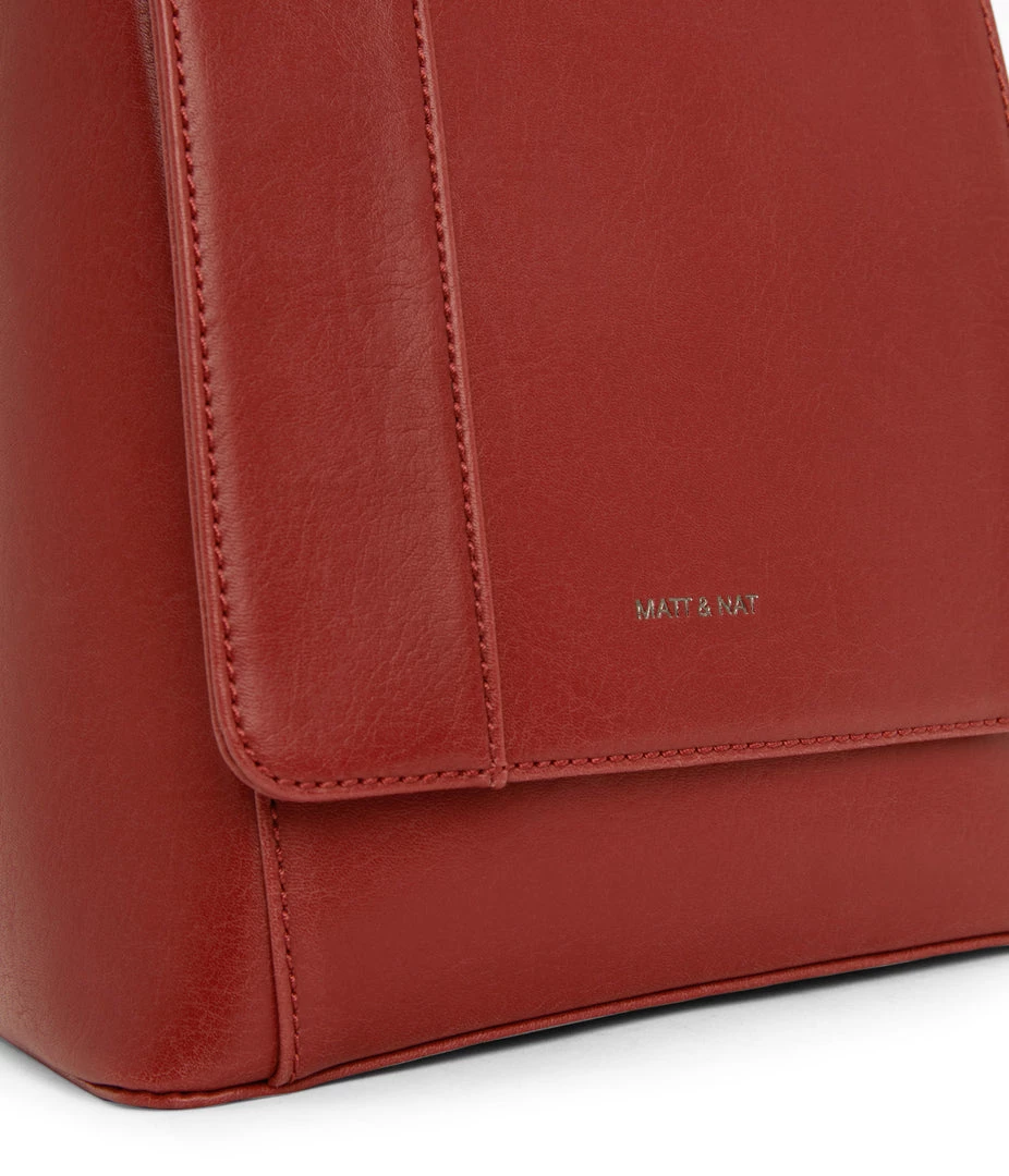 Small backpack with a top handle, flap with hidden magnetic snaps and zipper closure at interior top. Adjustable back straps.