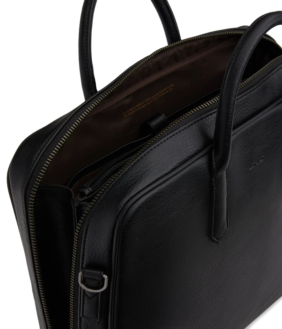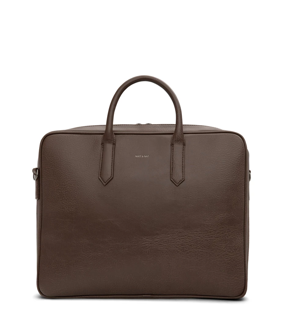 Briefcase with two-way metal zip closure that extends to bottom gusset. Tubular handles. Metal zip pocket on exterior back. Comes with a removable and adjustable crossbody strap with a standard shoulder patch. Fits a 15” laptop.