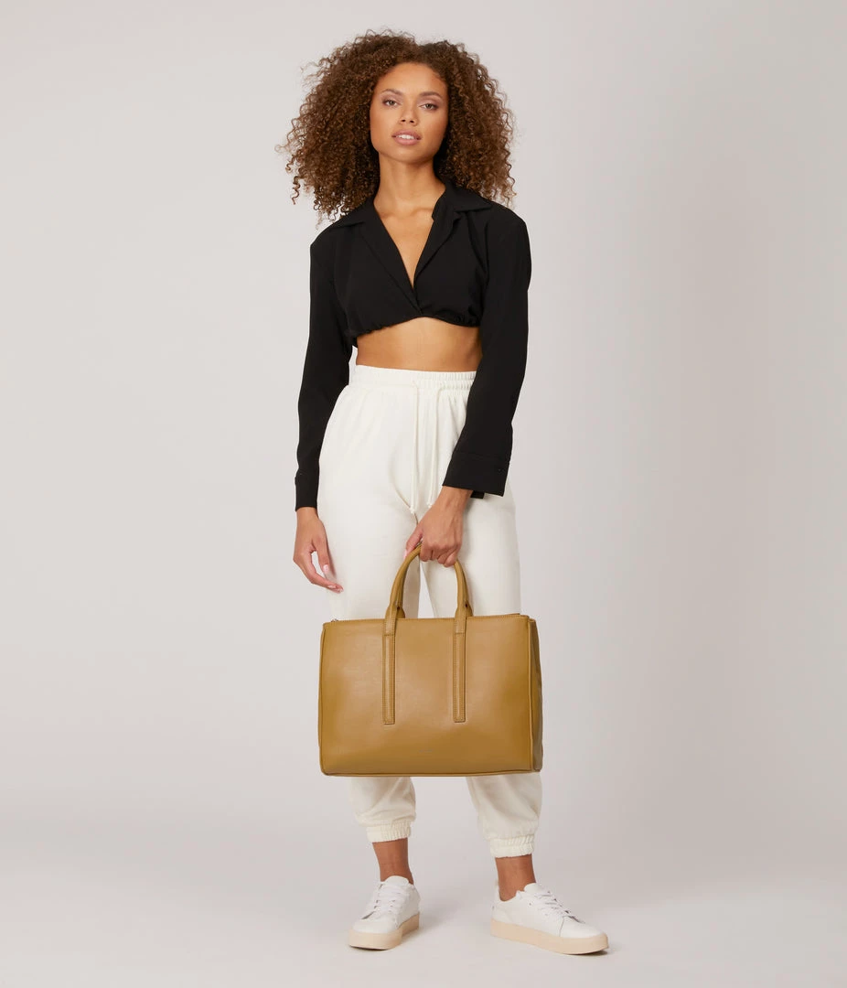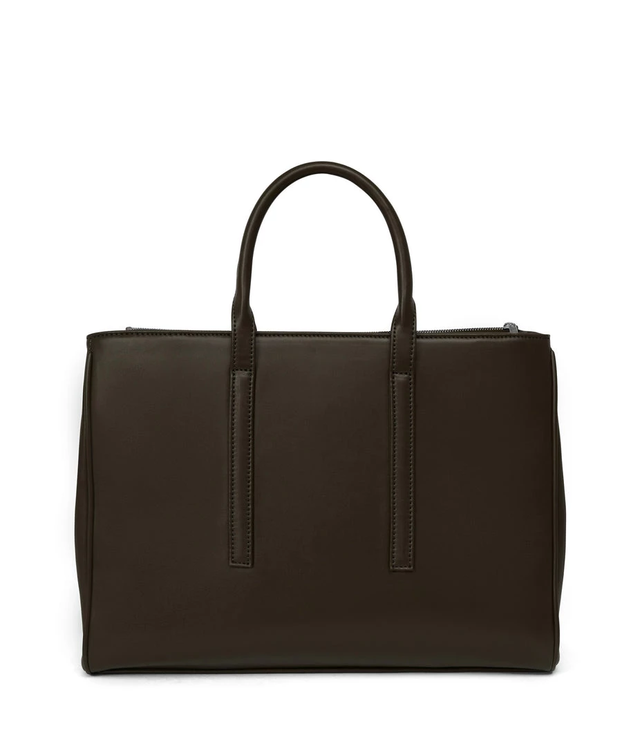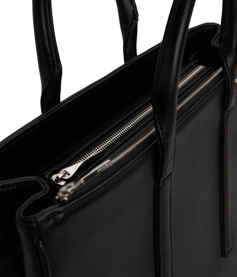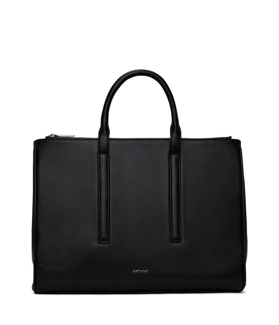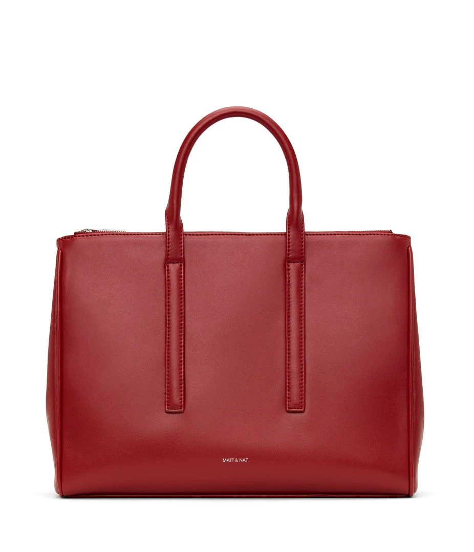Satchel with tubular handles, main compartment with a center divider and top zipper closure, and large front zip pocket. Comes with an adjustable and detachable crossbody strap. Fits a 13” laptop.