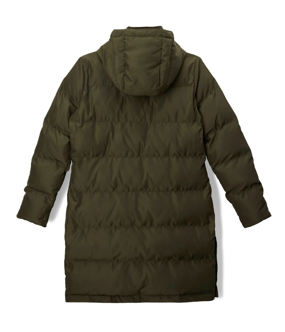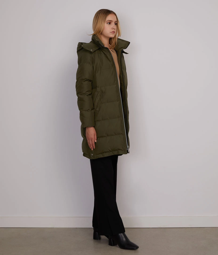 Long sleeve, knee-length quilted puffer jacket with removable hood, front zipper closure, wide full coverage collar, two welt pockets, and side functional snap detail at hem.