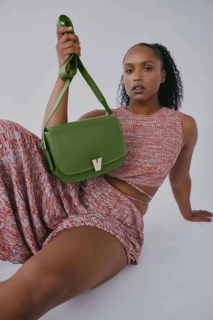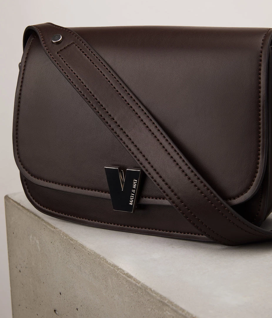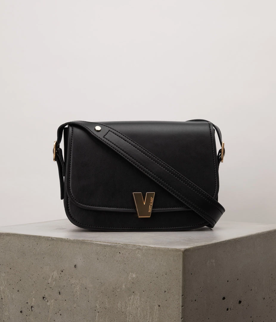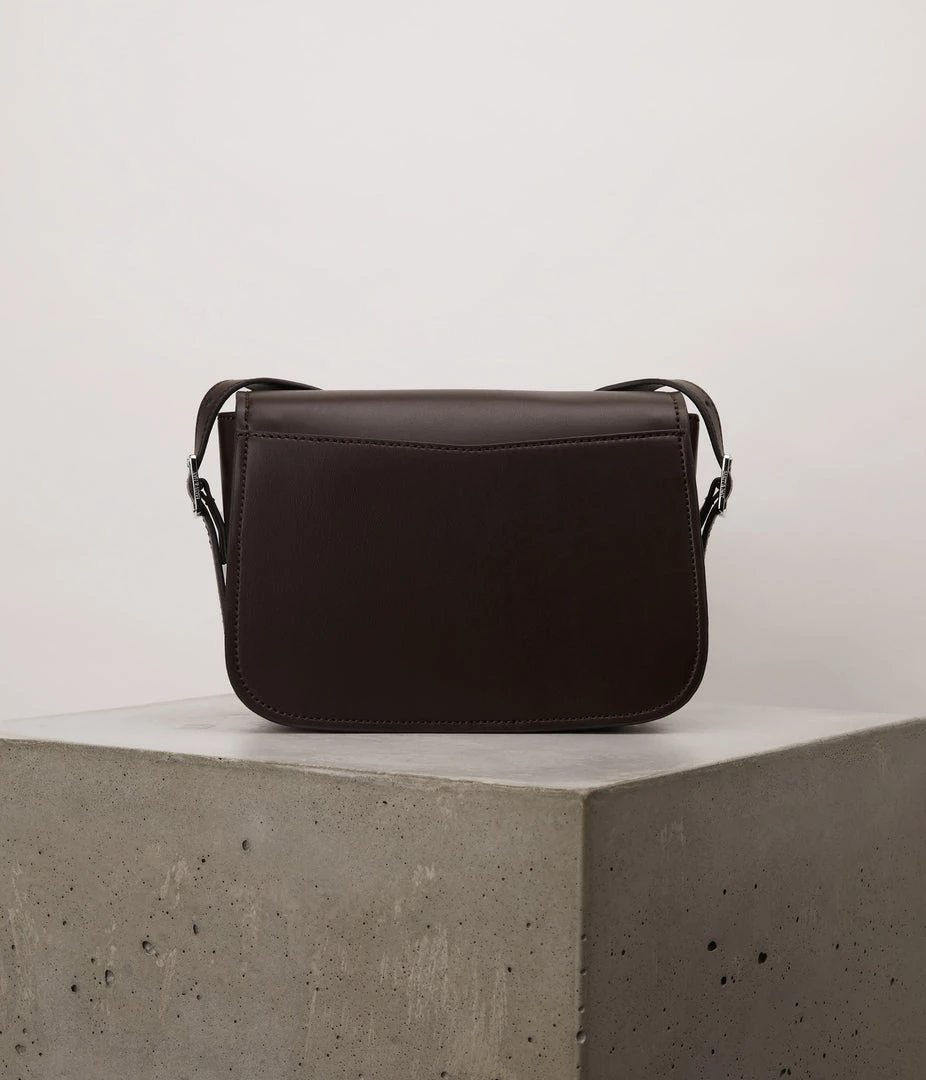 Crossbody bag with flap closure and flip-lock, exterior back slip pocket, and adjustable strap.