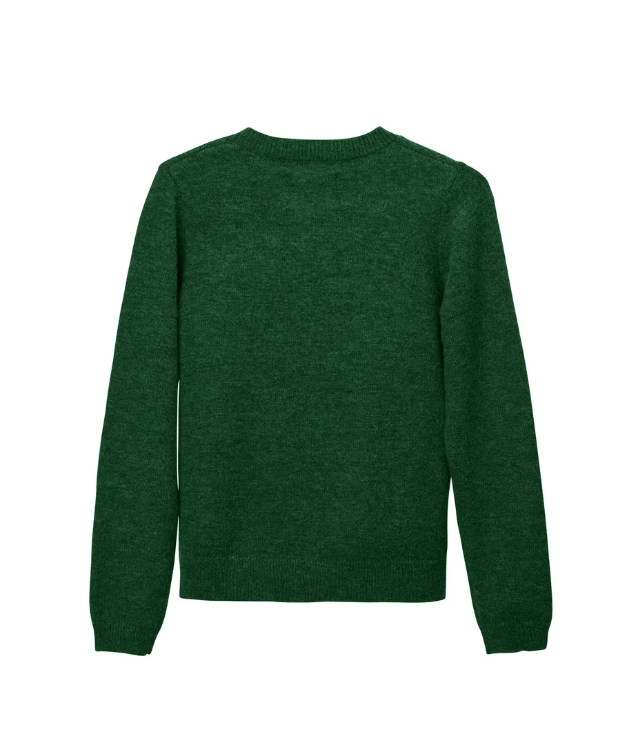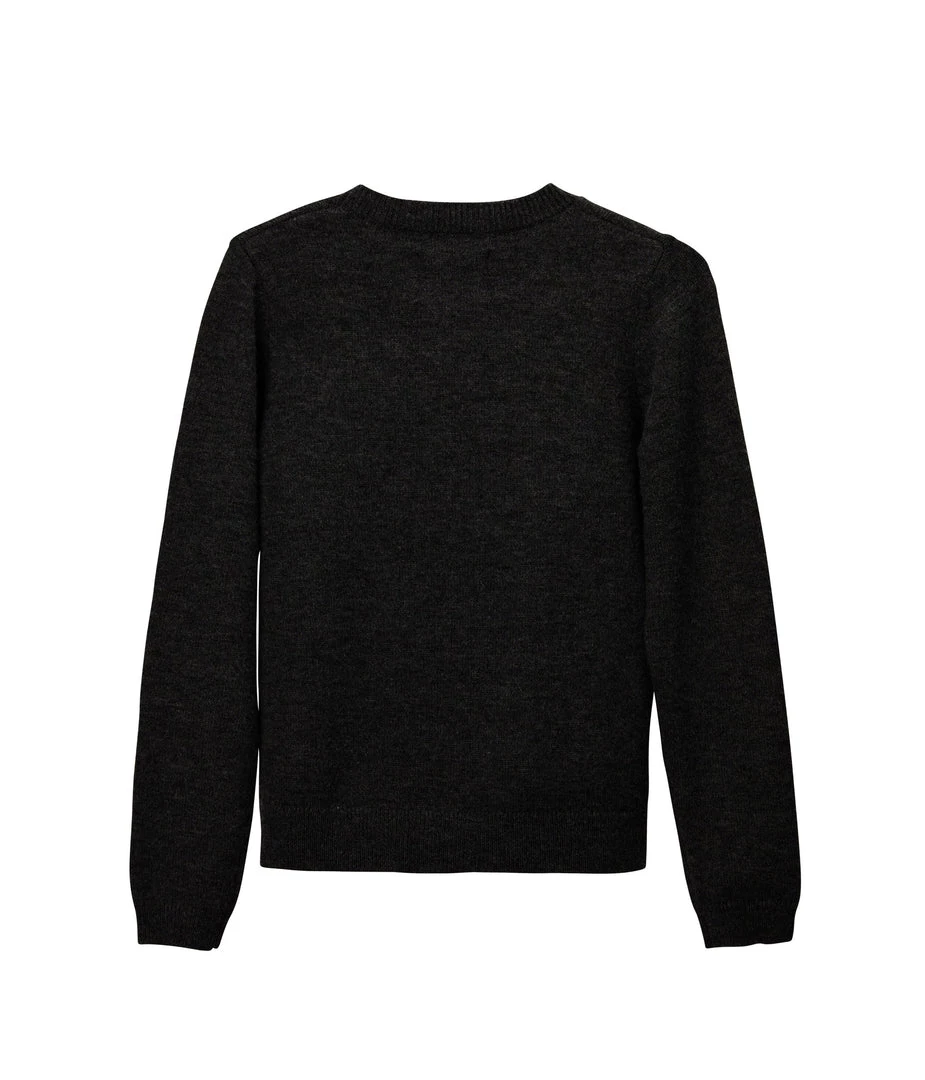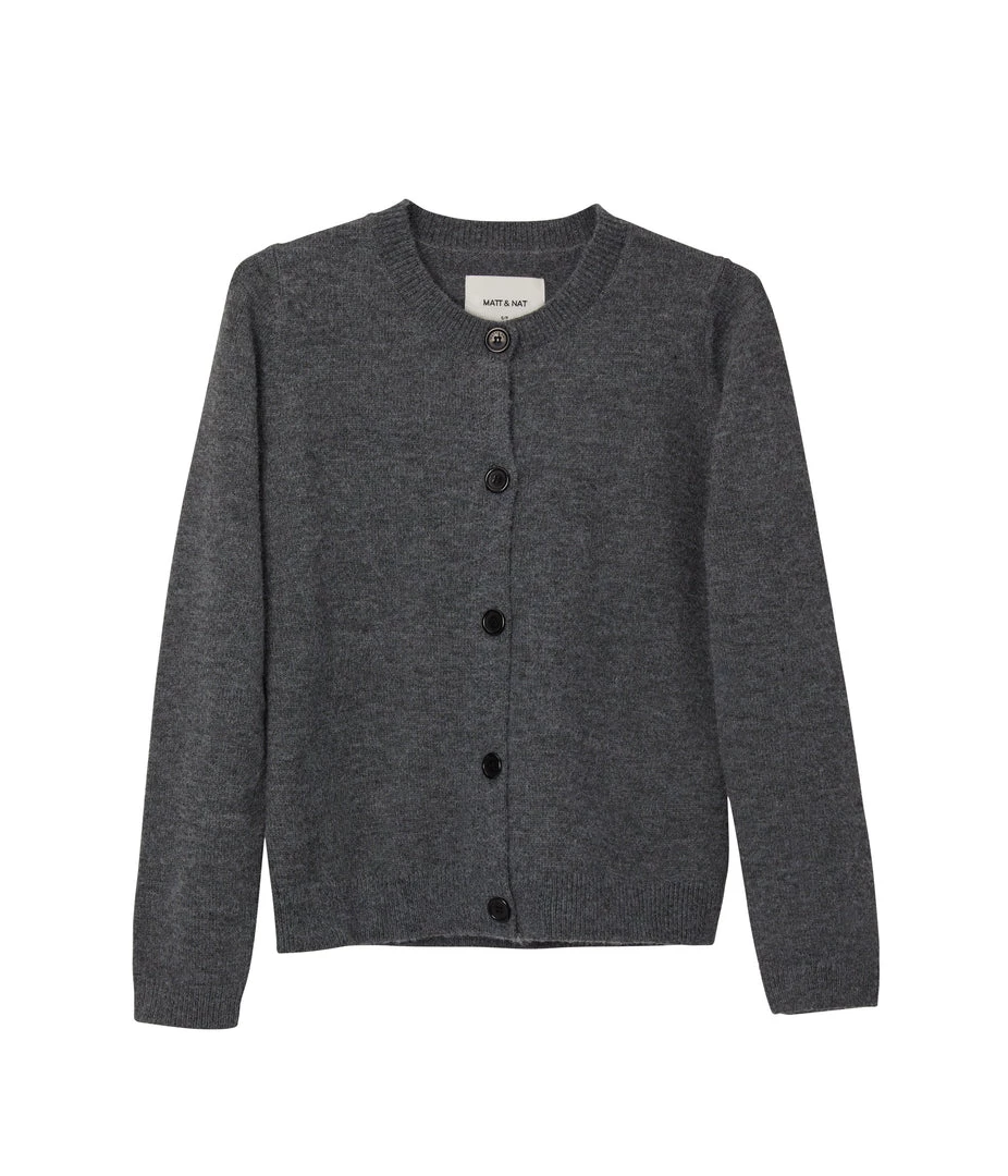 Long-sleeve button-front cardigan with crew-neck, rib finish around neckline, hem and cuffs.