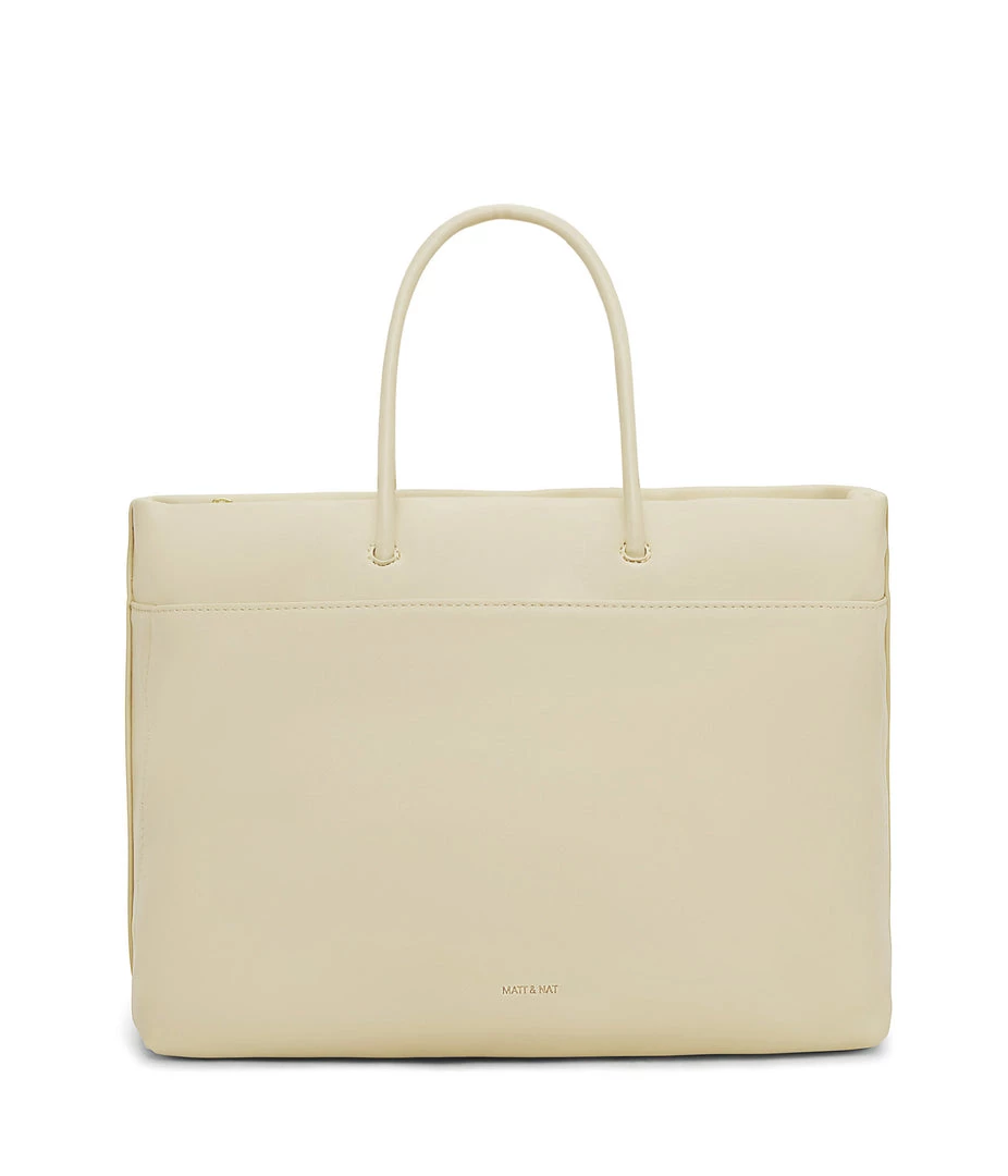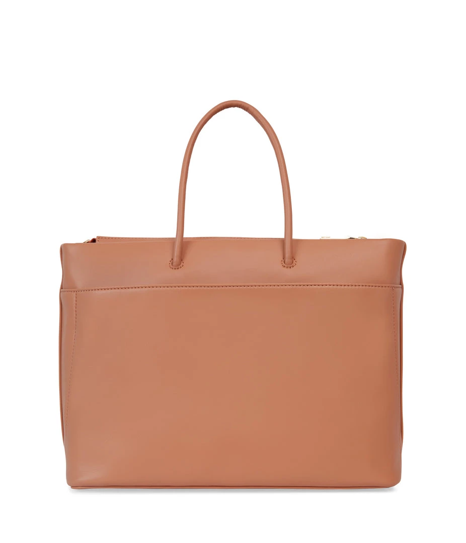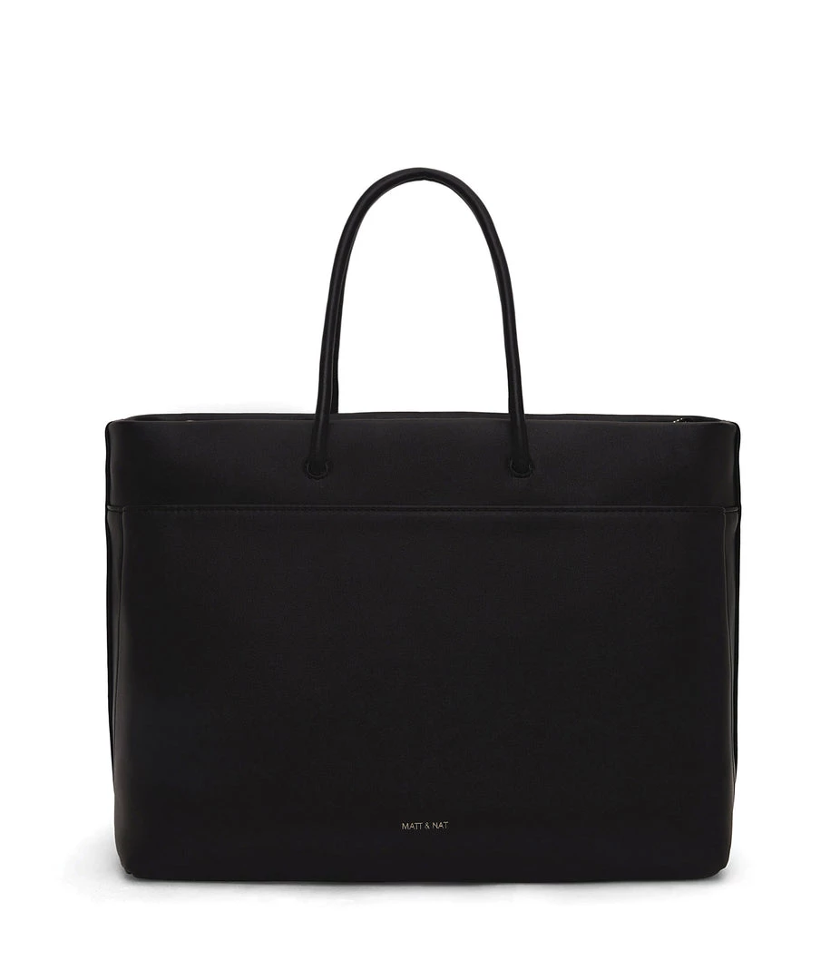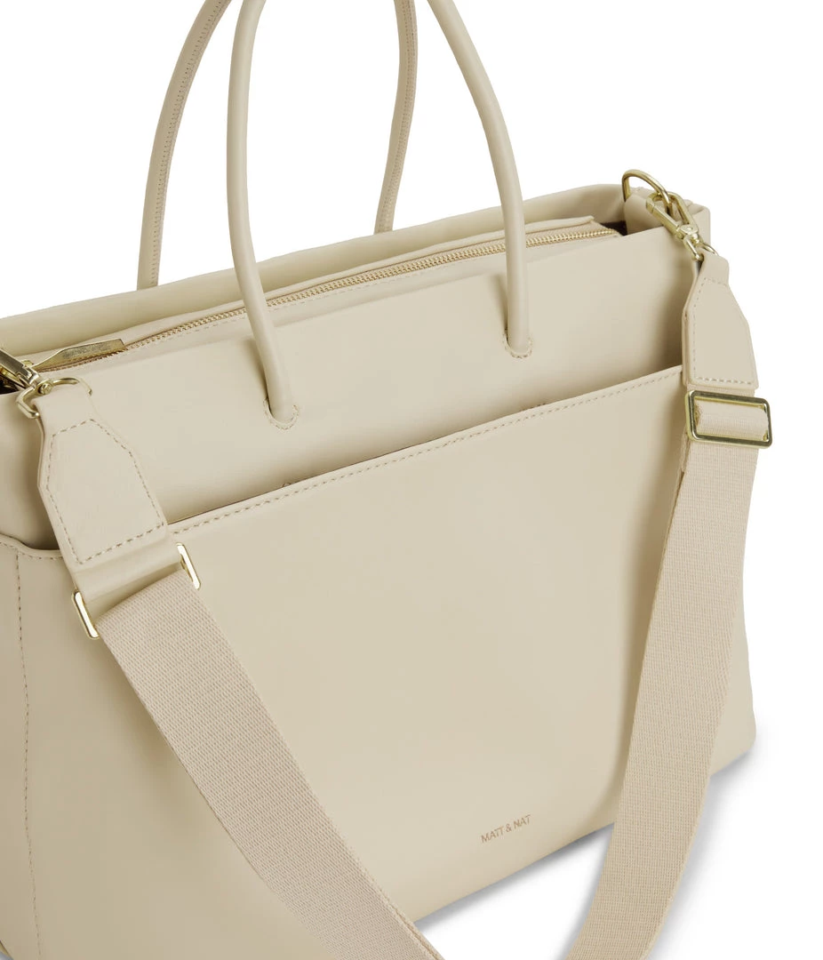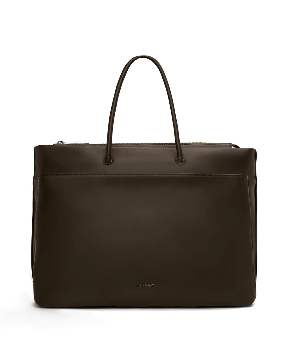Diaper bag with tubular handles, zippered main compartment, front pocket with zip closure, back pocket with magnetic snap closure, and a detachable and adjustable webbing strap.