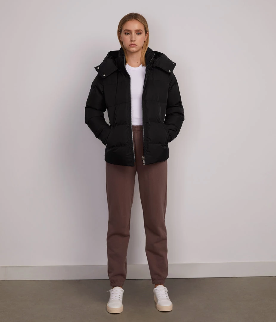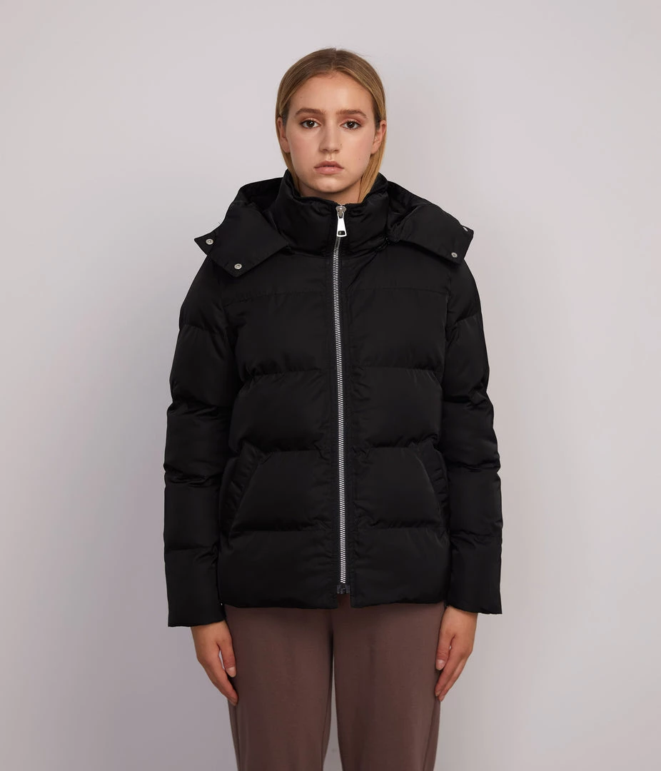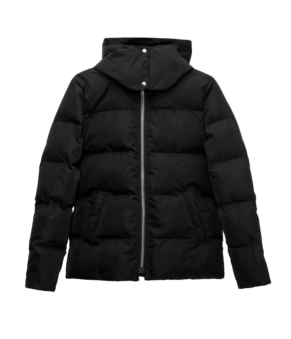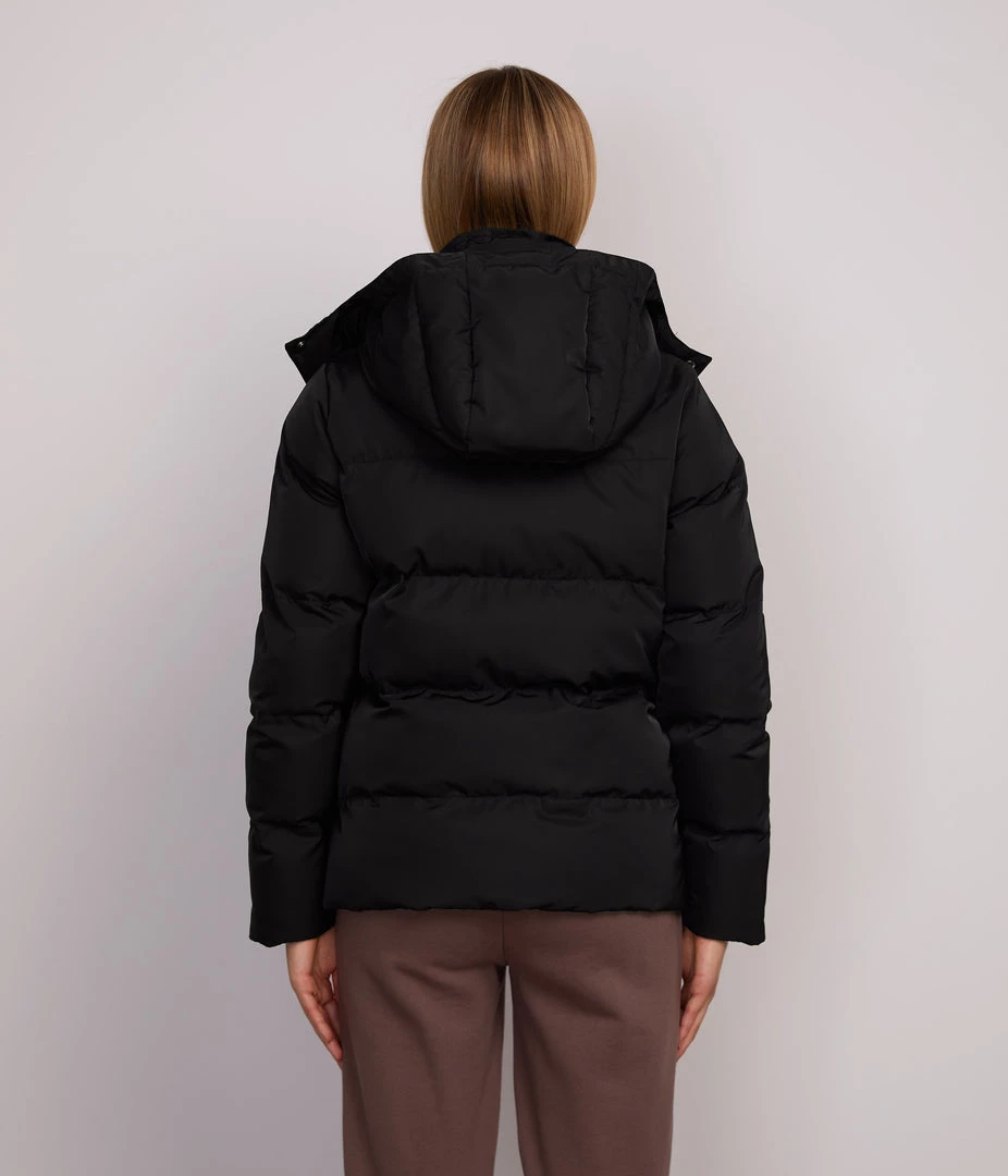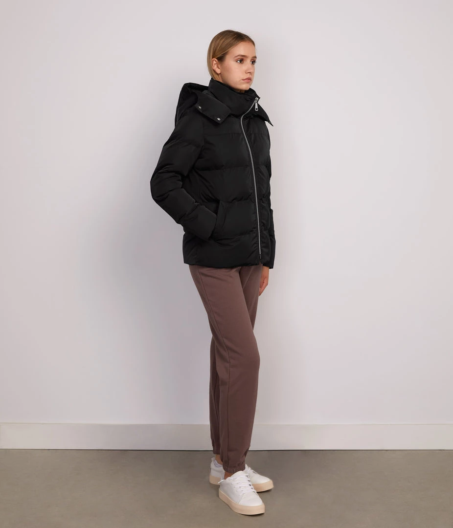 Long sleeve quilted short puffer jacket with removable hood, front zipper closure, wide full coverage collar, and two welt pockets.