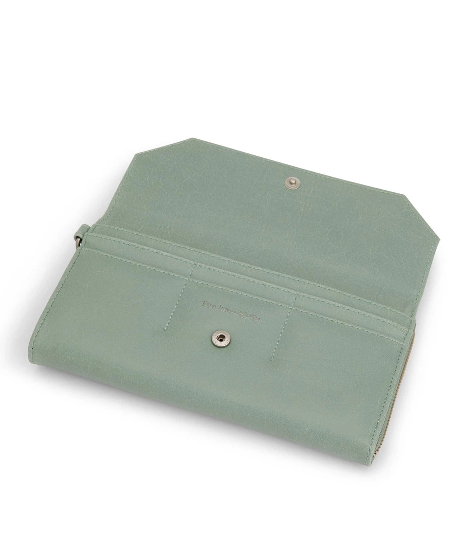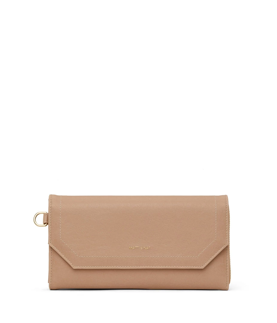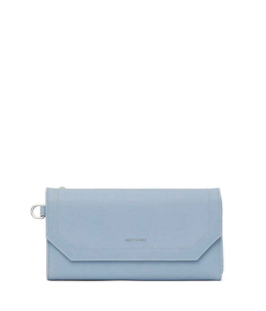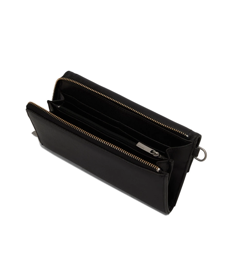 Large wallet with a detachable wristlet. The front flap pocket features 6 credit card slots and 1 slip pocket. The main zippered pocket features 12 credit card slots and a zippered coin pocket. Fits an iPhone 11 Pro Max.