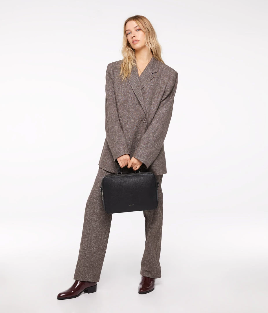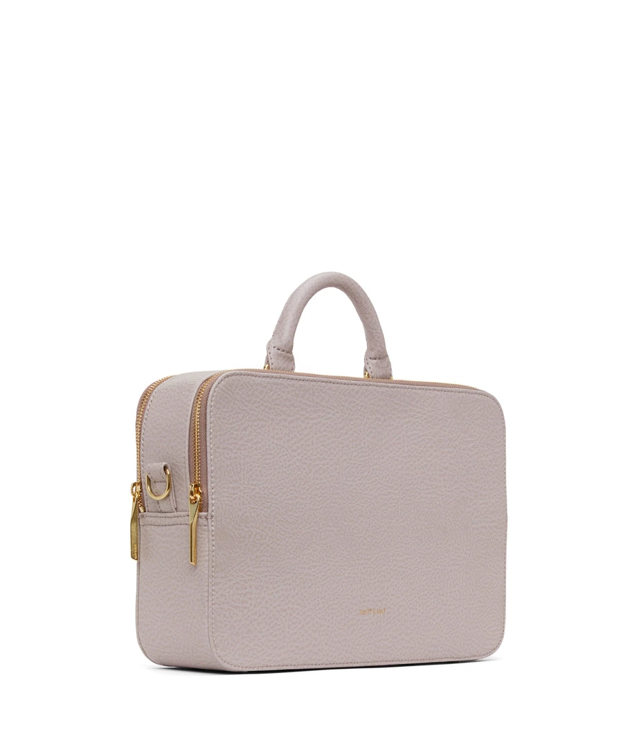 Top handle satchel with 2 main zipper compartments and metal protective feet at the bottom. Comes with a detachable and adjustable crossbody bag.