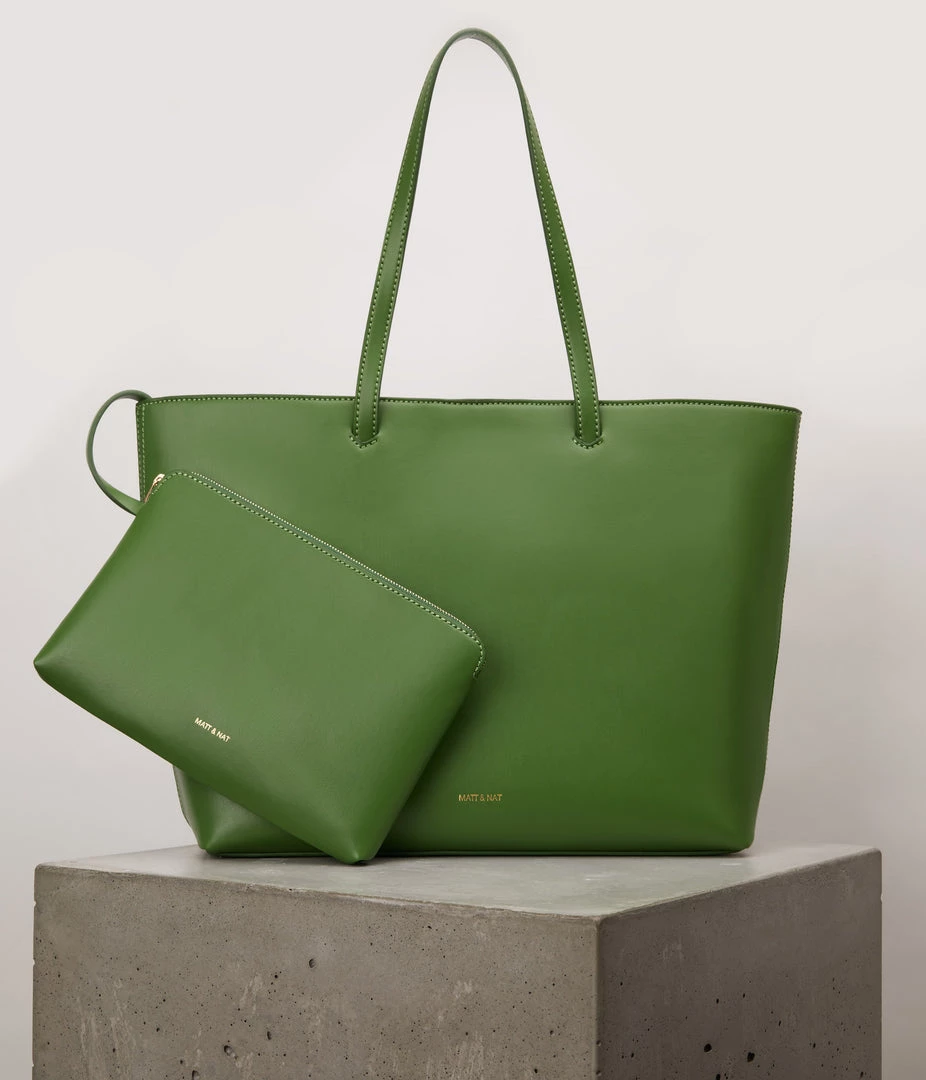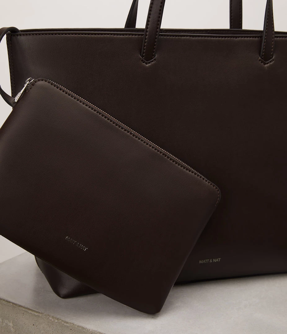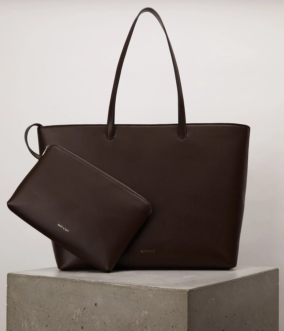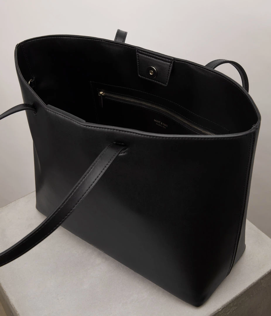 Tote with magnetic tab closure and a removable interior pouch that clips onto the inner ring.