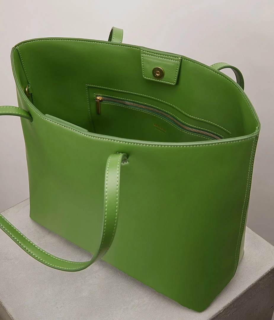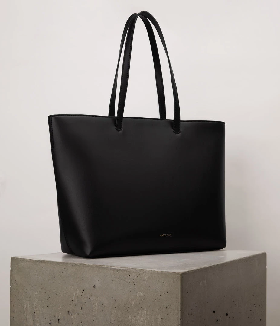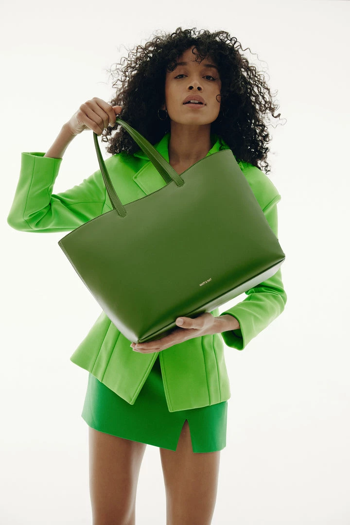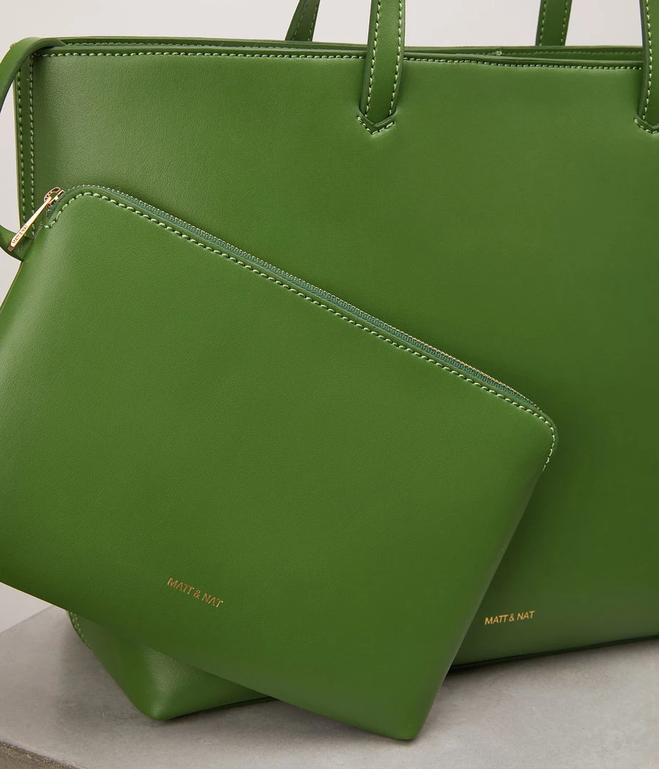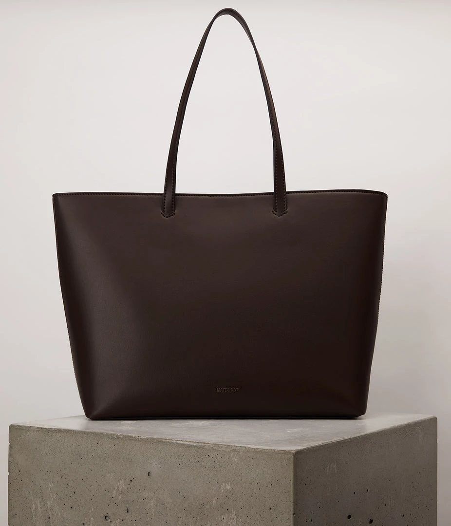 Tote with magnetic tab closure and a removable interior pouch that clips onto the inner ring.