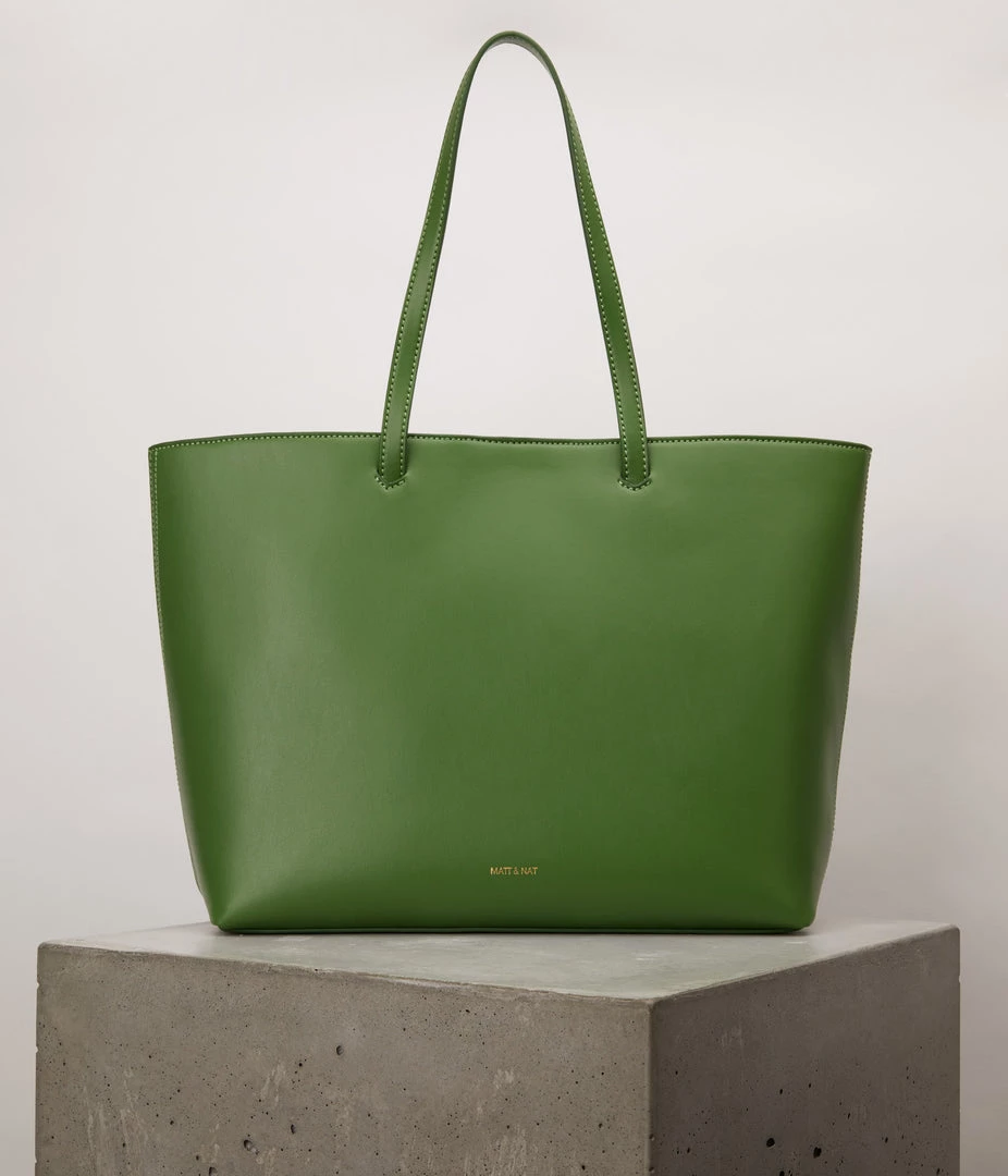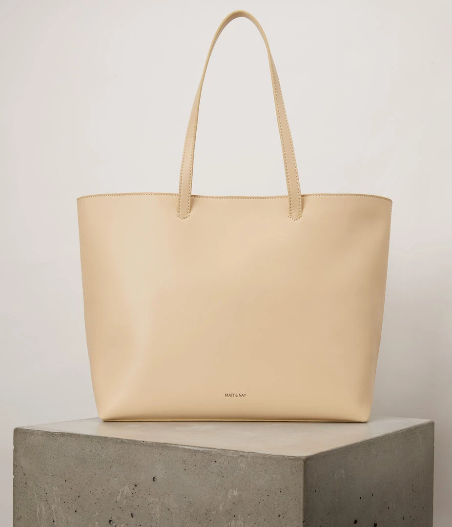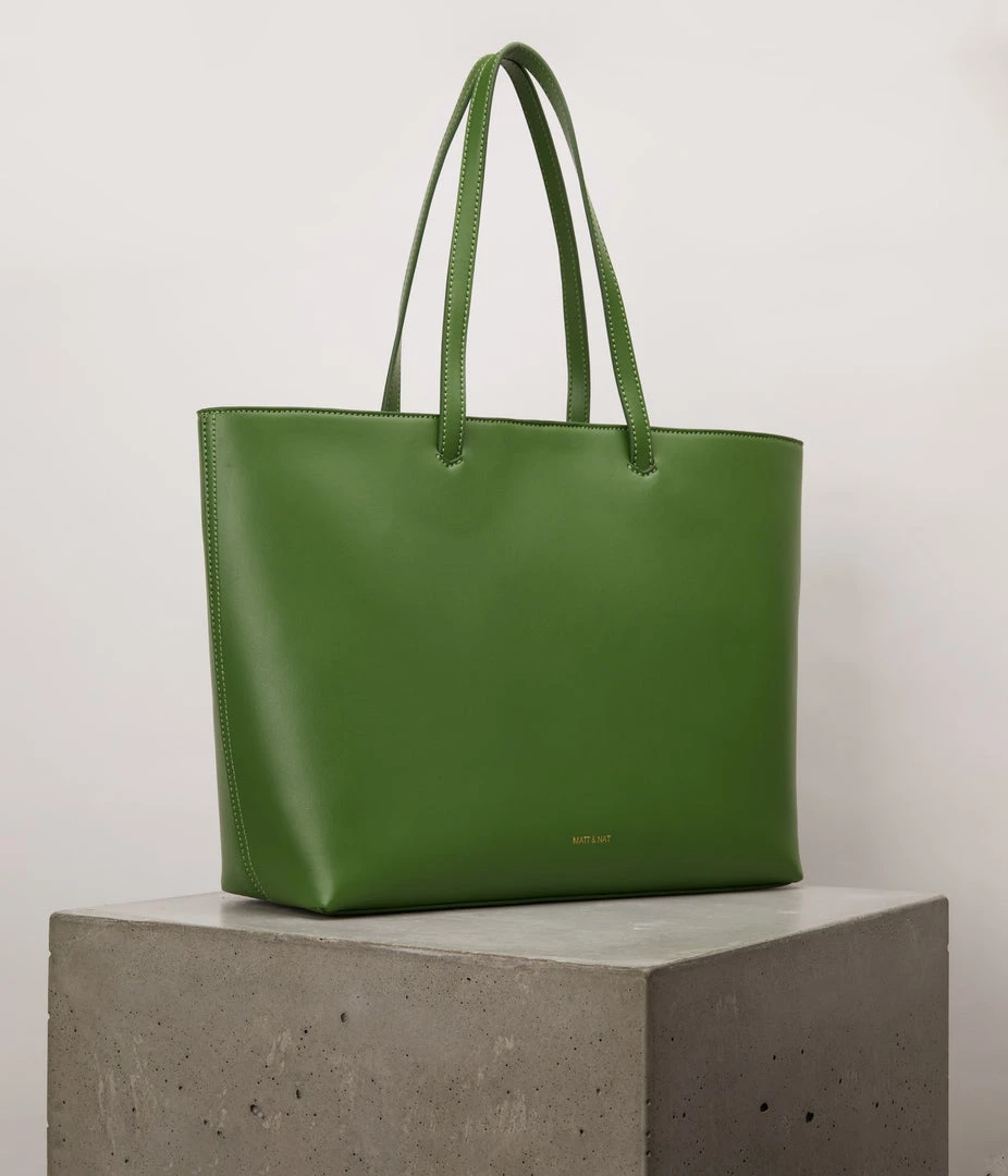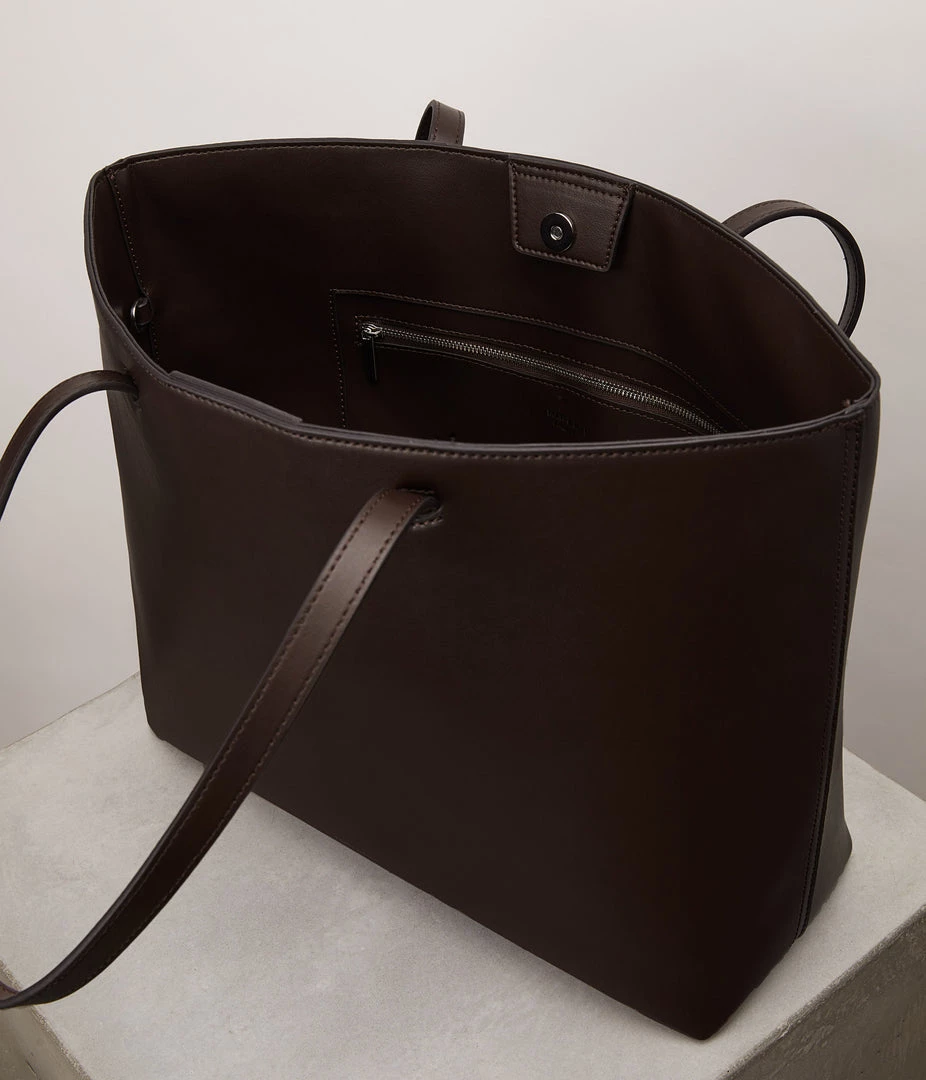 Tote with magnetic tab closure and a removable interior pouch that clips onto the inner ring.