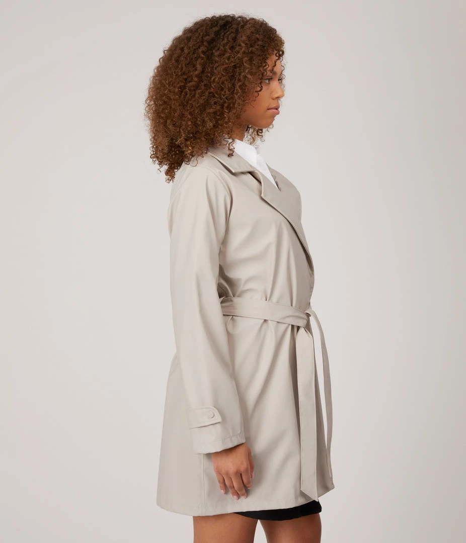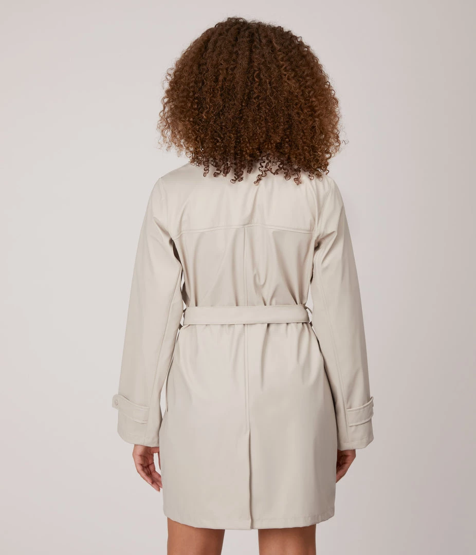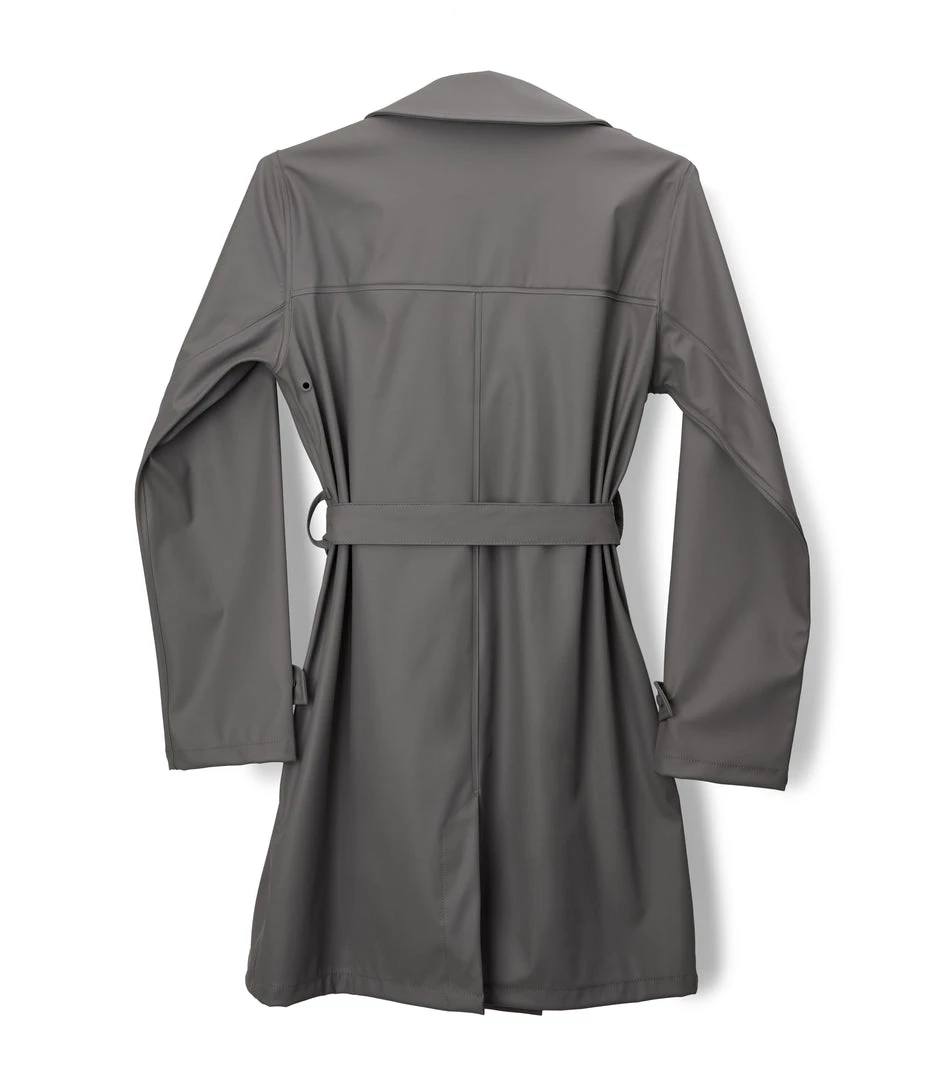 Waterproof trench coat with notched collar, double-breasted hidden snap closure, self-tie belt, inseam pockets, tab detail at cuffs, center-back vent, and ventilation holes at front and back armhole.