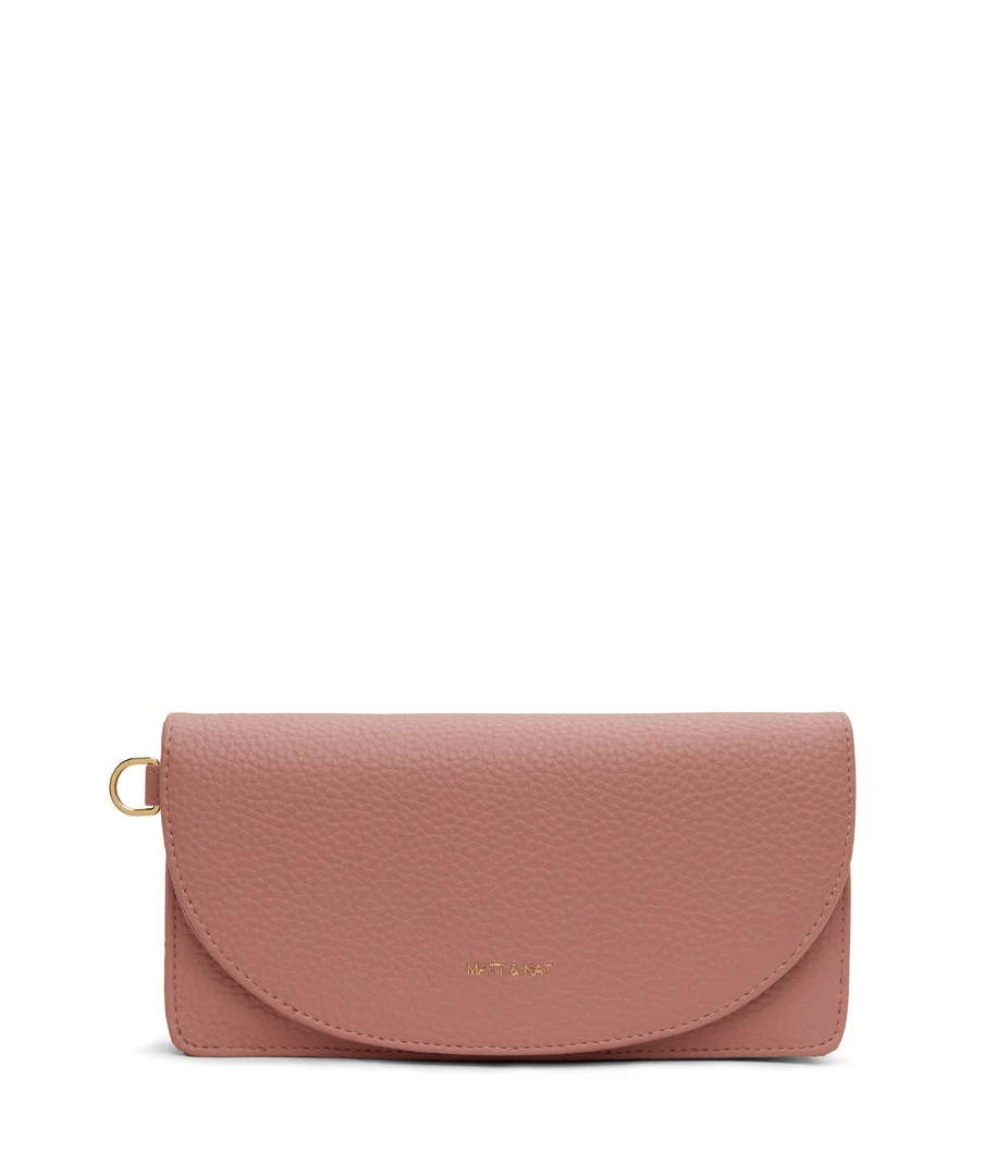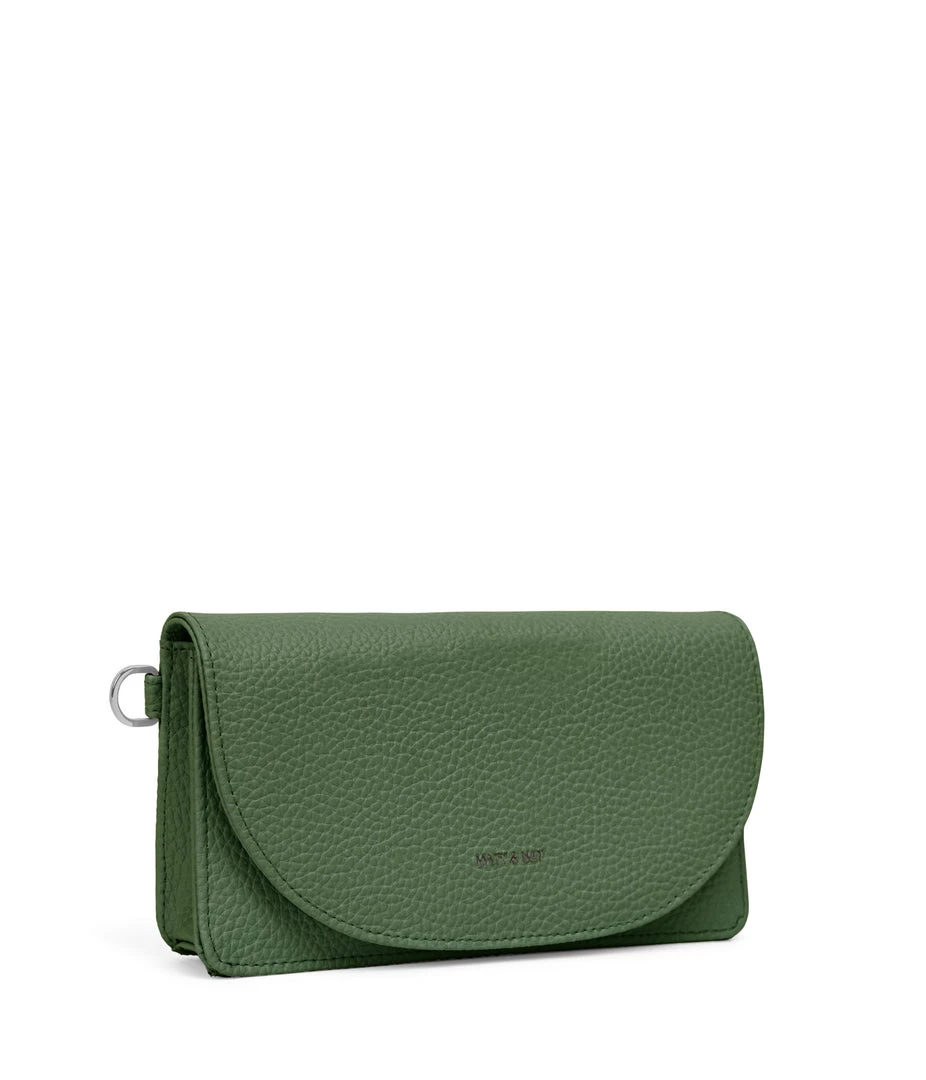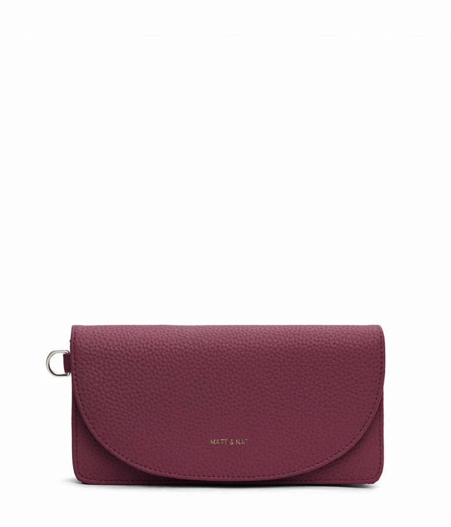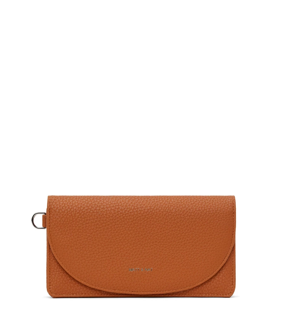 Wallet with a removable wristlet, flap closure, and zippered pocket at the front panel top. Fits an iPhone 11 Pro Max.