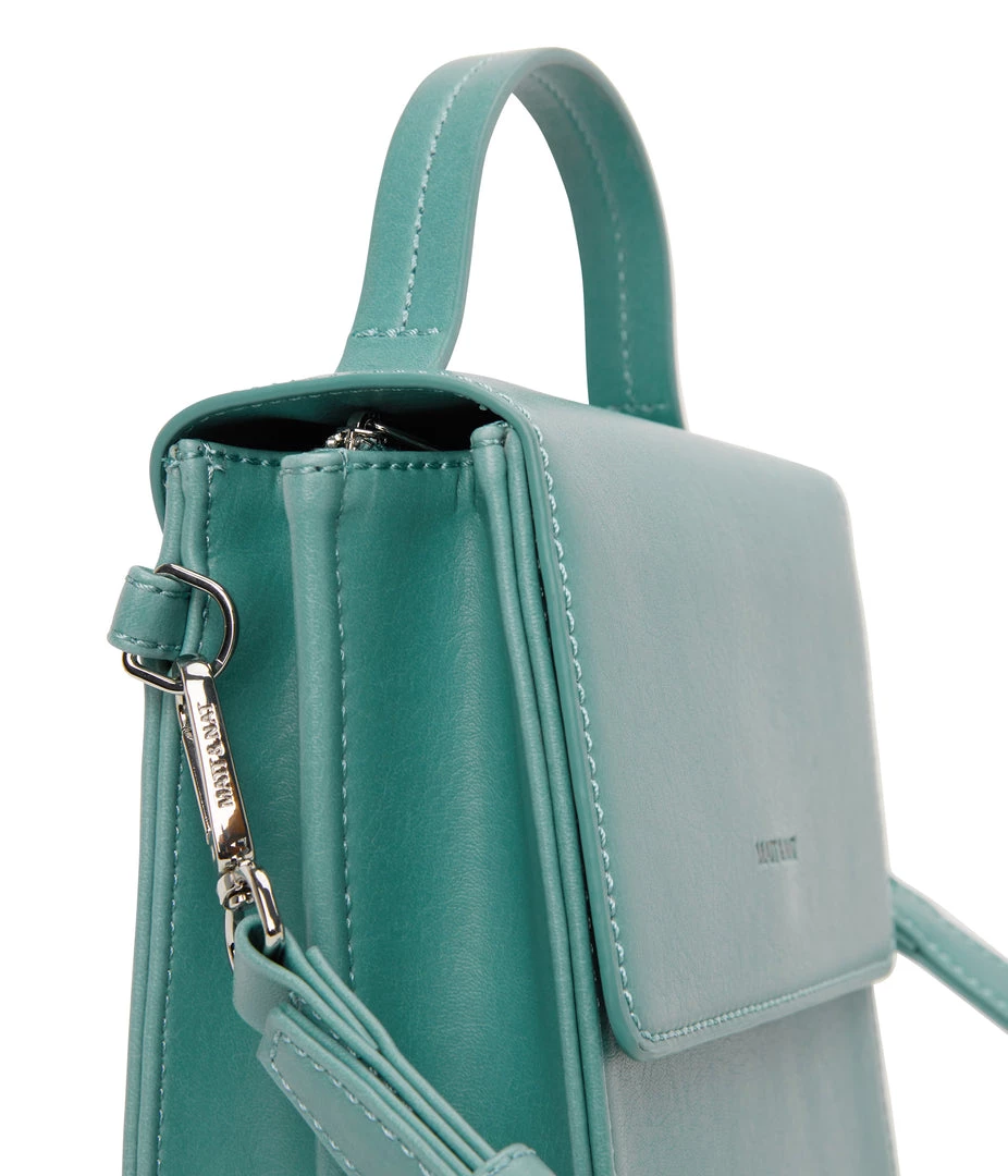 Crossbody bag with triple compartment interior, flap closure with magnetic snap, and top handle to hand-carry. The crossbody strap is adjustable and detachable.