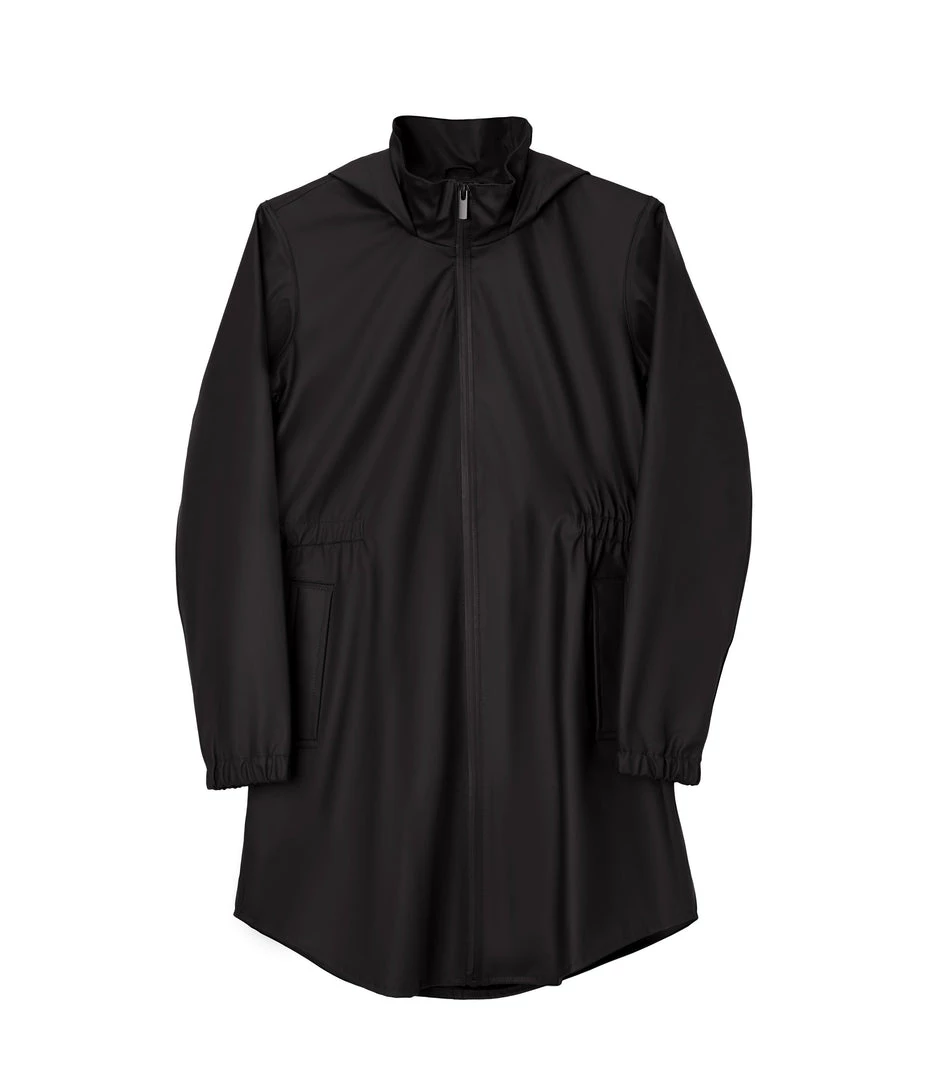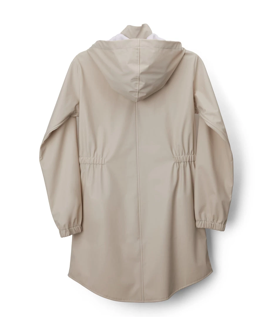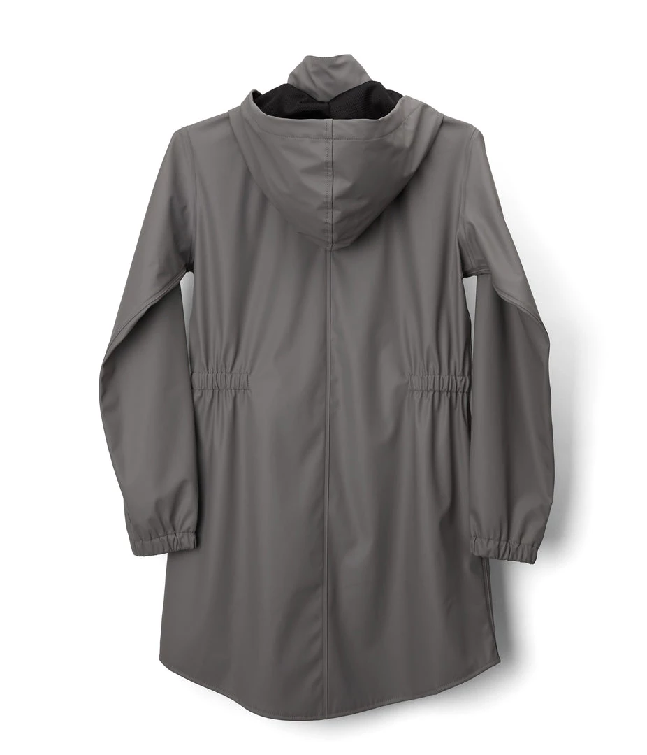 Waterproof jacket with zip front closure, elasticized waist detail, non-removable hood, welt pockets, elasticized sleeve cuff finish, and ventilation holes at front and back armholes.