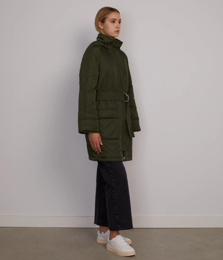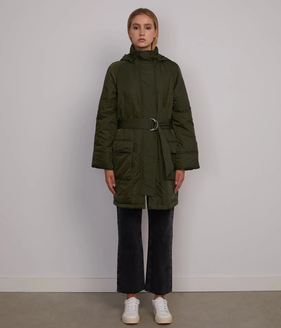 Raglan sleeve jacket with self-belt, large cargo pockets, zippered pocket at chest, removable snap-off hood, and concealed front zipper closure.