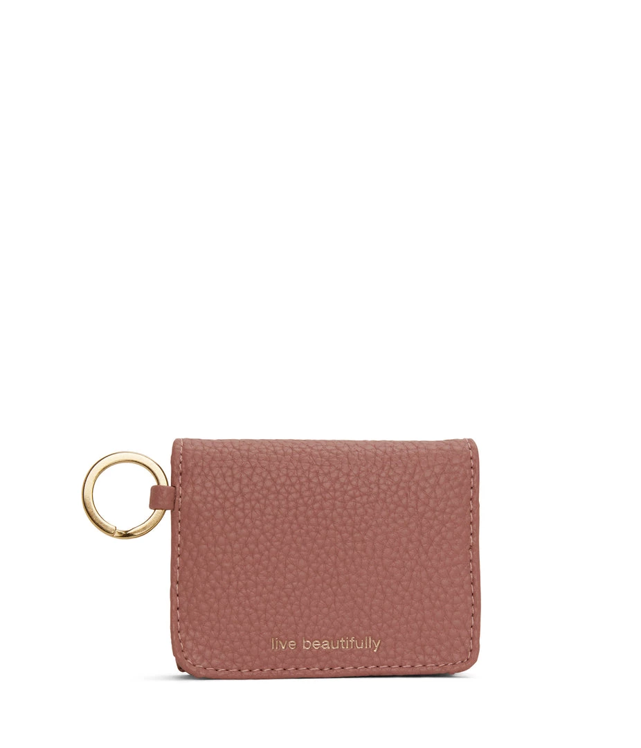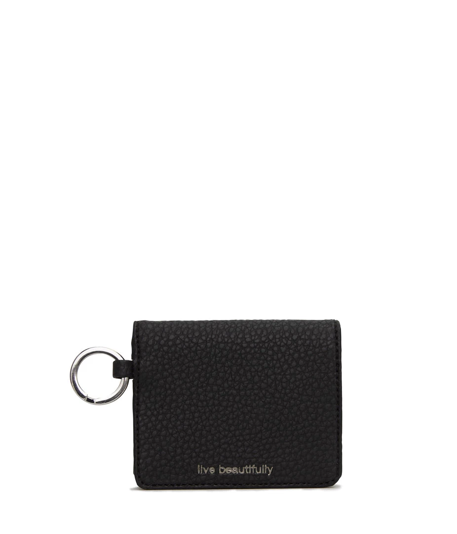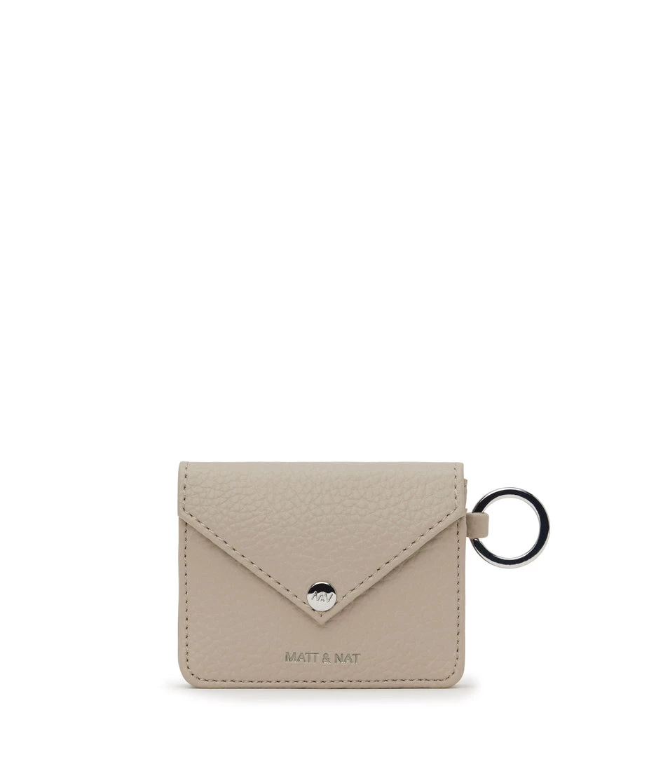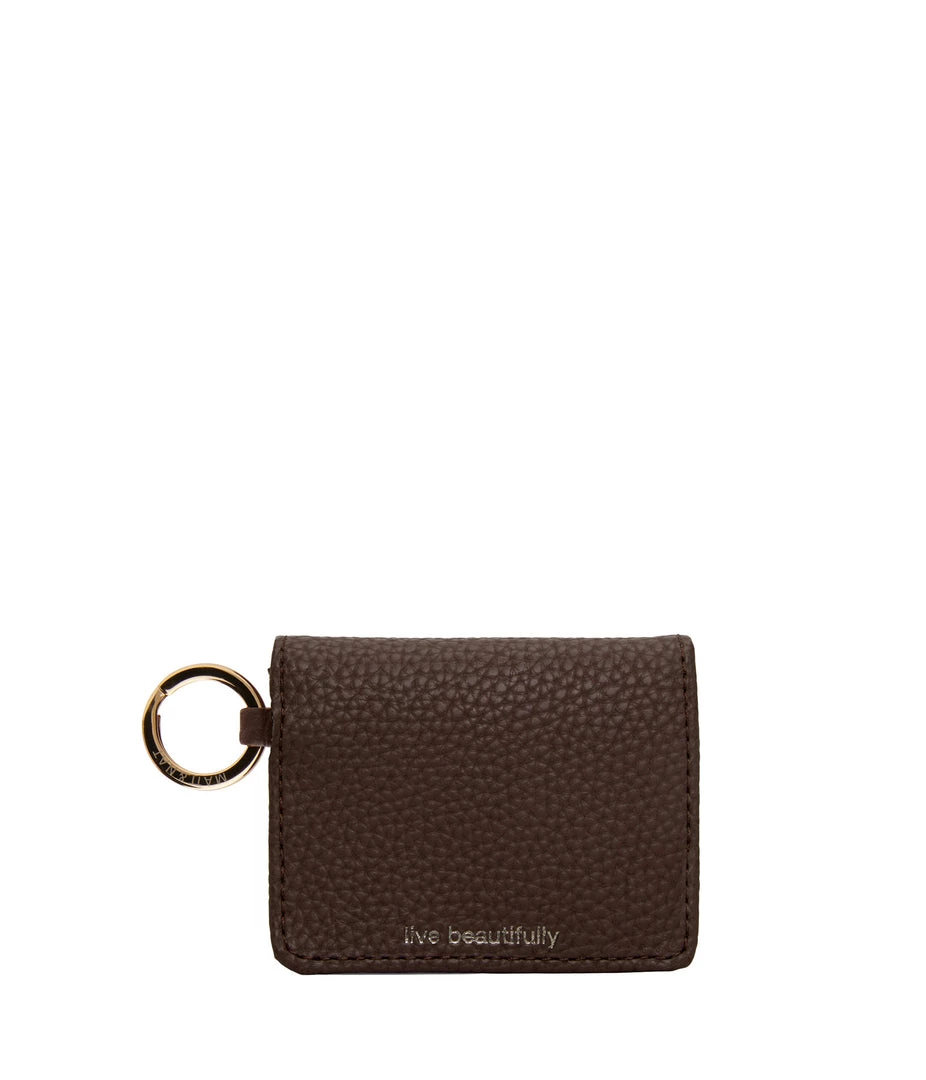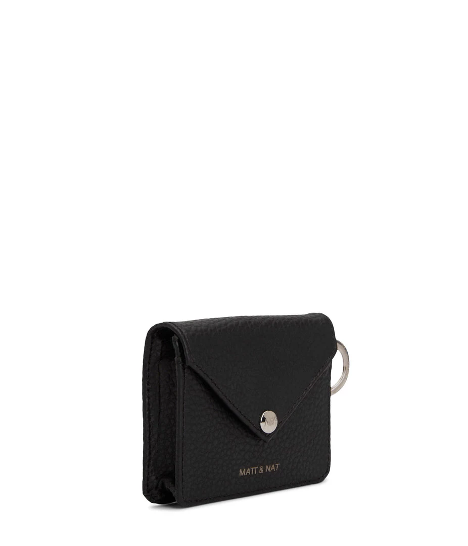 Coin purse/credit card holder with round keyring logo detail and center snap flap closure.
