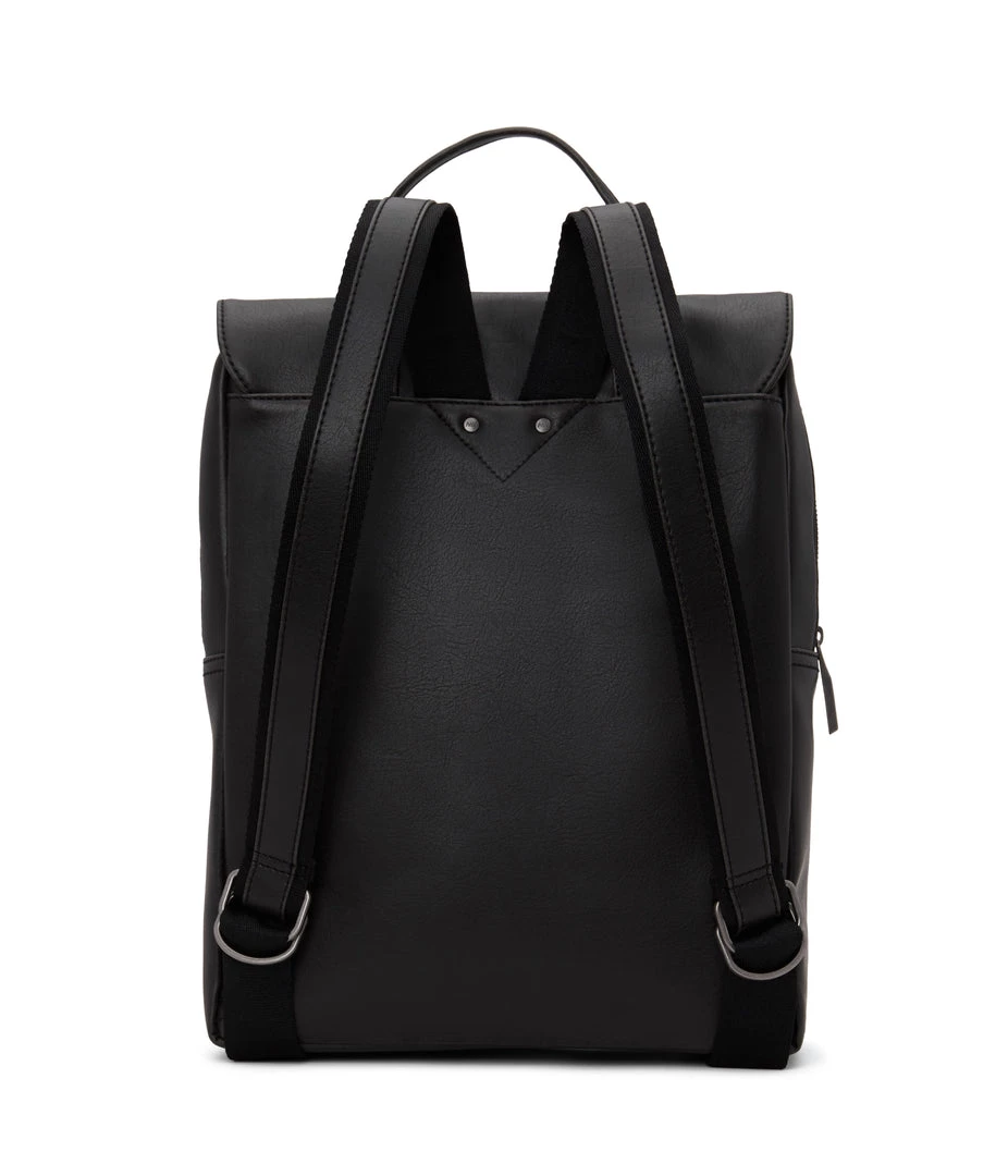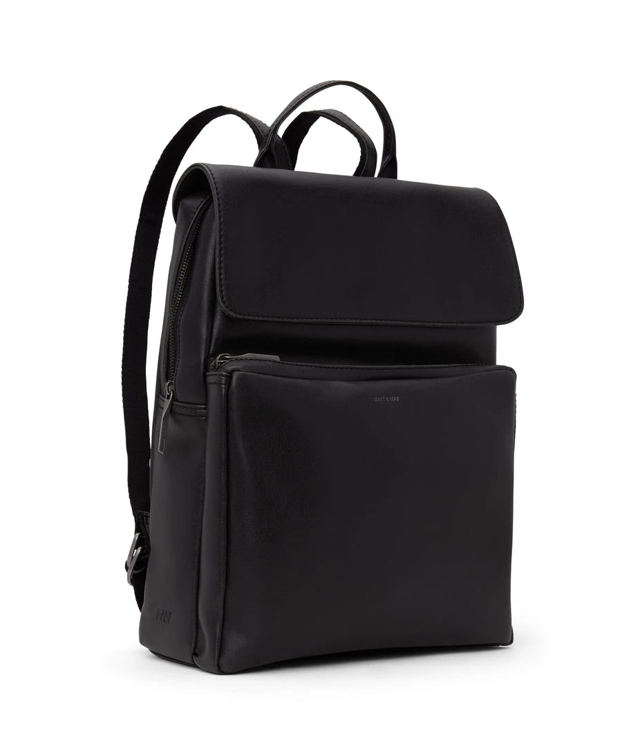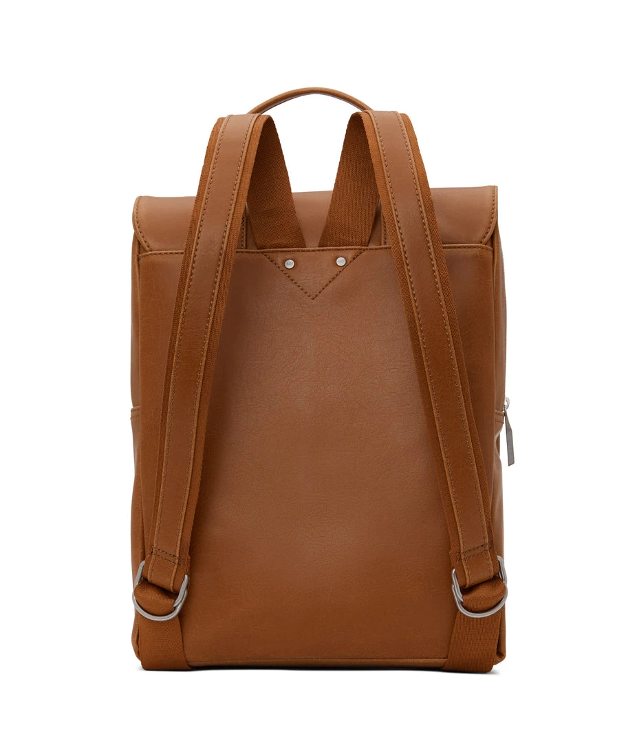 Backpack with top zipper closure and front zipper pocket. Flap with hidden magnetic closure. Top handle to hand-carry, and adjustable webbing back straps.