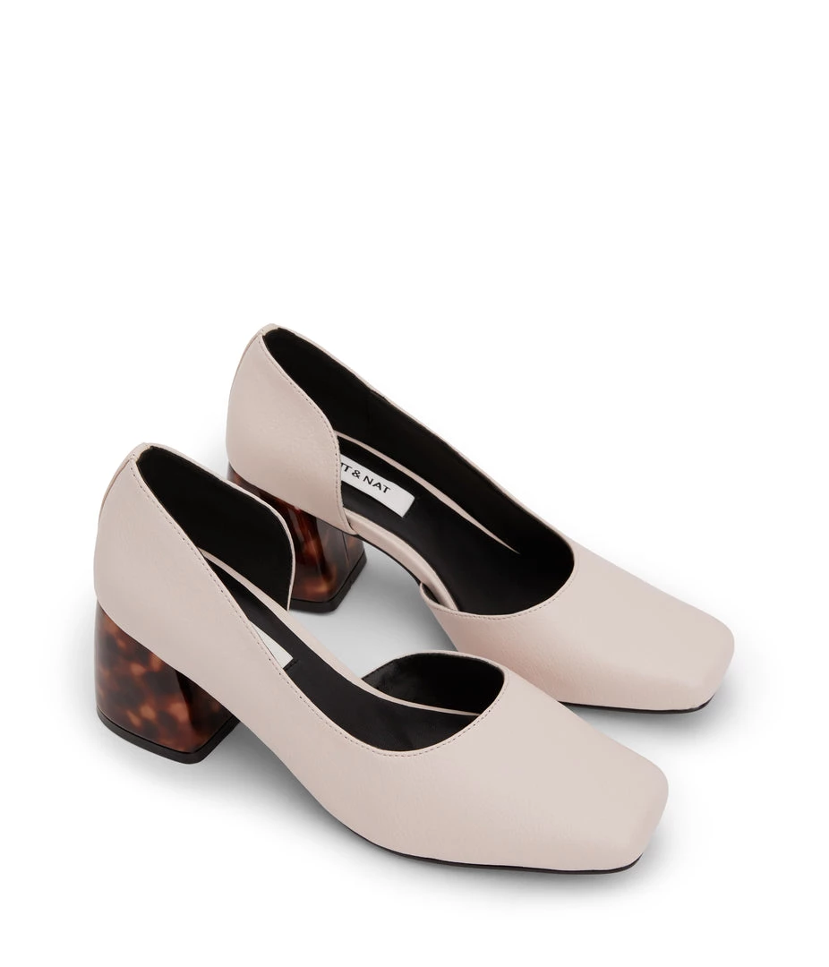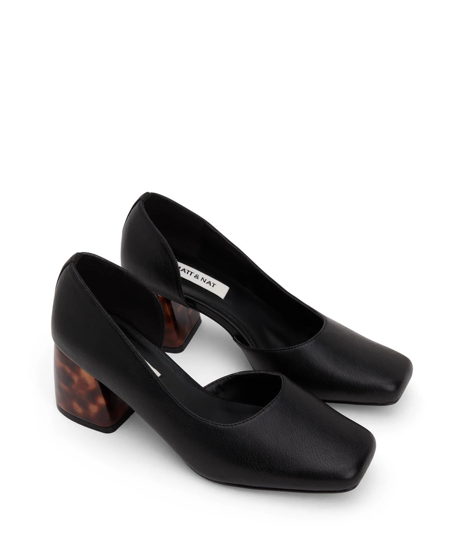 Women’s asymmetrical upper with 2.5” contrast heel and square toe.