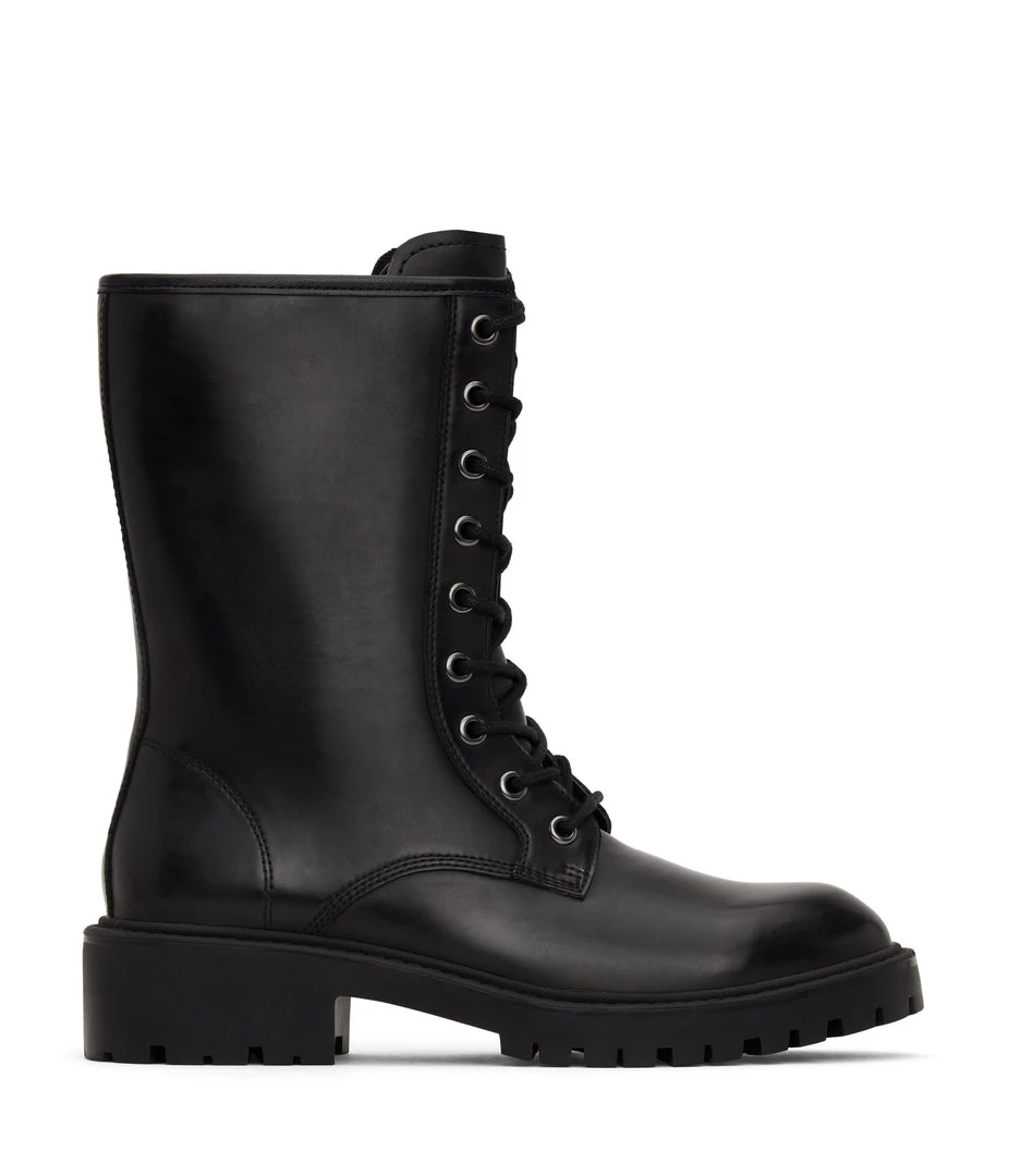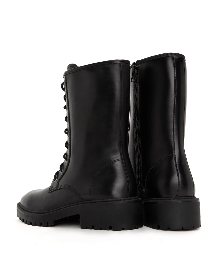 Women’s lace-up combat boot with a rounded toe and zipper closure.