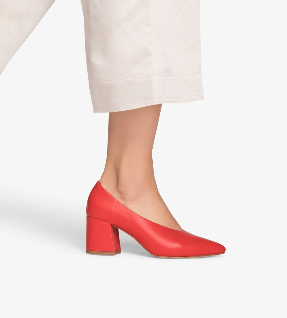 V-cut pointed-toe heeled shoe with a 2.5″ flared block heel.