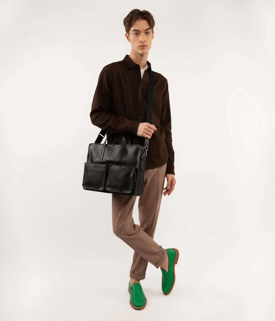 Briefcase with adjustable and removable strap. Top zipper closure. Two front pockets, one with zipper and one with snap closure. Fits both 13” & 15” laptops.
