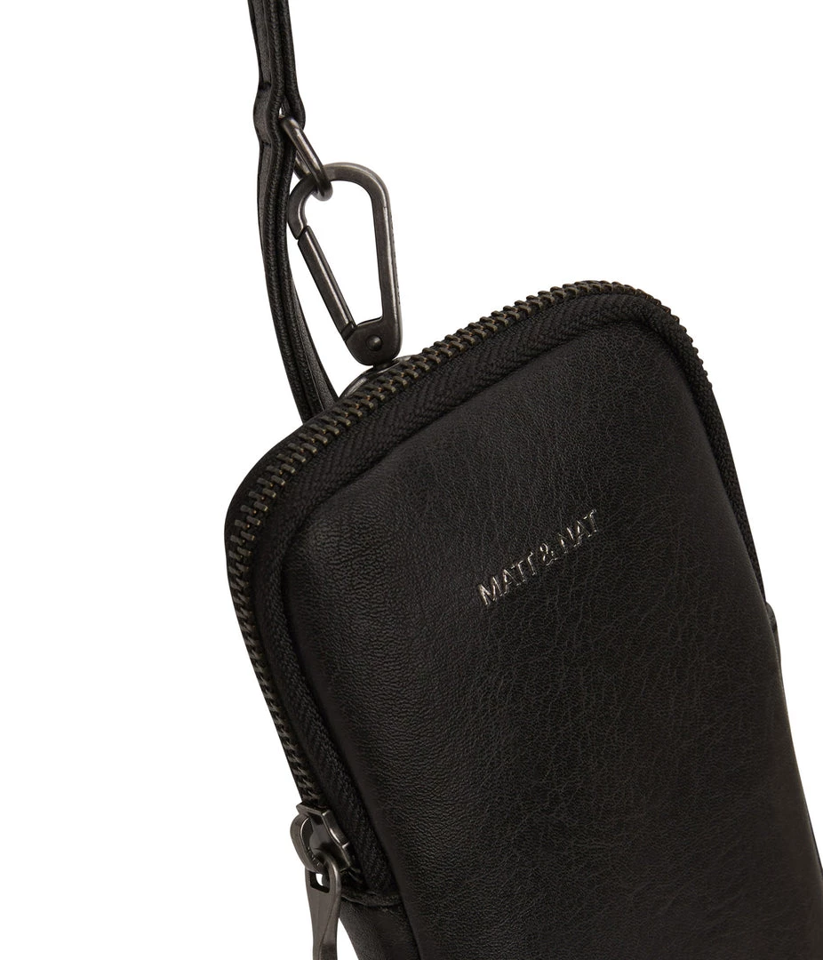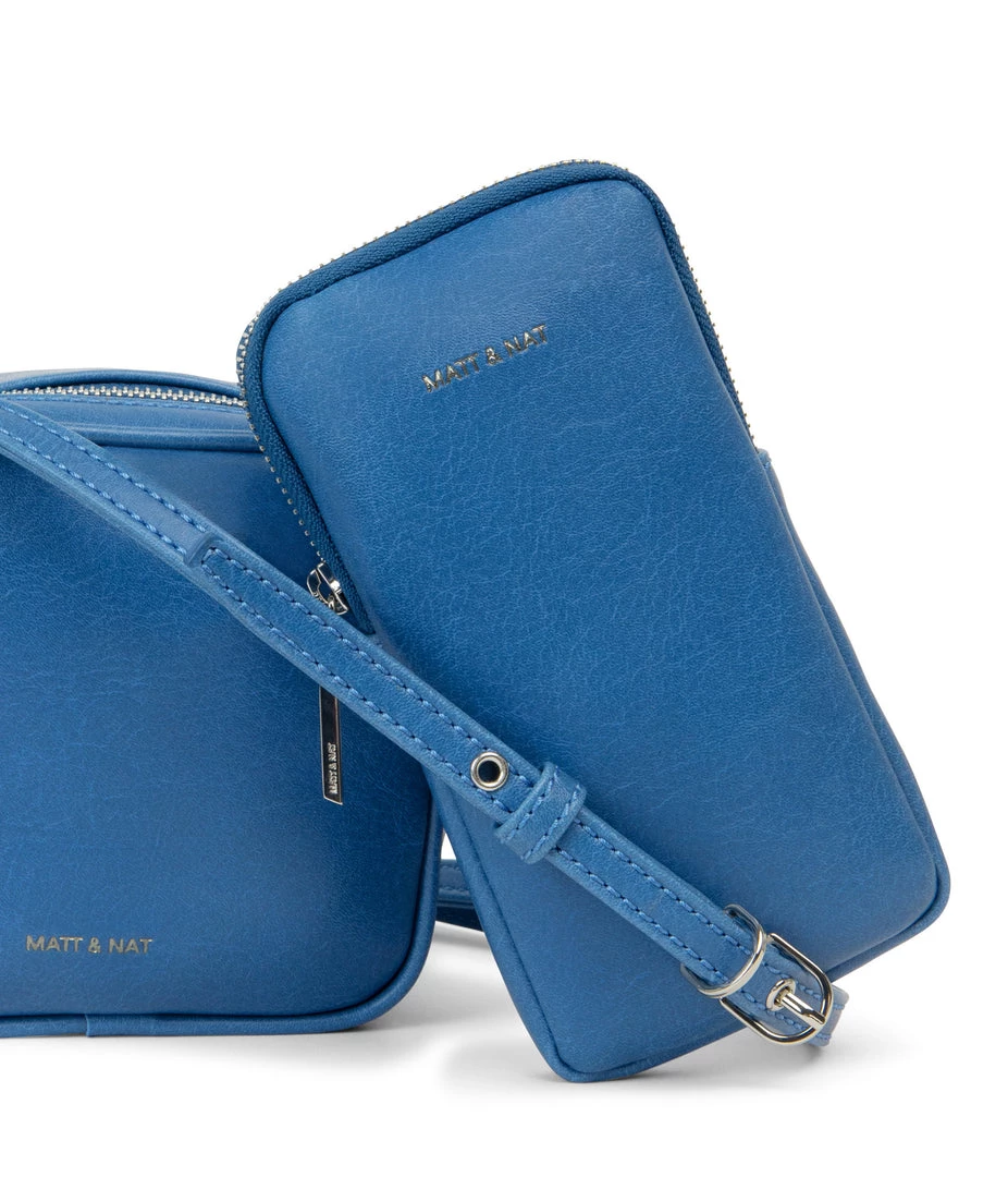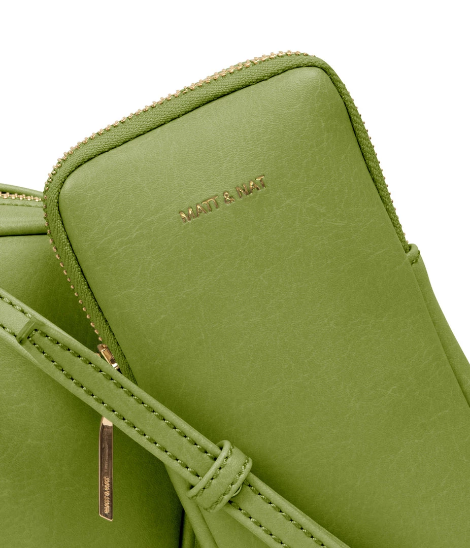Small crossbody bag with zip closure, adjustable strap, and a detachable cellphone pouch.