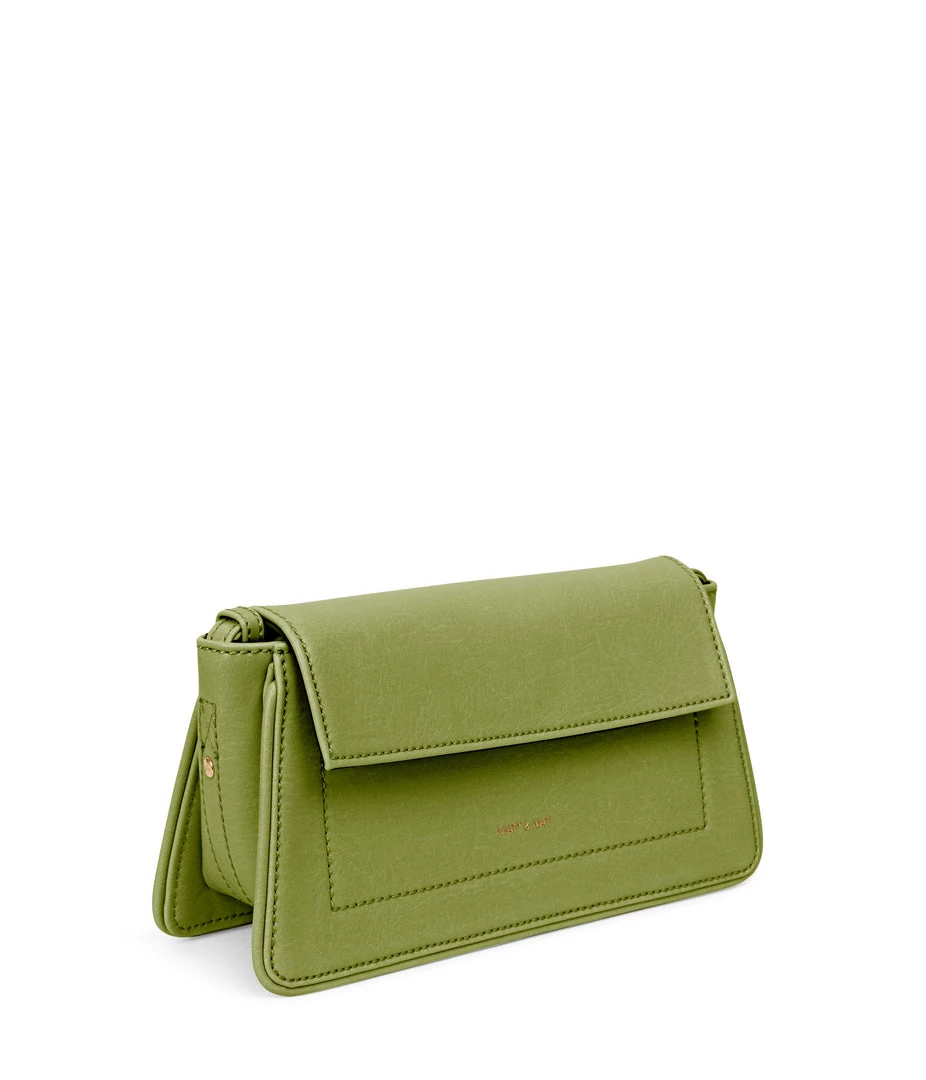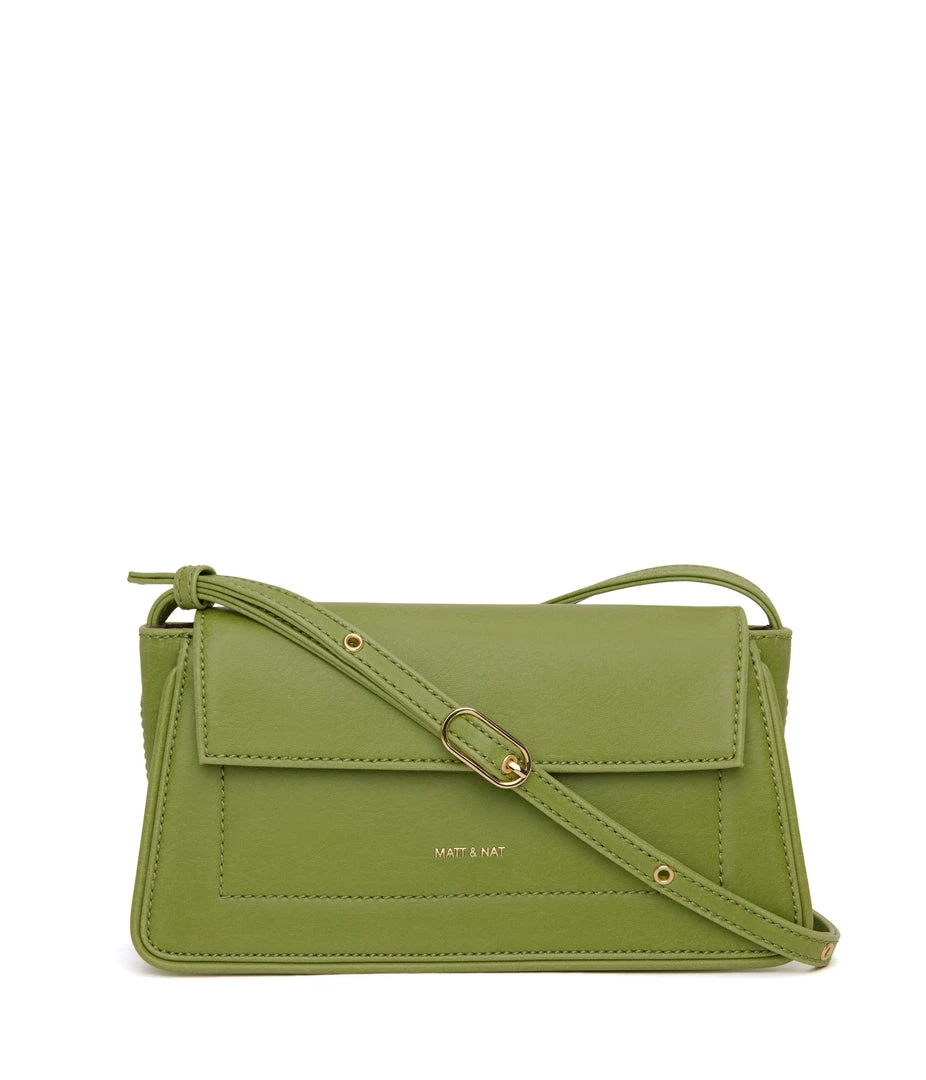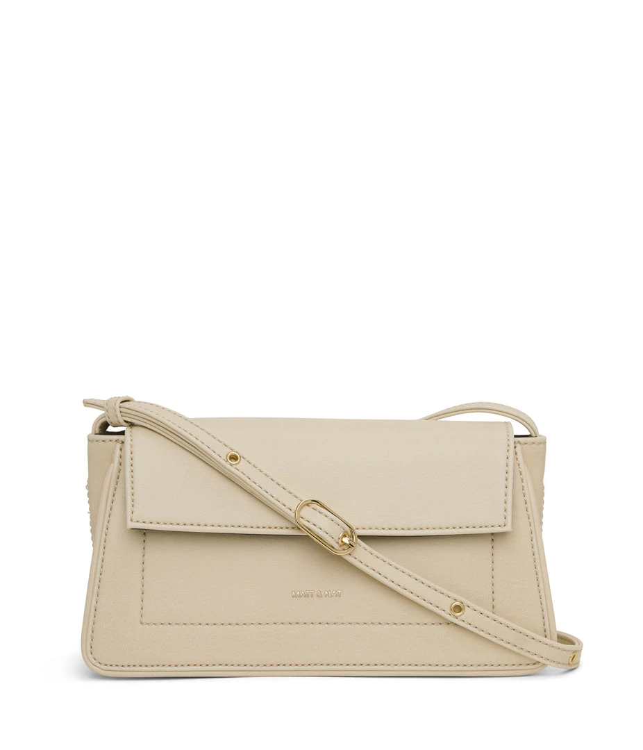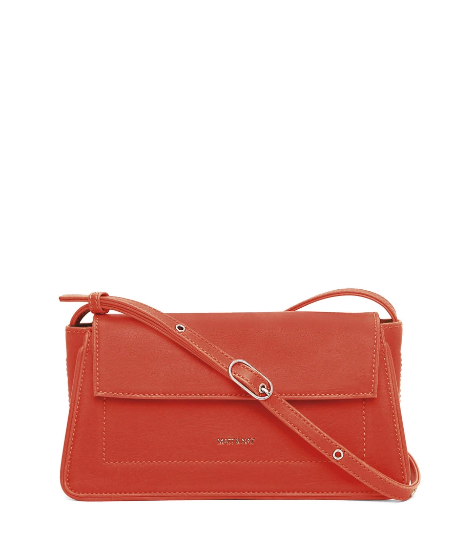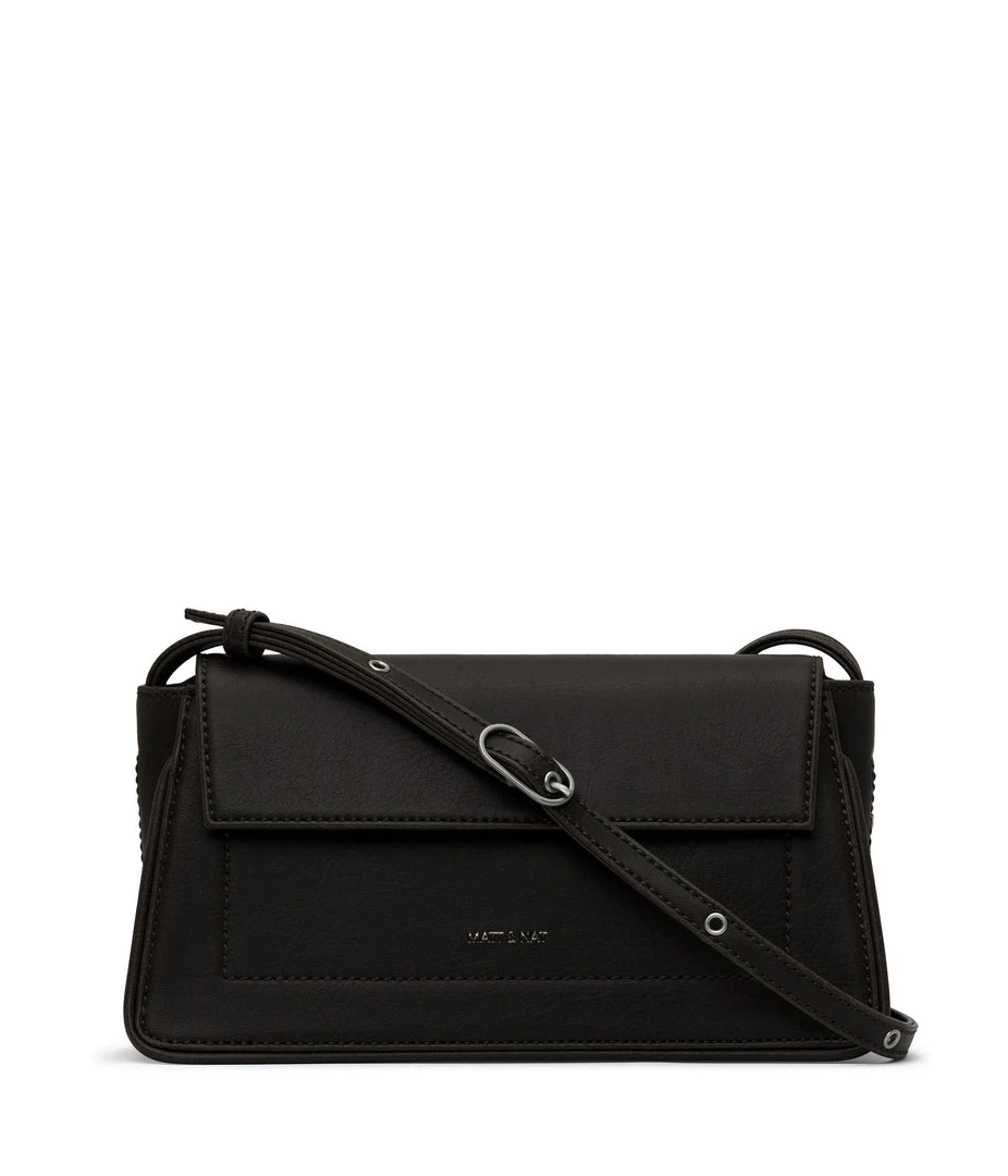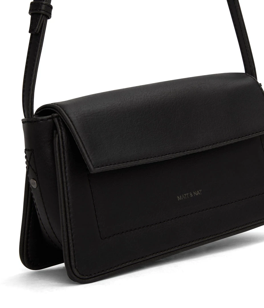 Structured crossbody bag with an adjustable strap and flap closure. The slip pocket at the exterior back fits an iPhone 11 Pro Max.