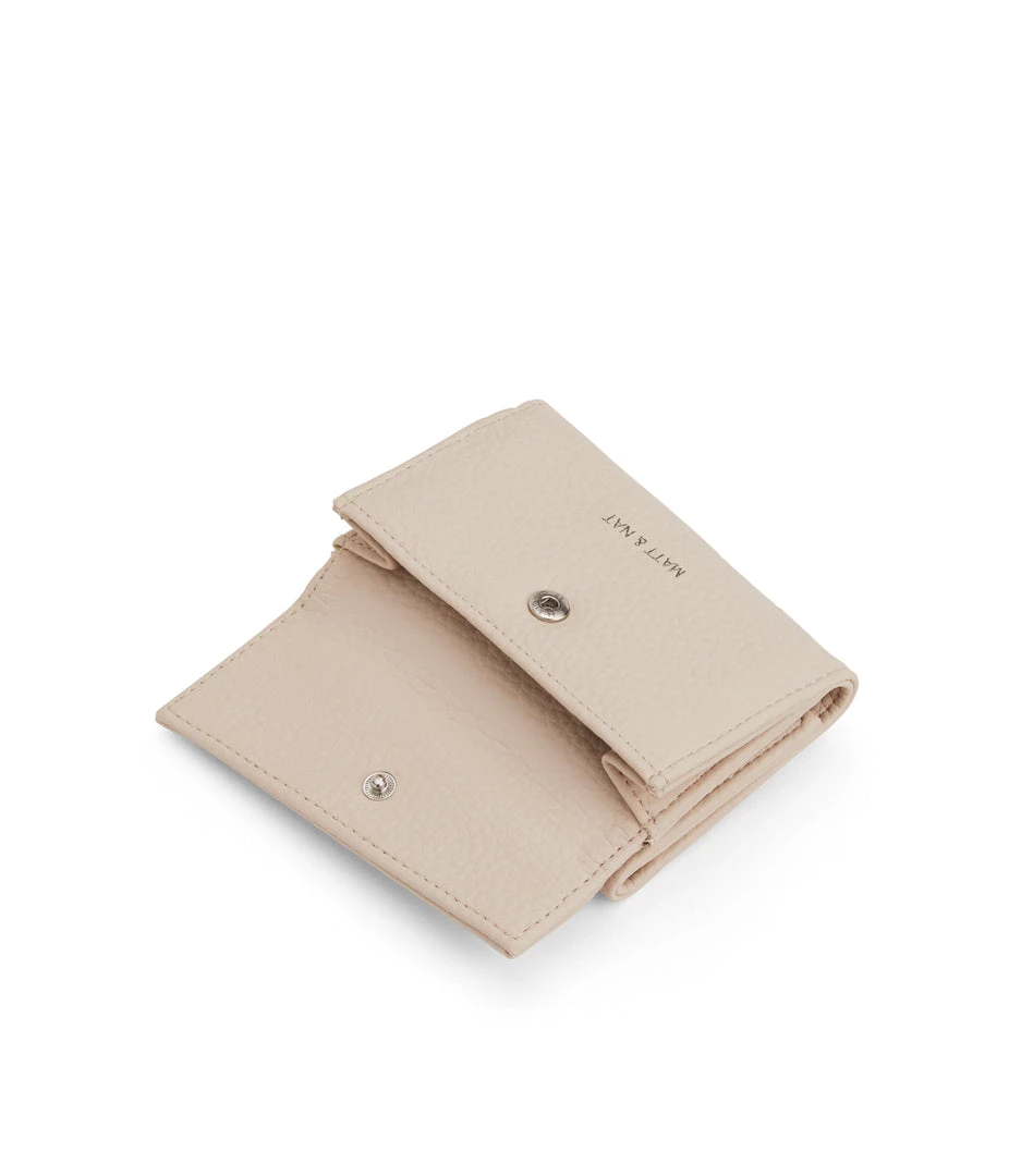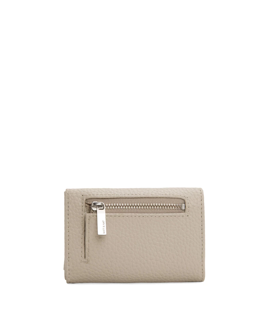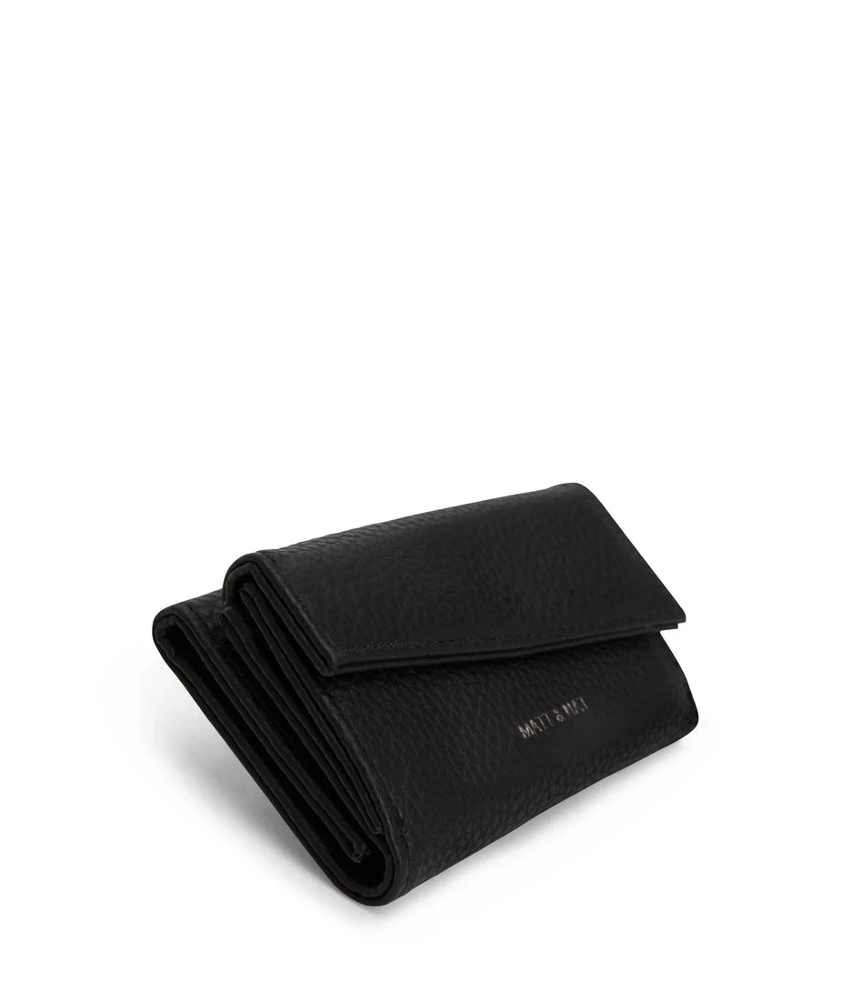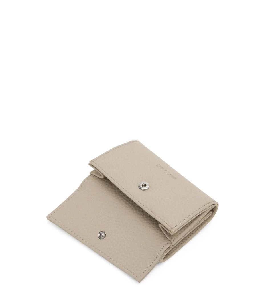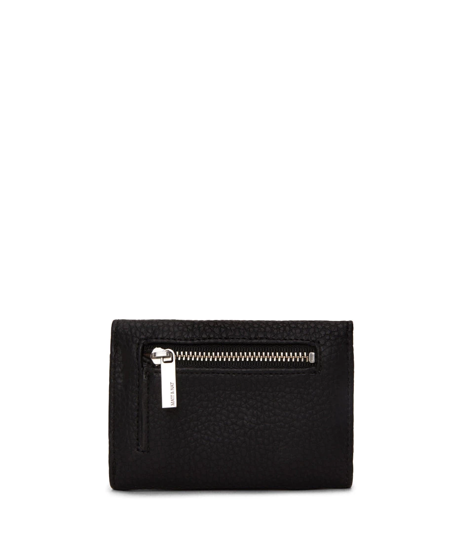 Mini wallet with front credit card pocket with flap closure, back bill compartment that opens flat, and exterior back zippered coin pocket.
