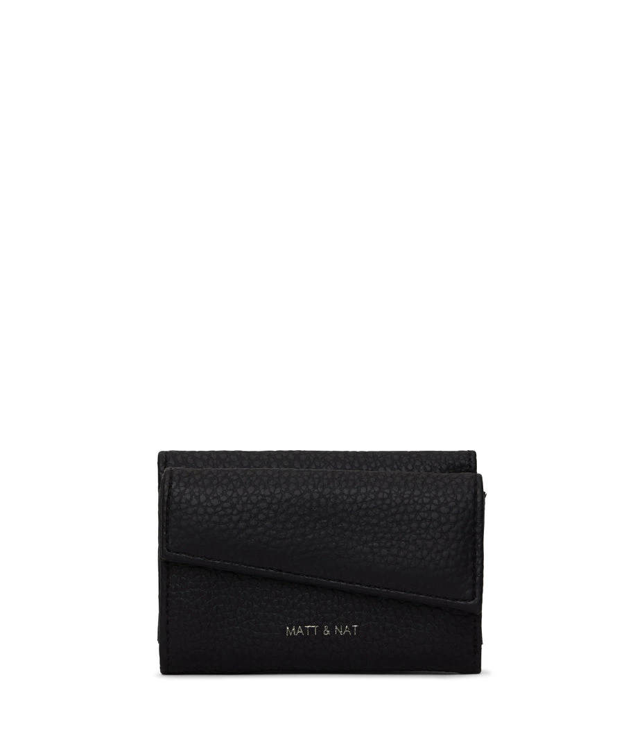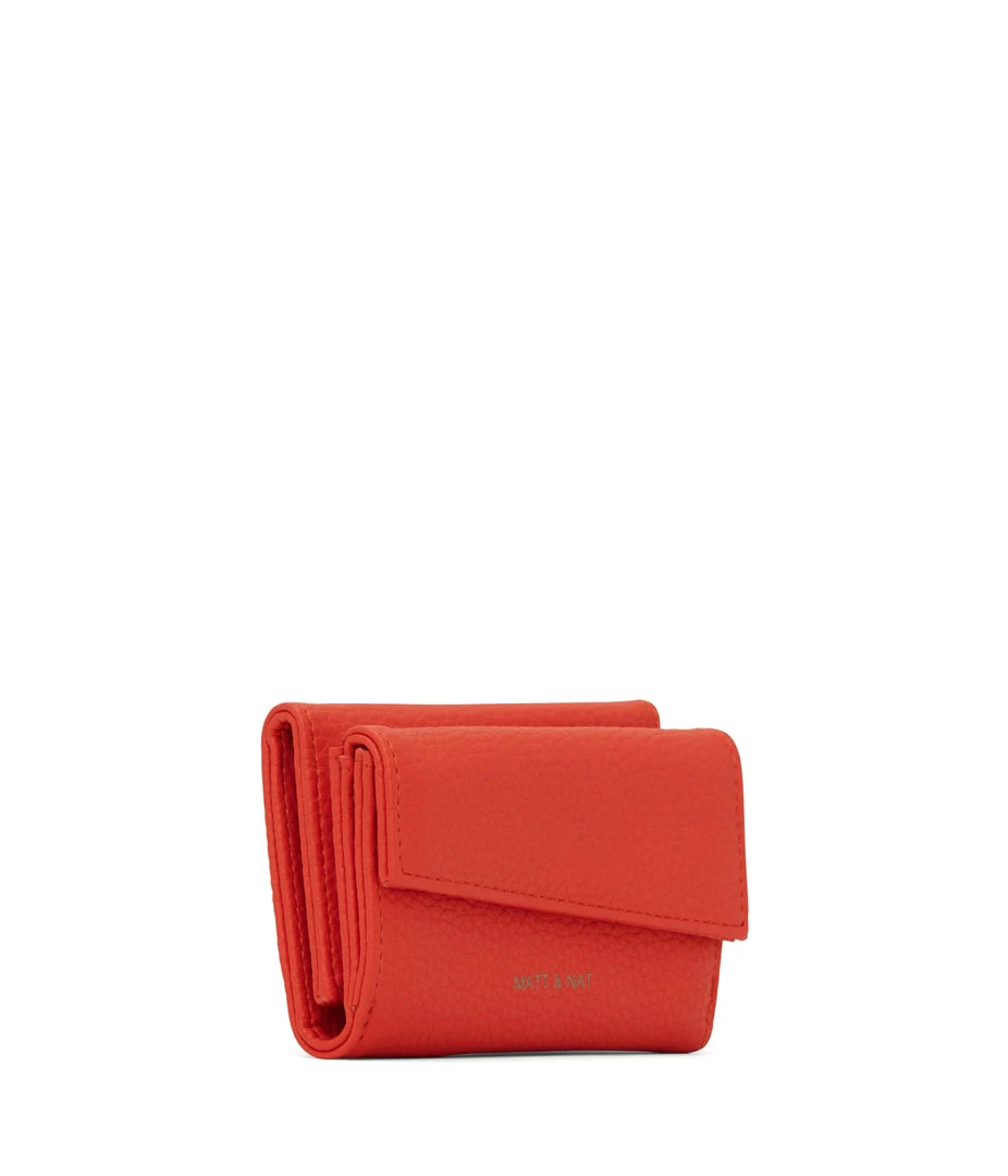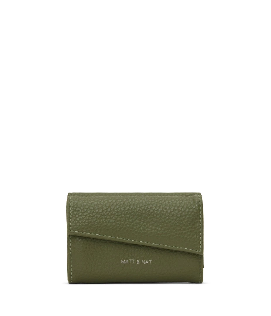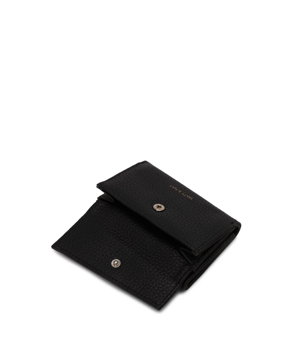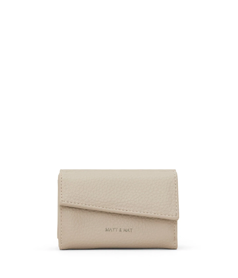 Mini wallet with front credit card pocket with flap closure, back bill compartment that opens flat, and exterior back zippered coin pocket.