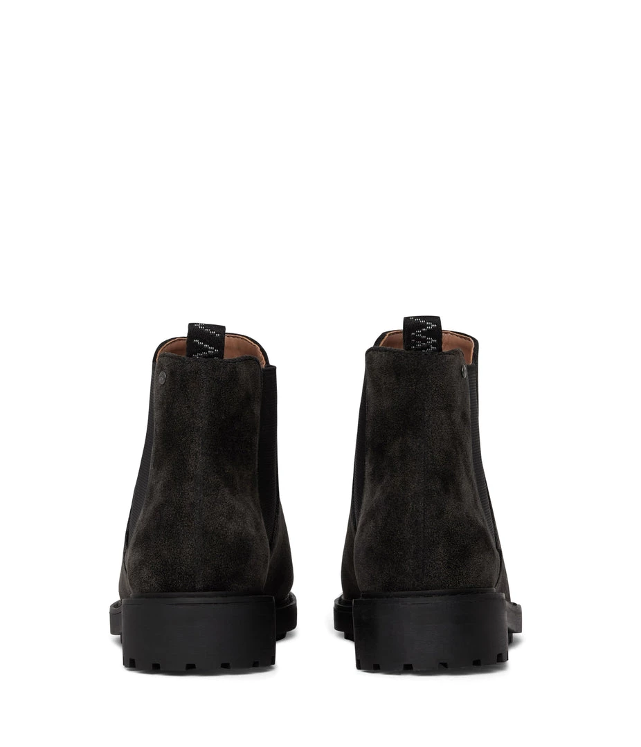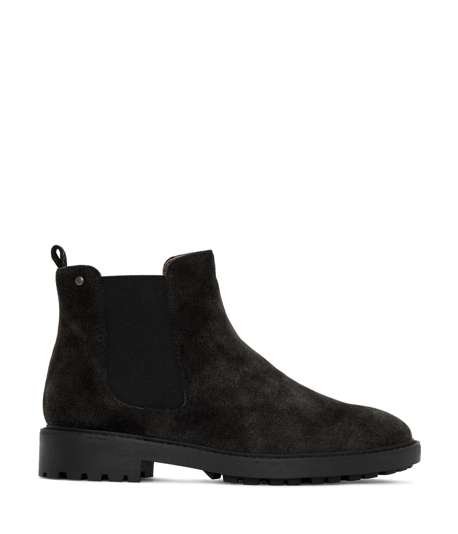 Women’s faux suede Chelsea boot with elastic gore and MN rivet detail.