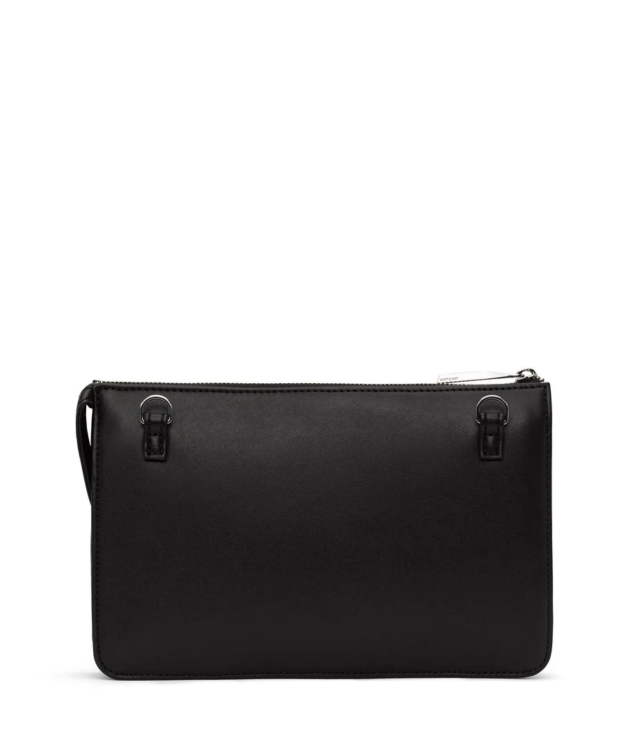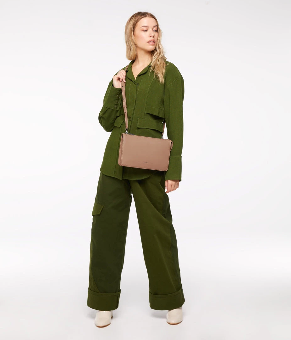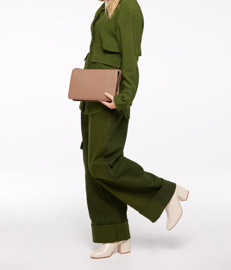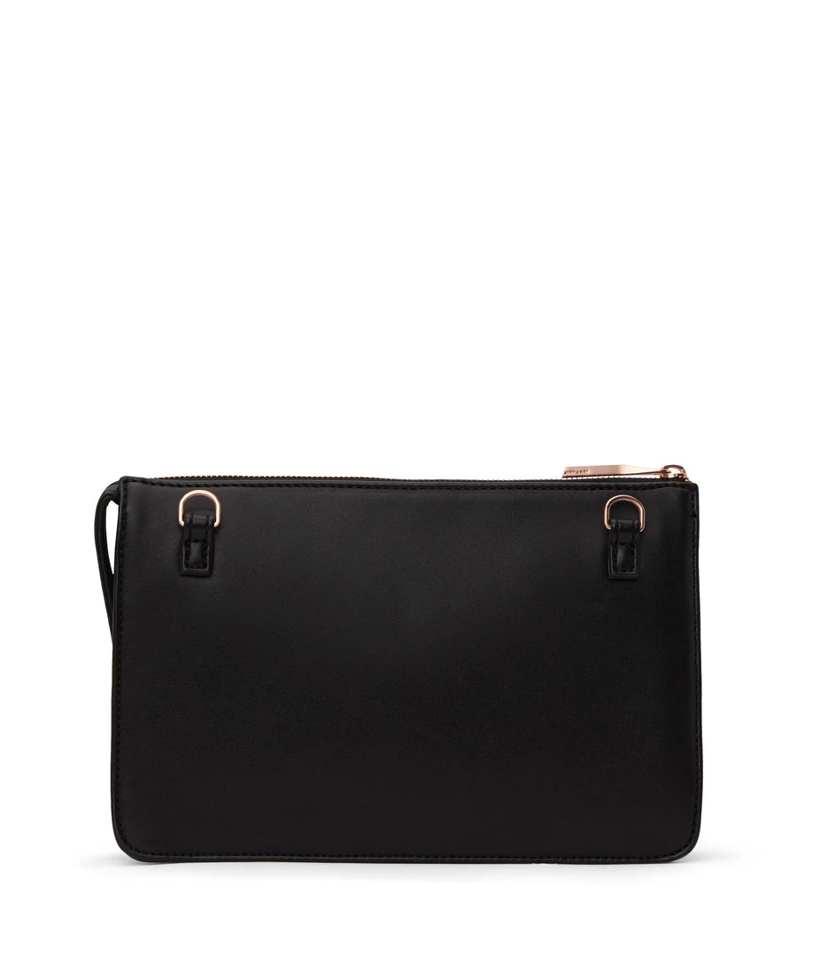 Crossbody bag that can be converted into a clutch with a detachable and adjustable shoulder strap. Top zipper closure with extension and side snap detail.