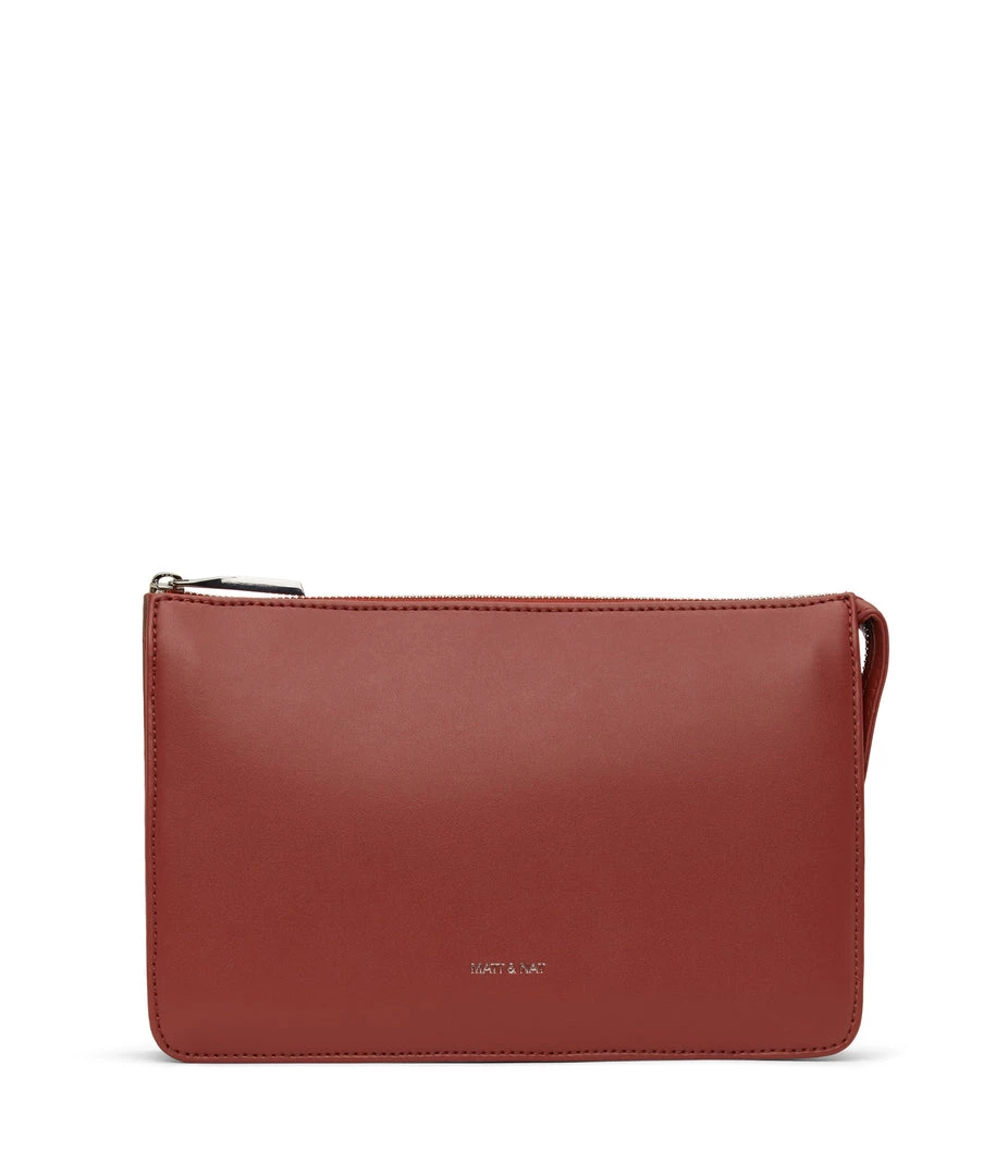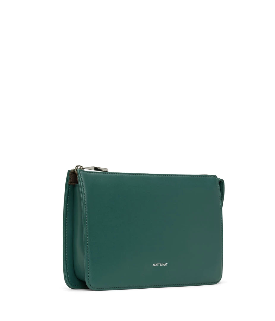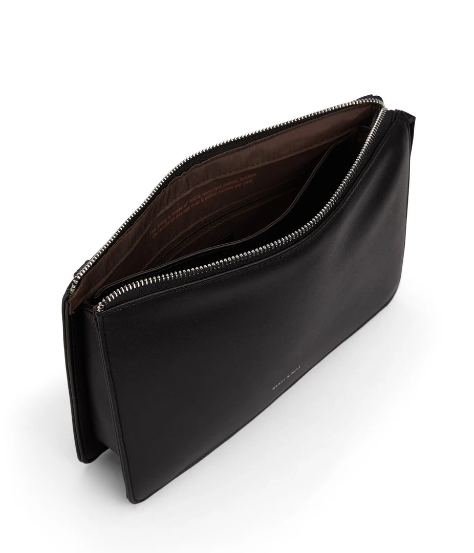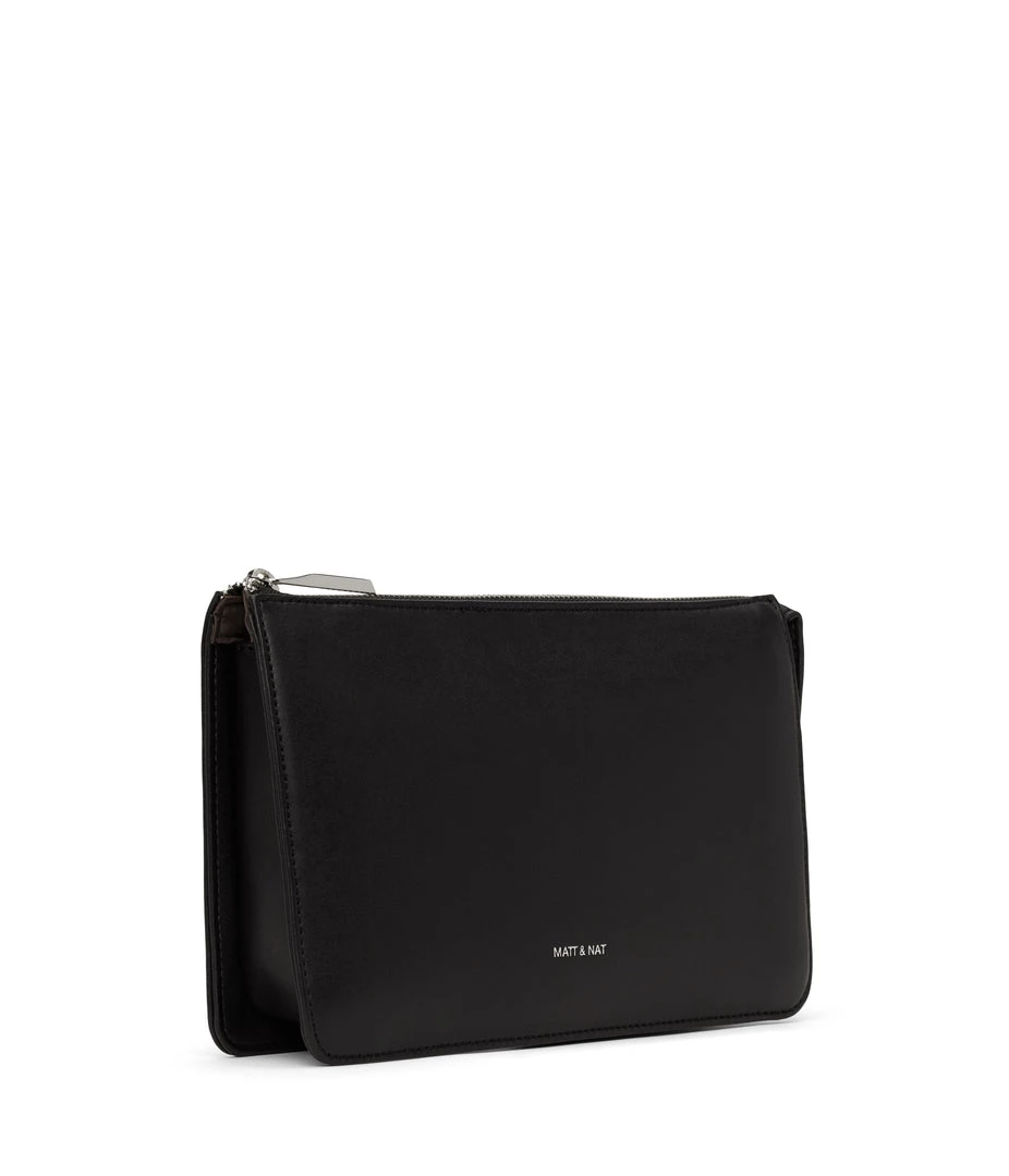 Crossbody bag that can be converted into a clutch with a detachable and adjustable shoulder strap. Top zipper closure with extension and side snap detail.