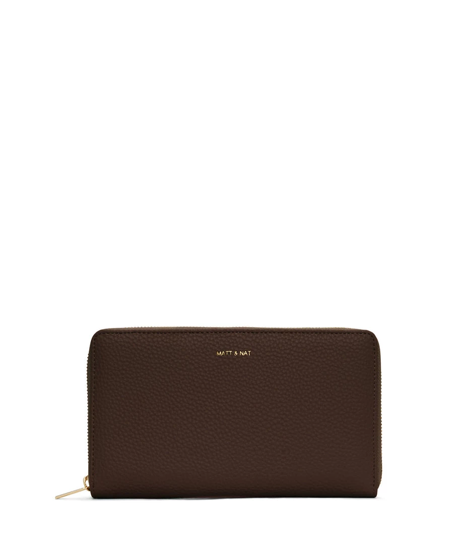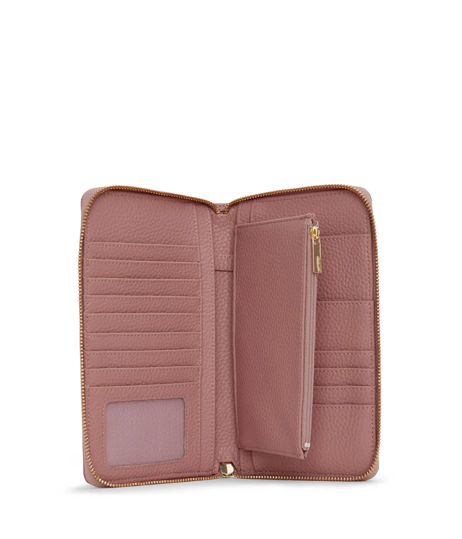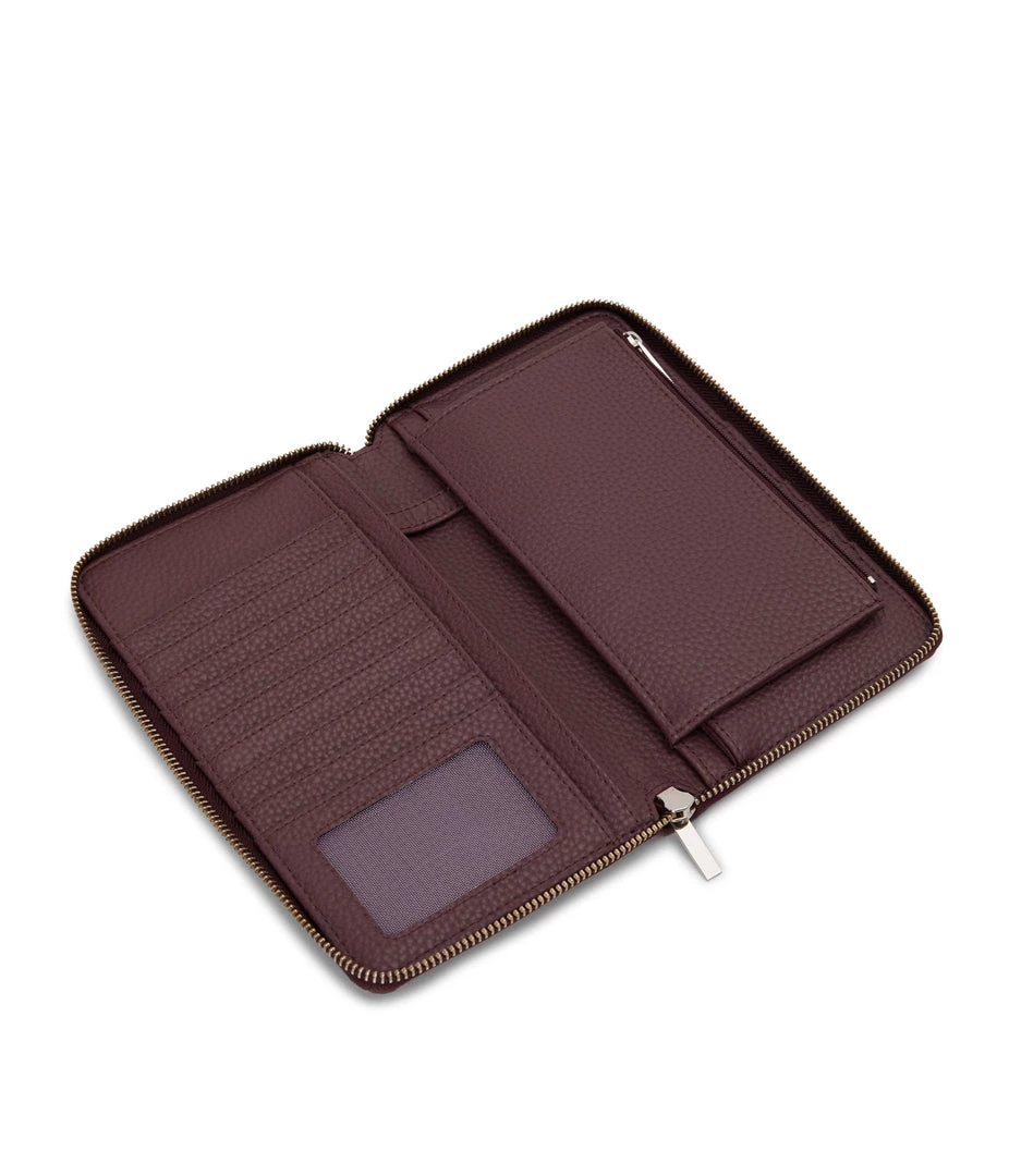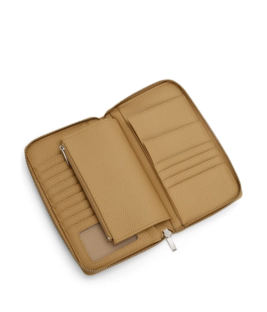 - Interior: 13 card slots, 3 bill compartments, passport slot, chequebook slot, zipper coin pouch.