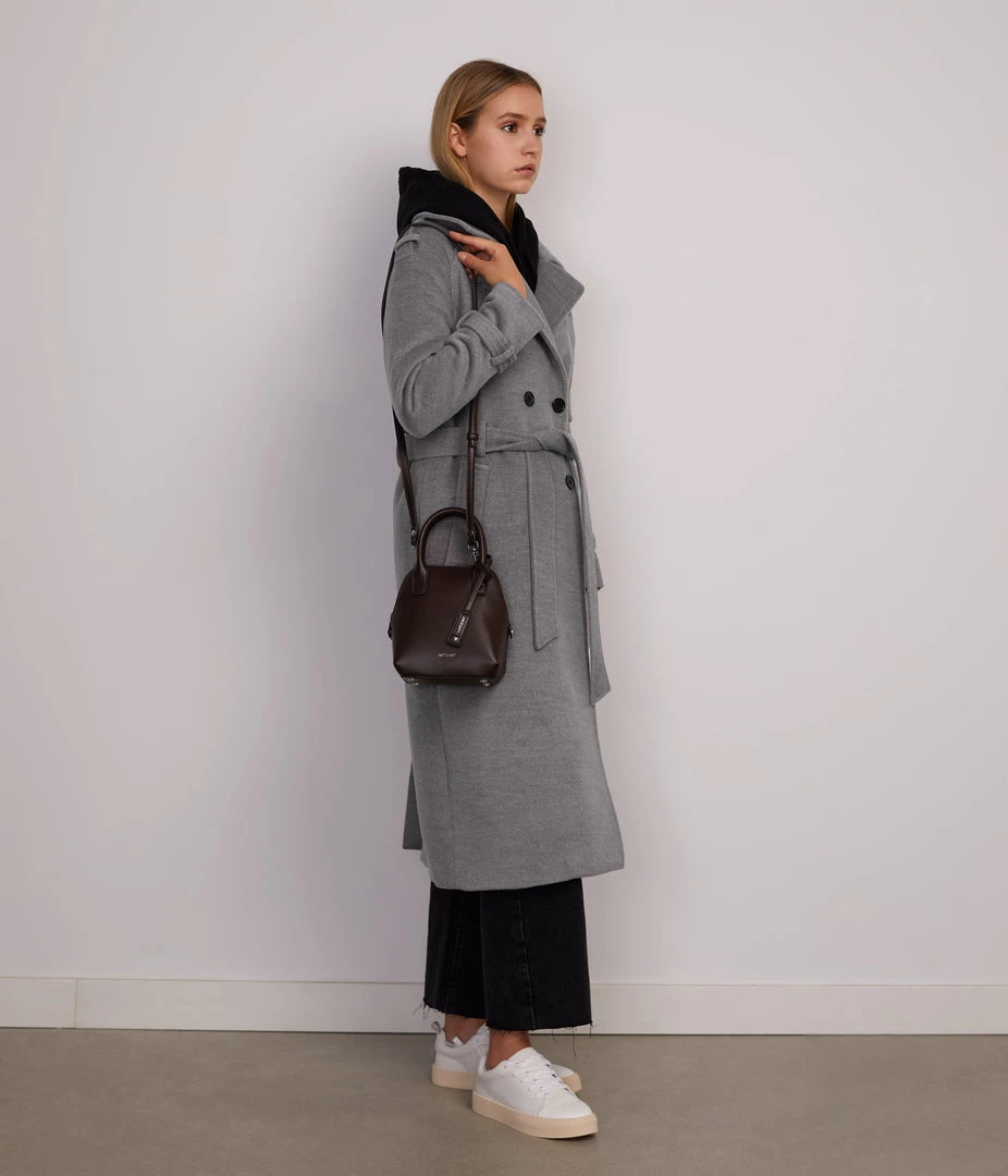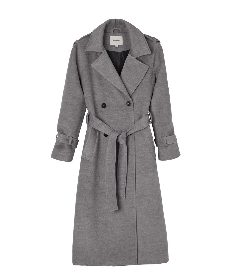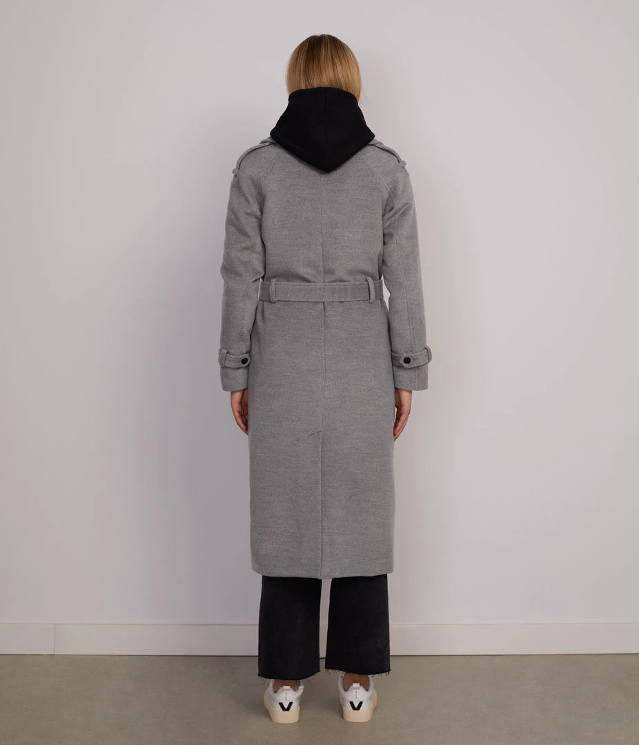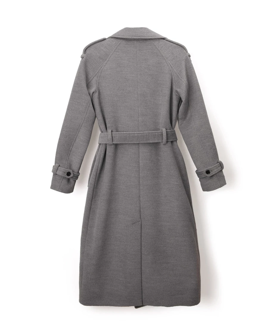 Double-breasted long coat with self-tie belt, belted sleeve cuff detail, large shoulder tabs, welt pockets, center-back vent, and internal chest pocket.