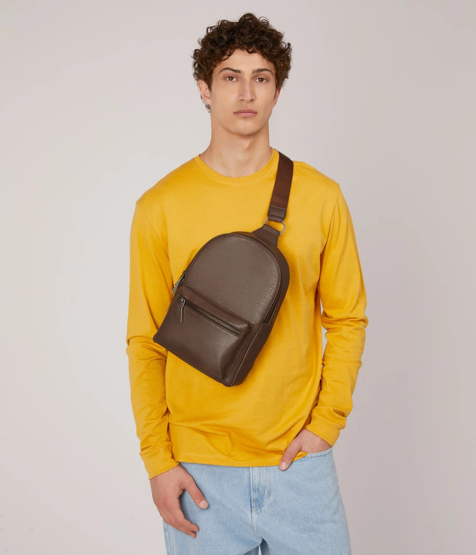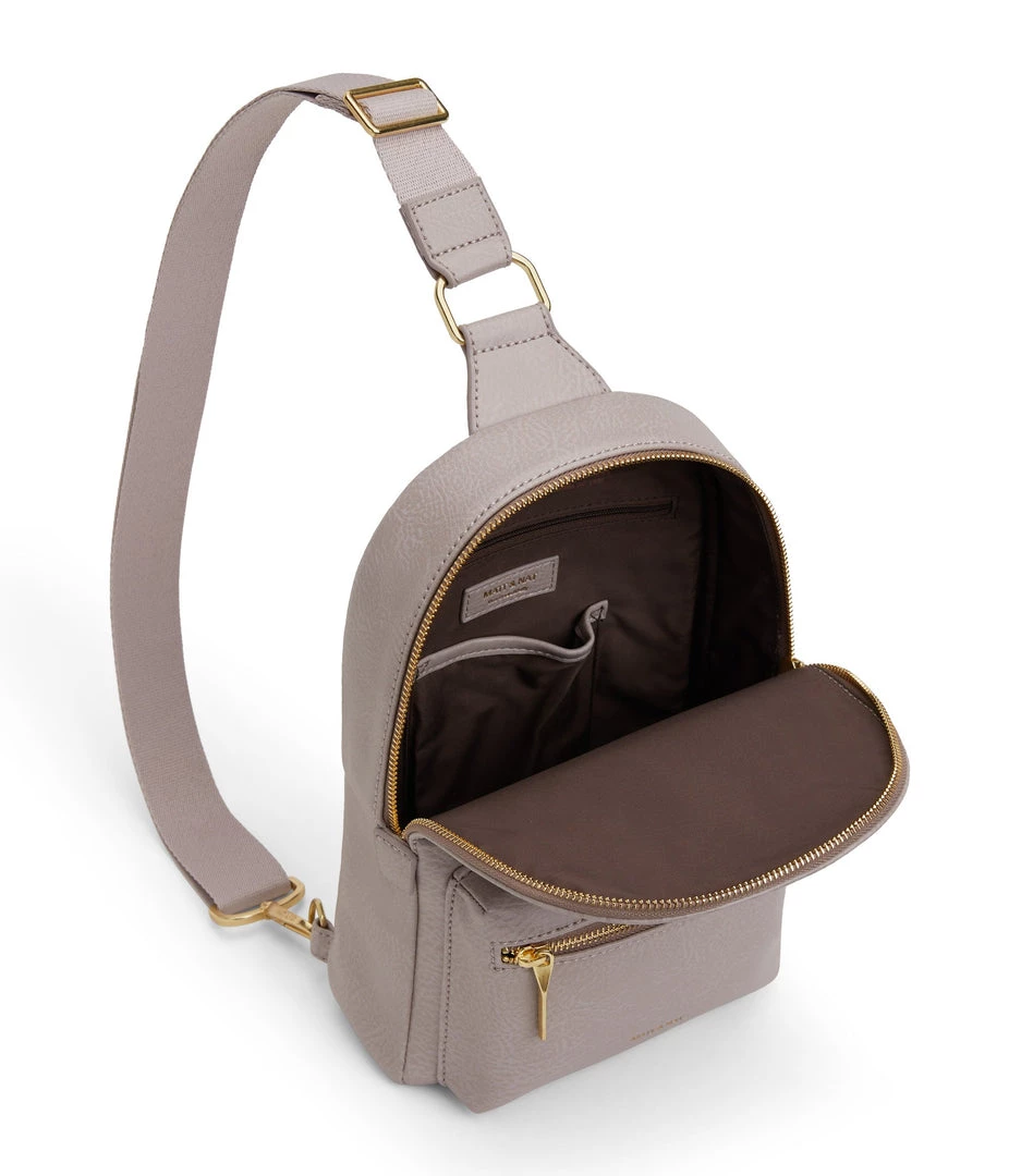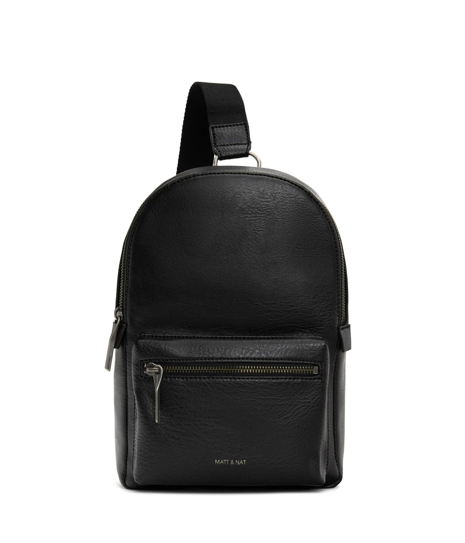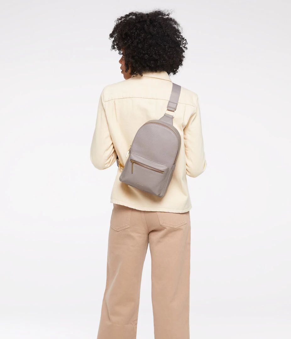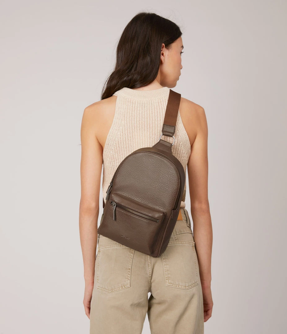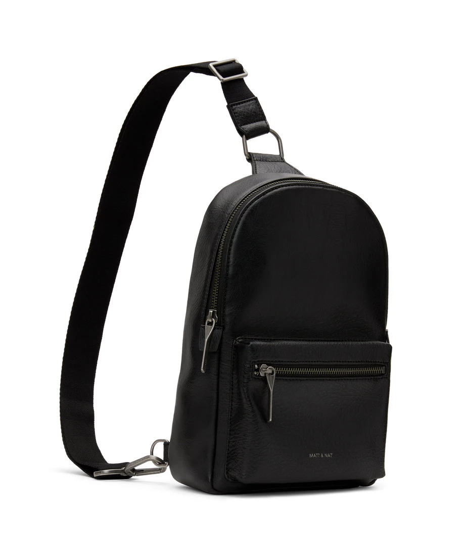 Sling bag with metal zip closure and an adjustable webbing strap that unhooks at the bottom for easier wear. Front gusseted pocket with metal zip closure.