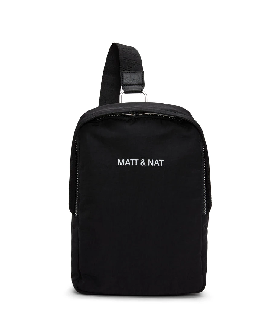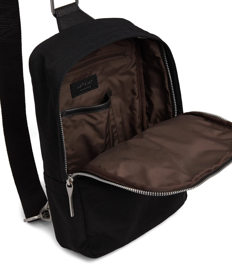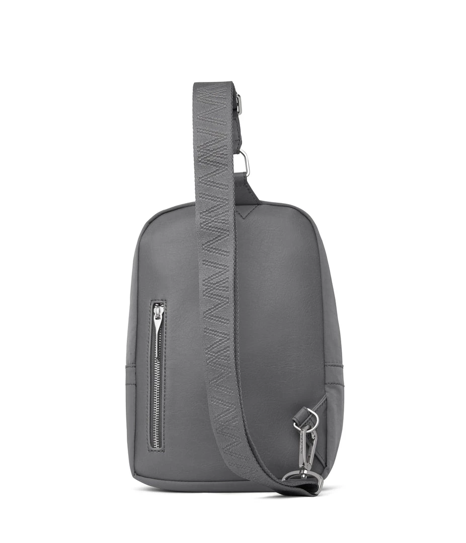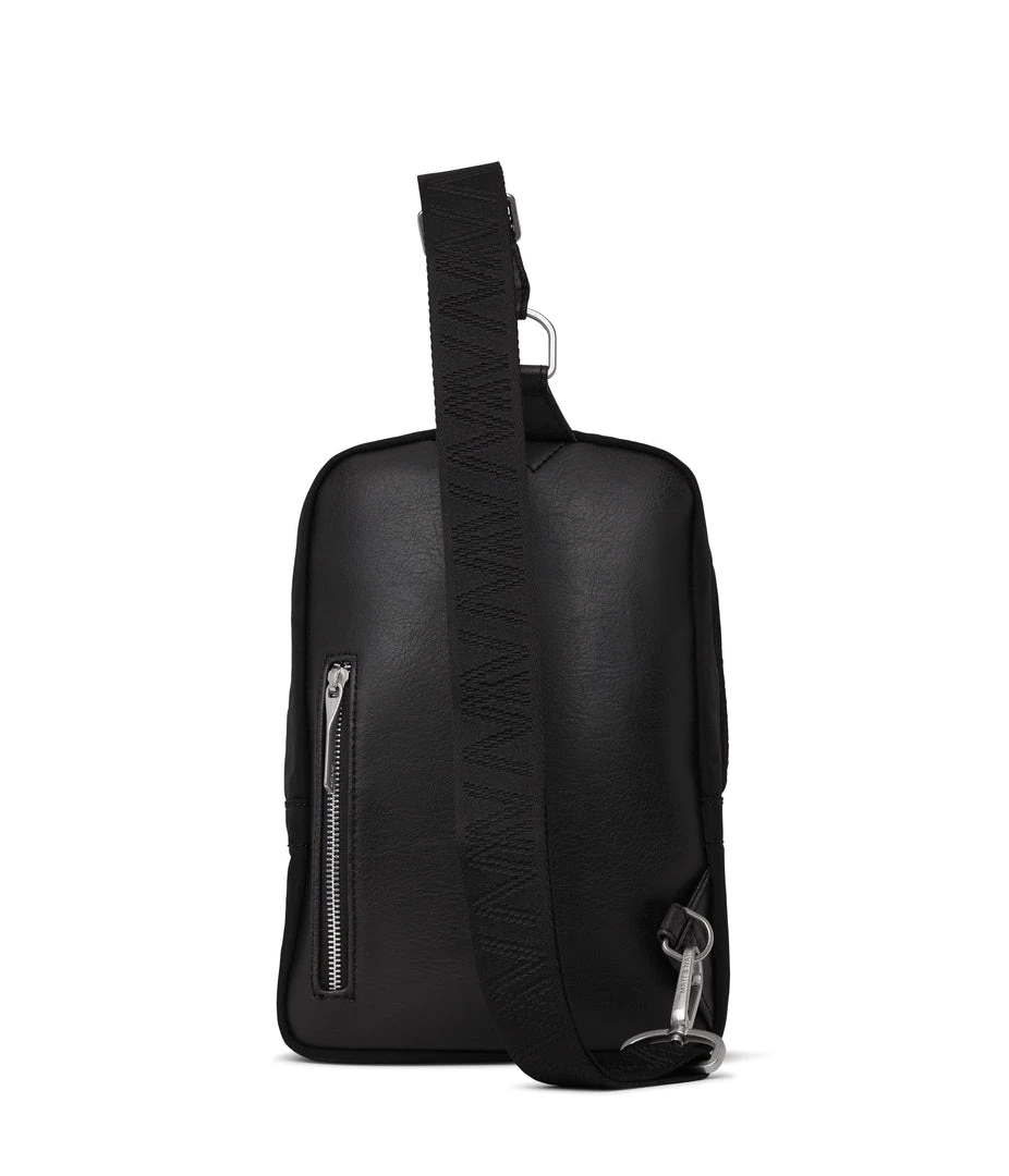 Sling bag with concealed two-way zipper closure, zipper pocket at exterior back, and an adjustable webbing strap which unhooks at the bottom for easier wear.